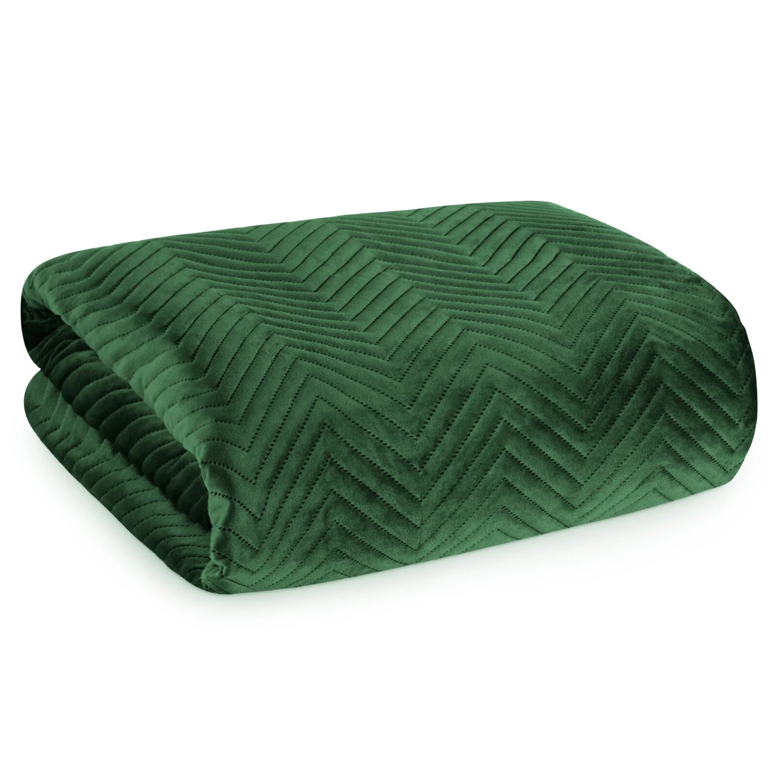 Ekskluzywna narzuta na łóżko z miękkiego i przyjemnego w dotyku welwetu pikowanego w dużą, gęstą jodełką. Do pikowania wykorzystano metodę bezszwową hotpress. szerokość: 220 cm, długość: 240 cm, kolor: ciemnozielony, Gramatura: 250+120+65 GSM, Skład: 100% poliester