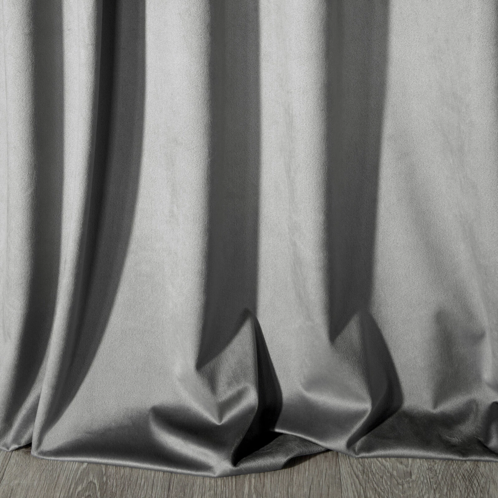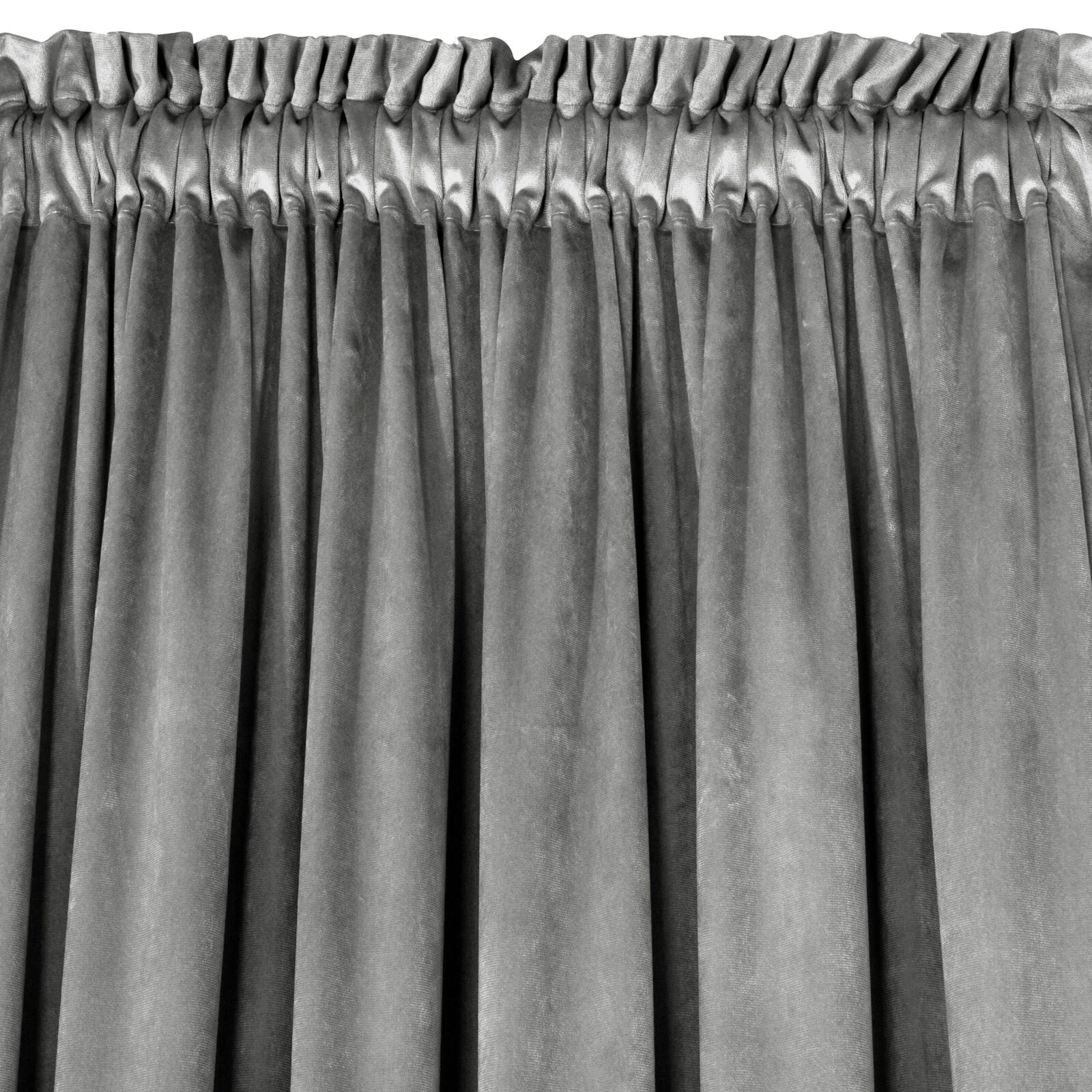Miękka zasłona gotowa z jednokolorowego aksamitu o charakterystycznym dla welwetu połysku. Mięsista tkanina daje wysoki stopień zaciemnienia wnętrza. szerokość: 140 cm, długość: 300 cm, kolor: szary, Gramatura: 215 GSM, Skład: 100% poliester