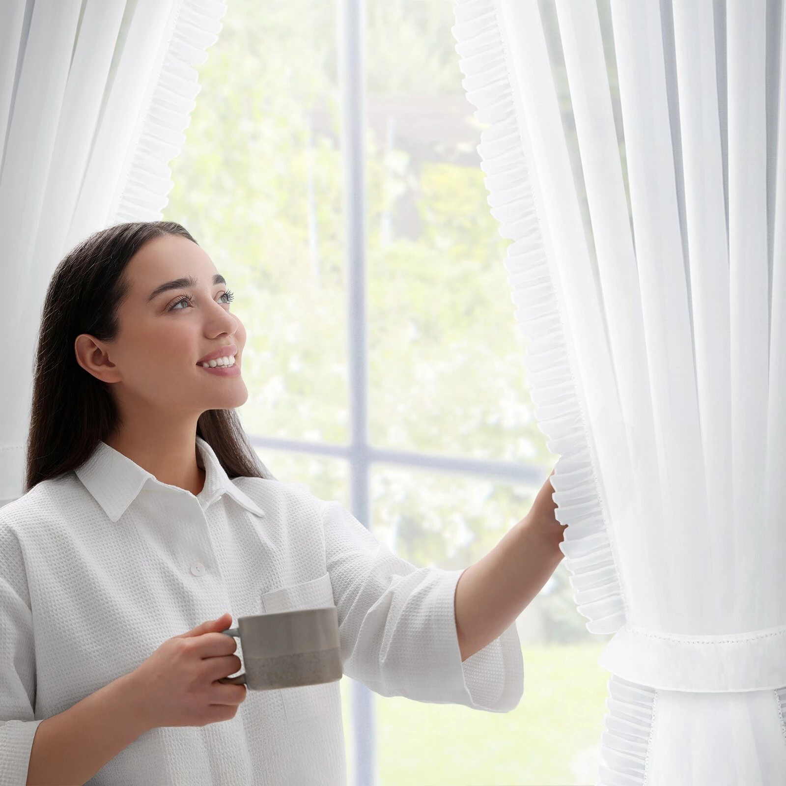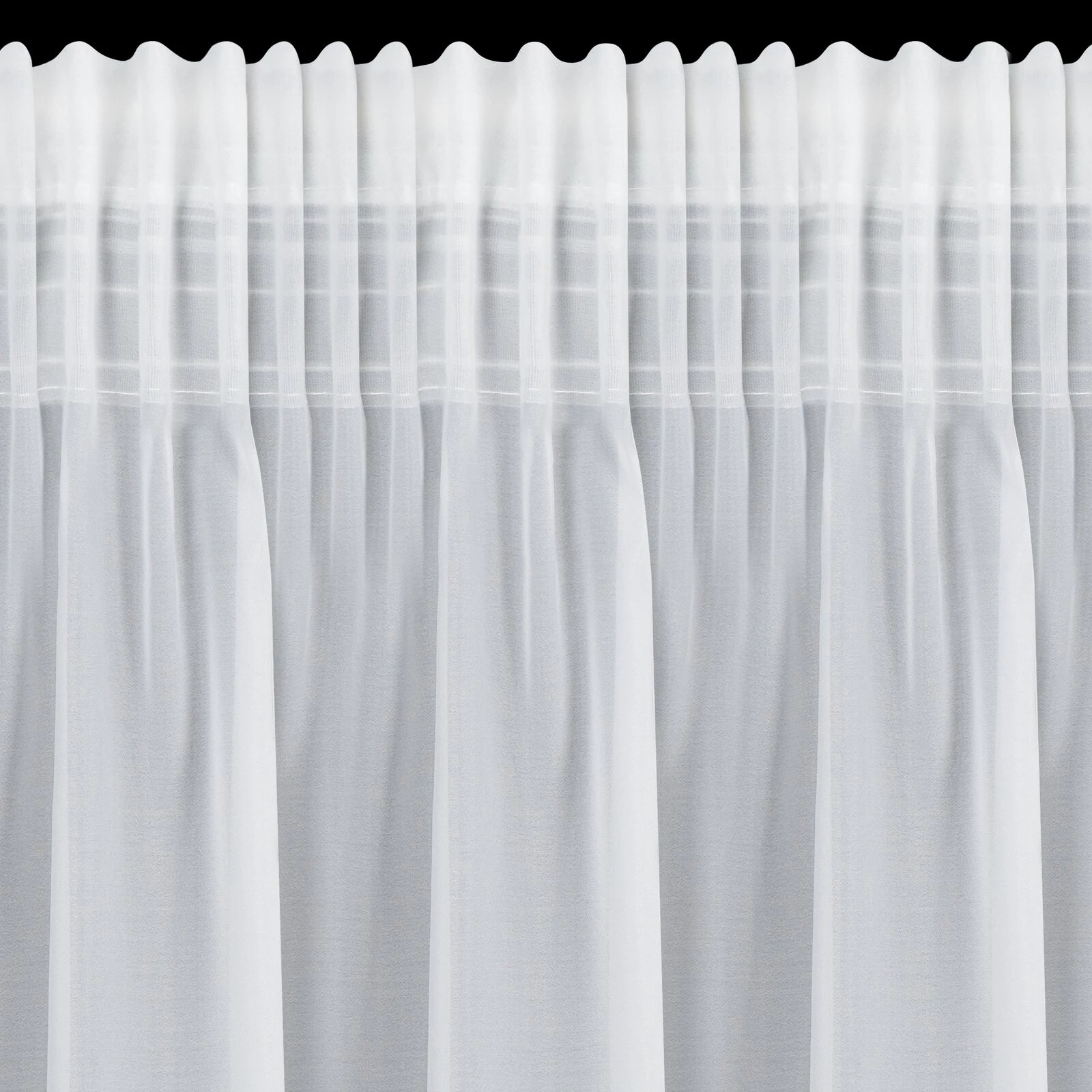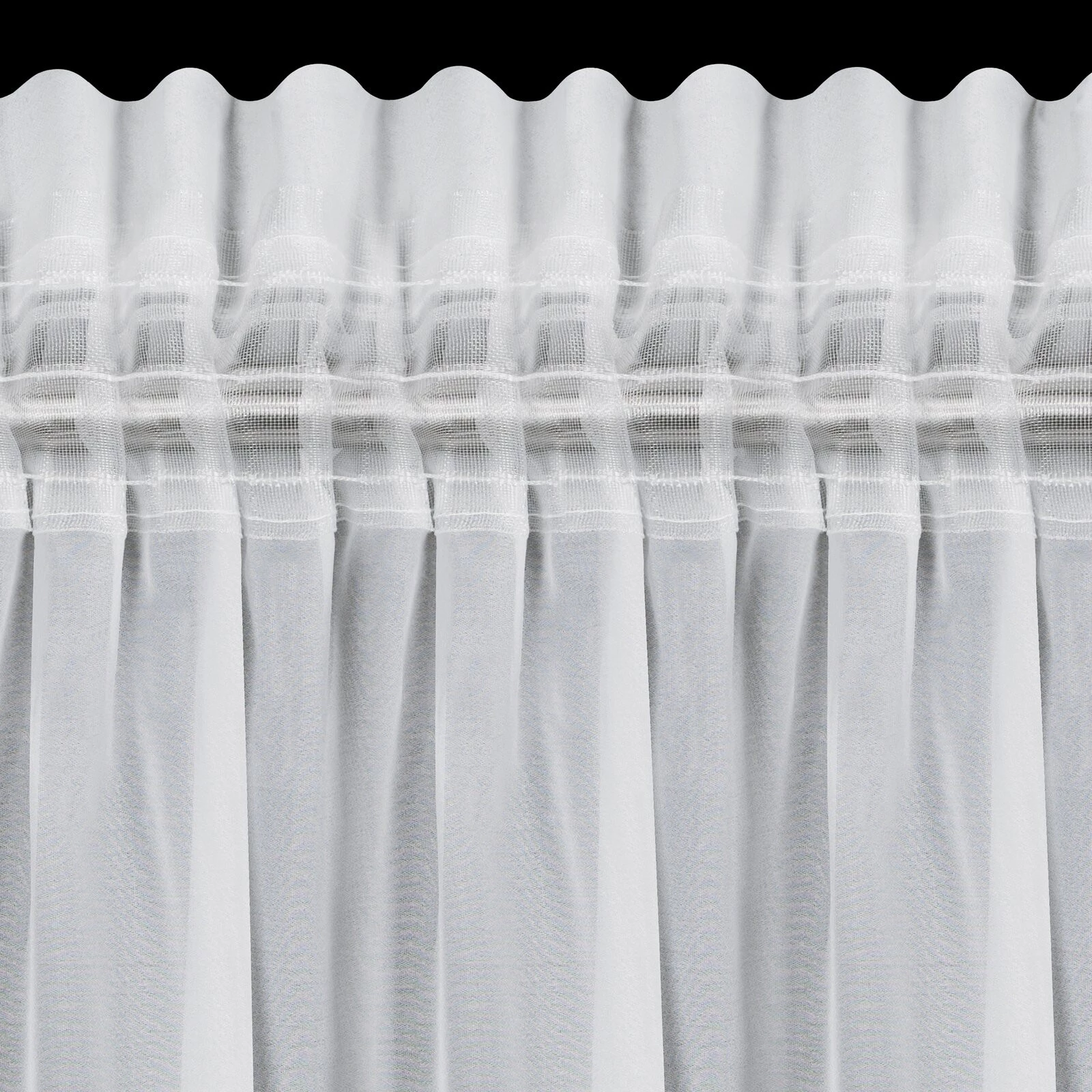 - Firana gotowa zdobiona po bokach falbankami z dekoracyjnym troczkiem szerokość: 140 cm, długość: 270 cm, kolor: biały, Gramatura: 40 GSM, Skład: 100% poliester