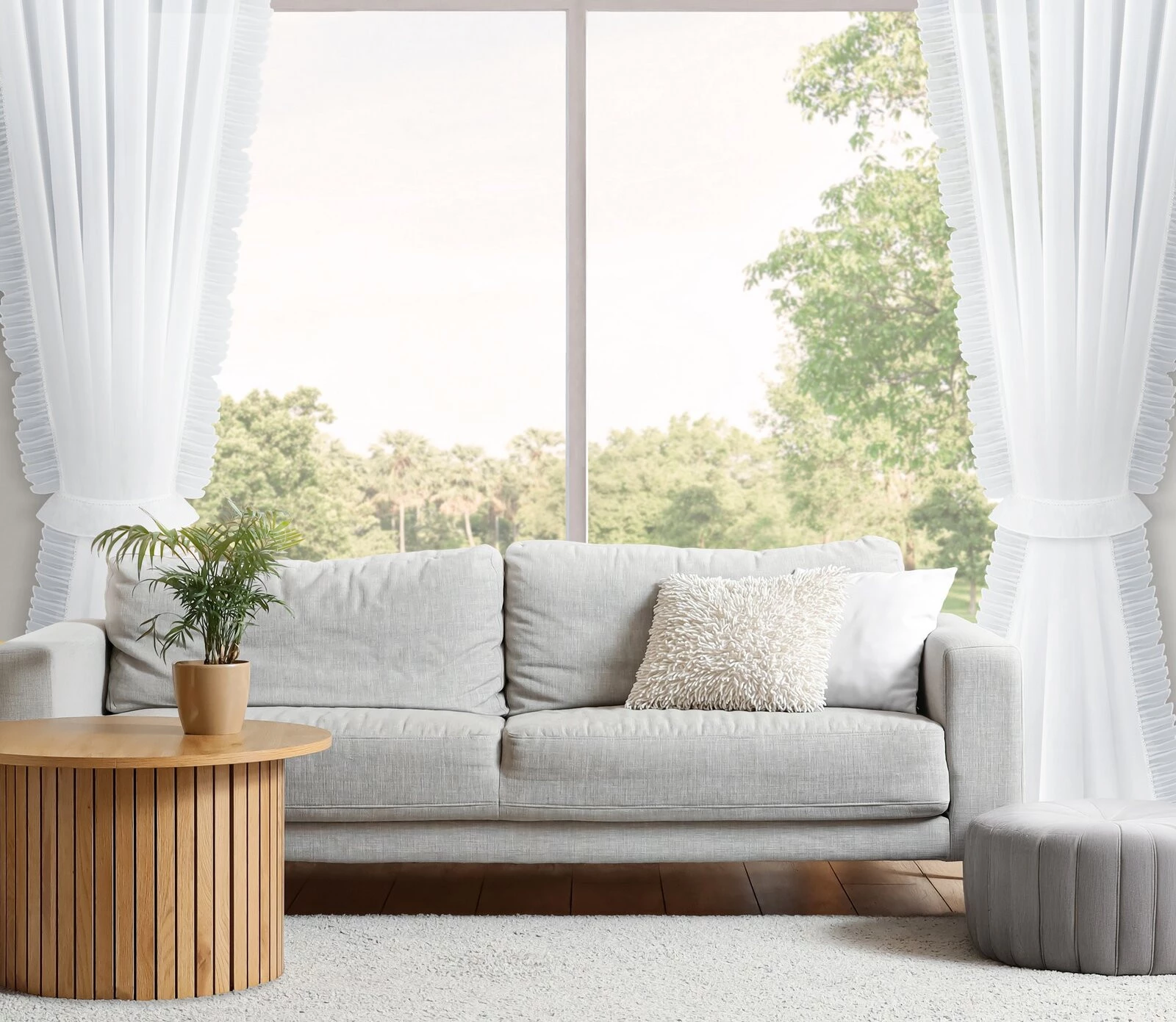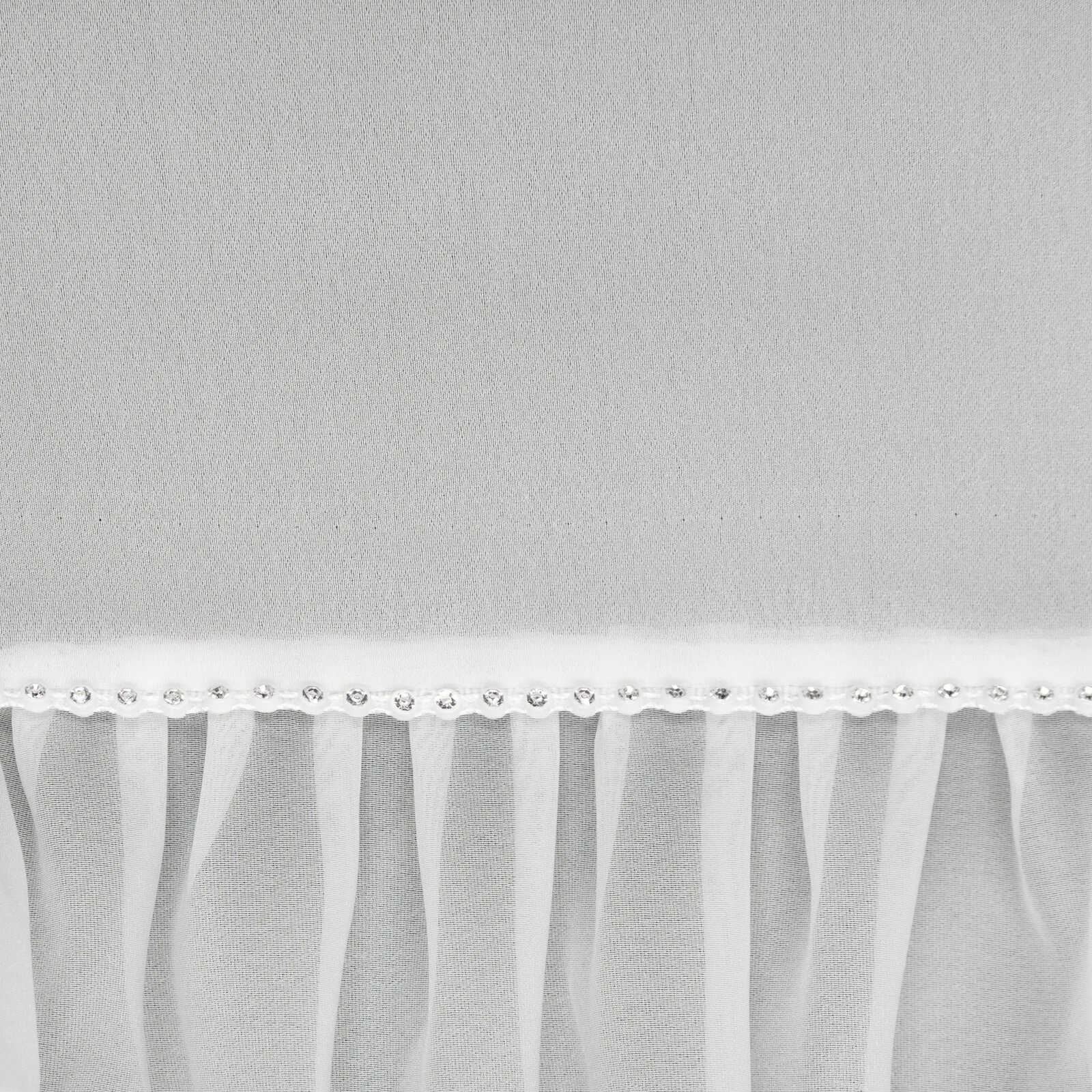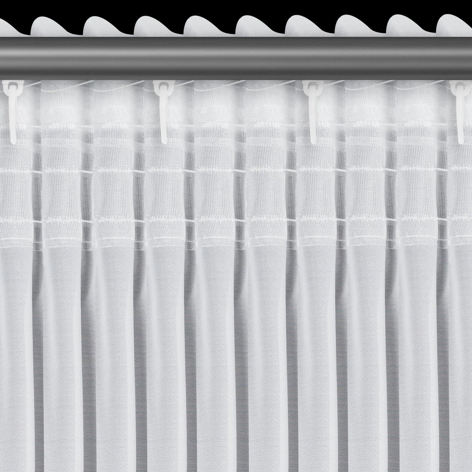 - Firana gotowa zdobiona po bokach falbankami z dekoracyjnym troczkiem szerokość: 140 cm, długość: 270 cm, kolor: biały, Gramatura: 40 GSM, Skład: 100% poliester
