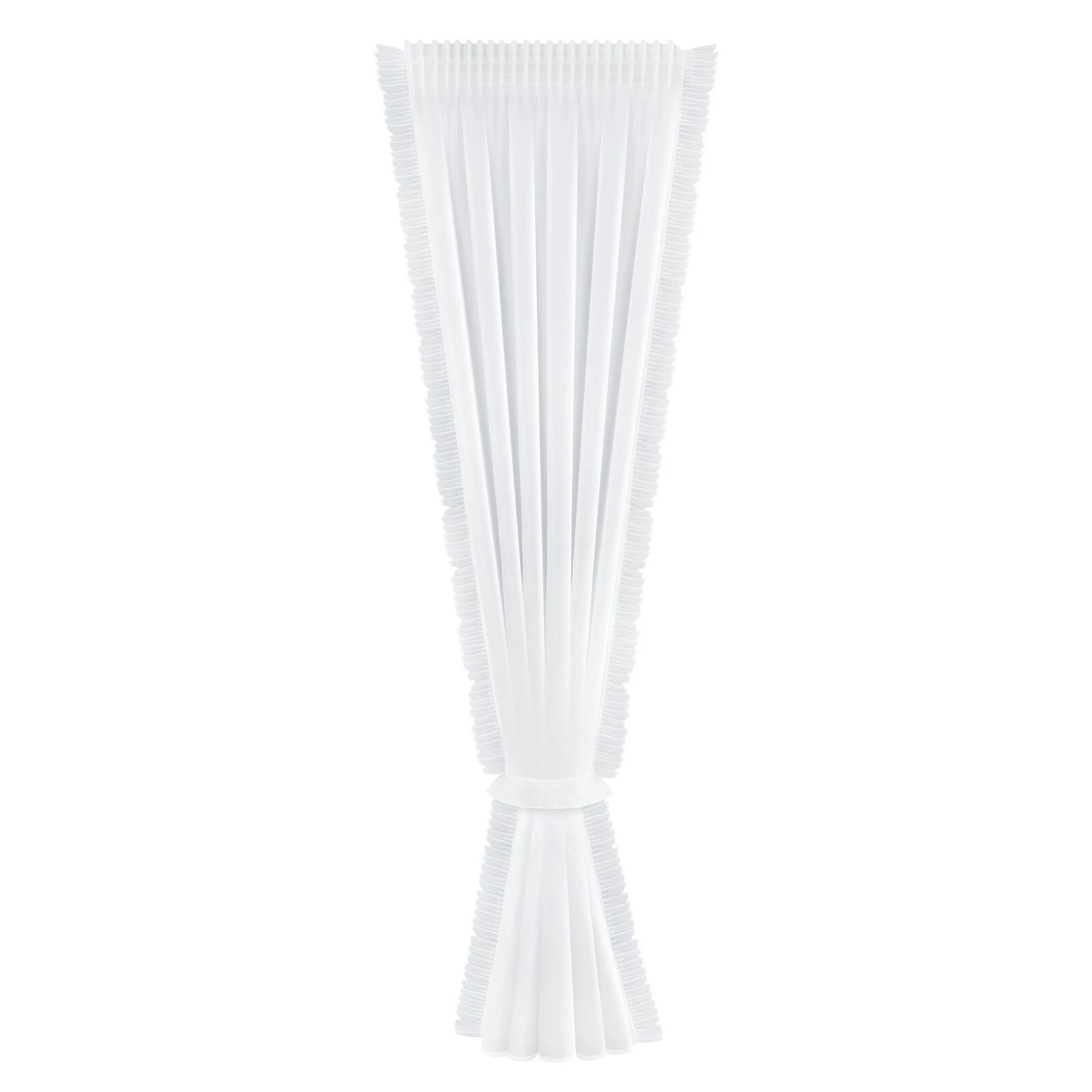 Firana gotowa zdobiona po bokach falbankami z dekoracyjnym troczkiem szerokość: 140 cm, długość: 270 cm, kolor: biały, Gramatura: 40 GSM, Skład: 100% poliester