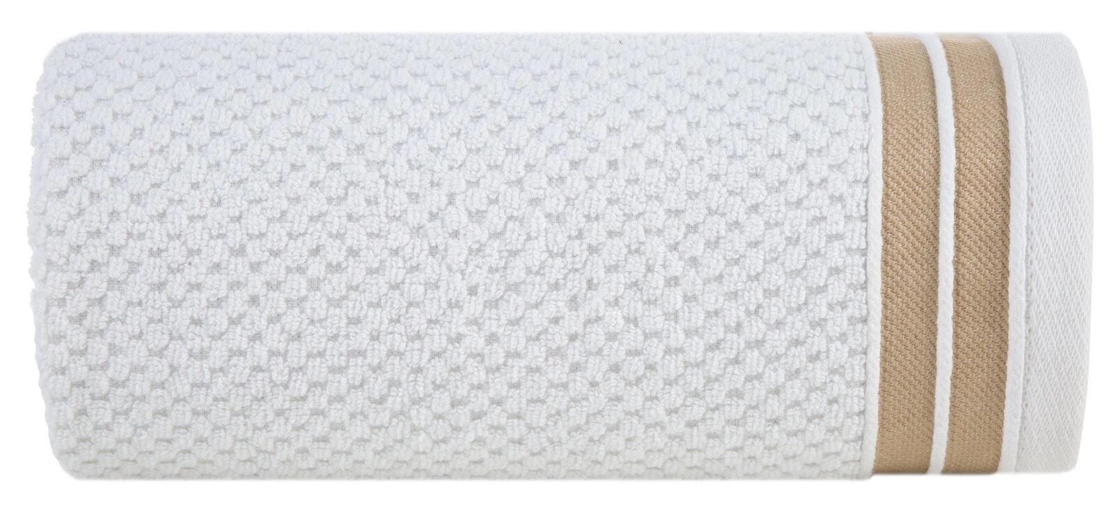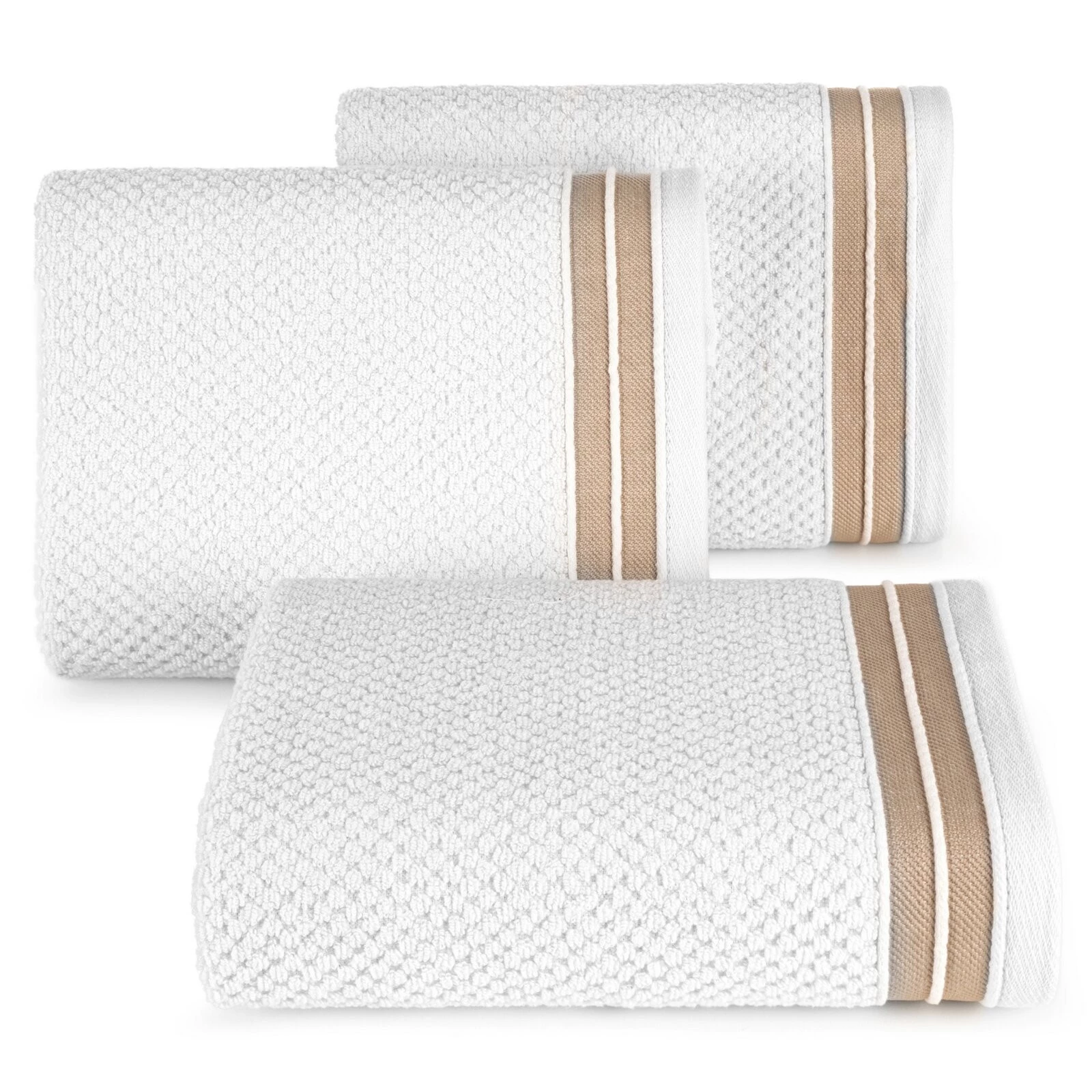 Jednobarwny ręcznik z miękkiej i chłonnej tkaniny bawełnianej o splocie frotte zdobiony kolorową bordiurą w stylu fastrygi. Łatwy w praniu, nie farbuje. szerokość: 50 cm, długość: 90 cm, kolor: biały, Gramatura: 500 GSM, Skład: 100% bawełna; część ozdobna: 80% poliester, 20% bawełna