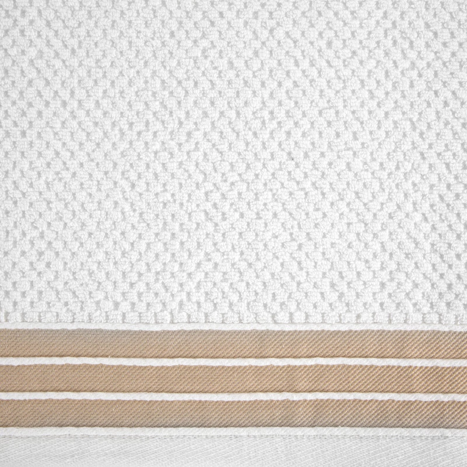 Jednobarwny ręcznik z miękkiej i chłonnej tkaniny bawełnianej o splocie frotte zdobiony kolorową bordiurą w stylu fastrygi. Łatwy w praniu, nie farbuje. szerokość: 70 cm, długość: 140 cm, kolor: biały, Gramatura: 500 GSM, Skład: 100% bawełna; część ozdobna: 80% poliester, 20% bawełna