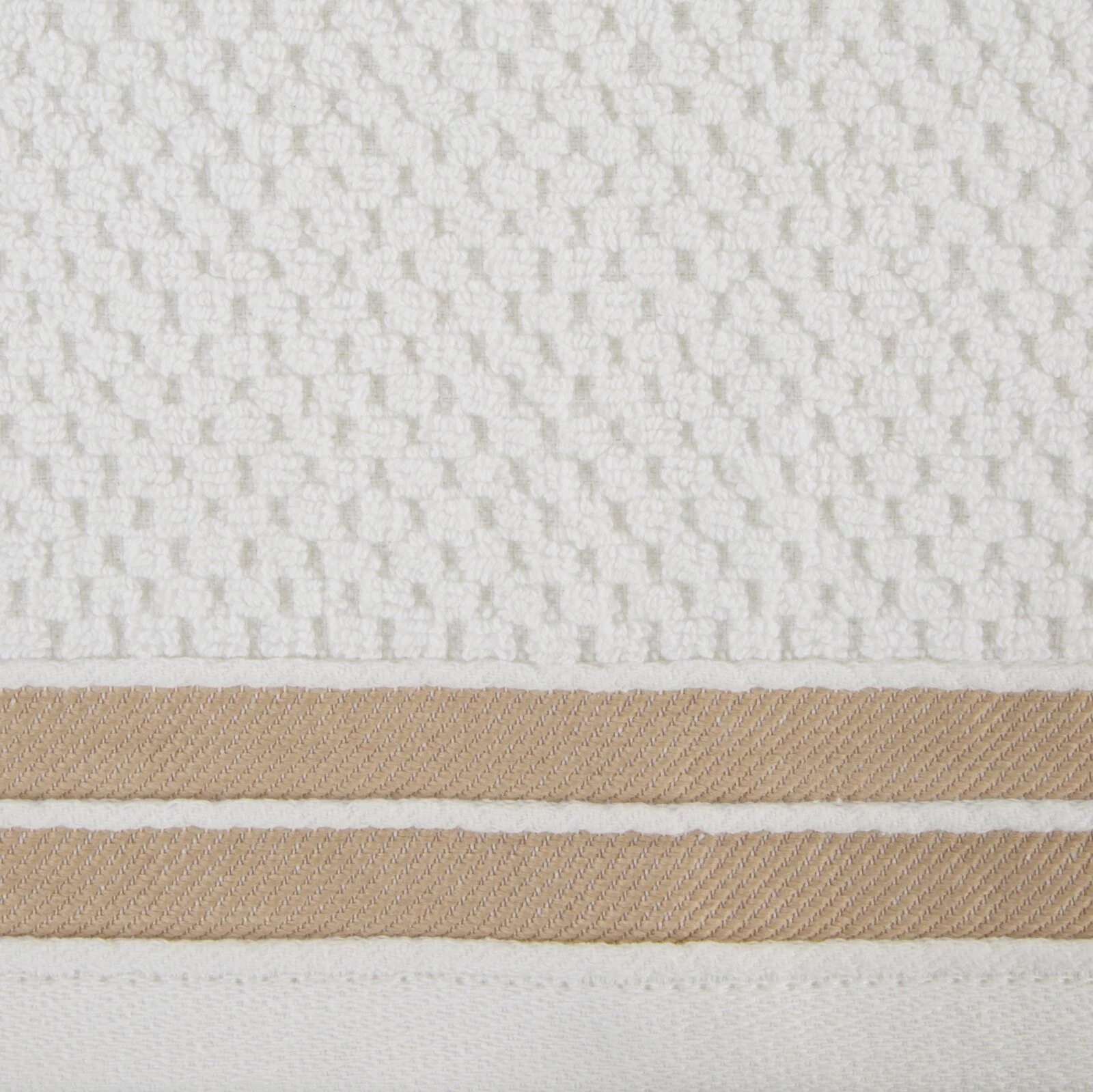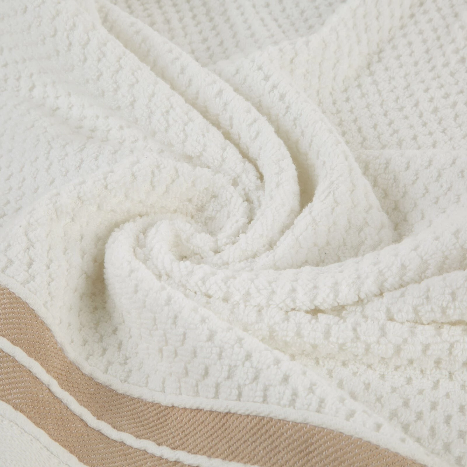 Jednobarwny ręcznik z miękkiej i chłonnej tkaniny bawełnianej o splocie frotte zdobiony kolorową bordiurą w stylu fastrygi. Łatwy w praniu, nie farbuje. szerokość: 50 cm, długość: 90 cm, kolor: kremowy, Gramatura: 500 GSM, Skład: 100% bawełna; część ozdobna: 80% poliester, 20% bawełna