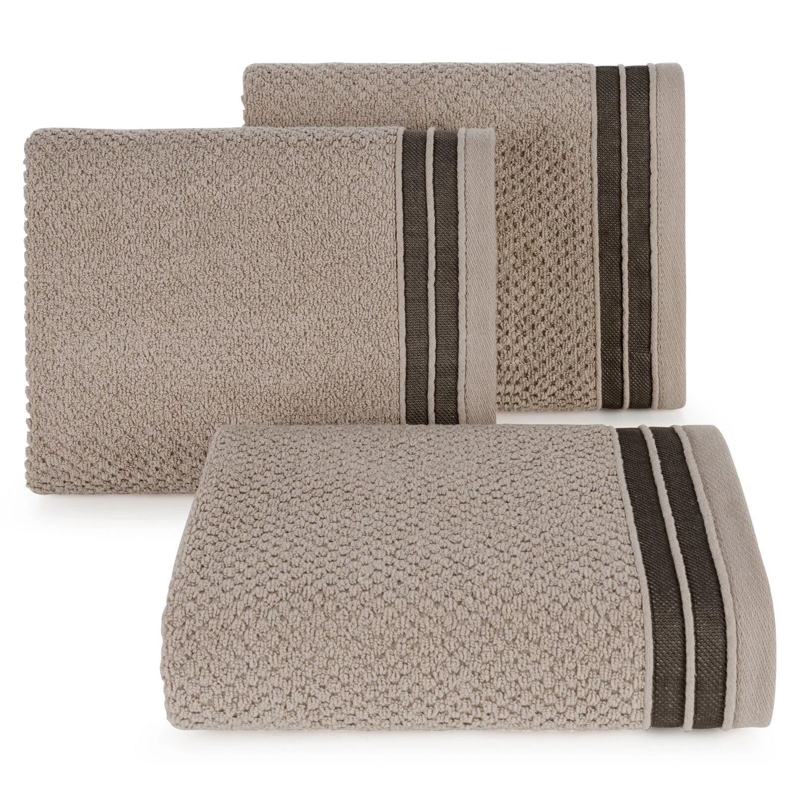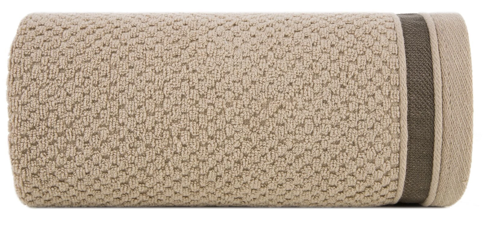 Jednobarwny ręcznik z miękkiej i chłonnej tkaniny bawełnianej o splocie frotte zdobiony kolorową bordiurą w stylu fastrygi. Łatwy w praniu, nie farbuje. szerokość: 30 cm, długość: 50 cm, kolor: beżowy, Gramatura: 500 GSM, Skład: 100% bawełna; część ozdobna: 80% poliester, 20% bawełna