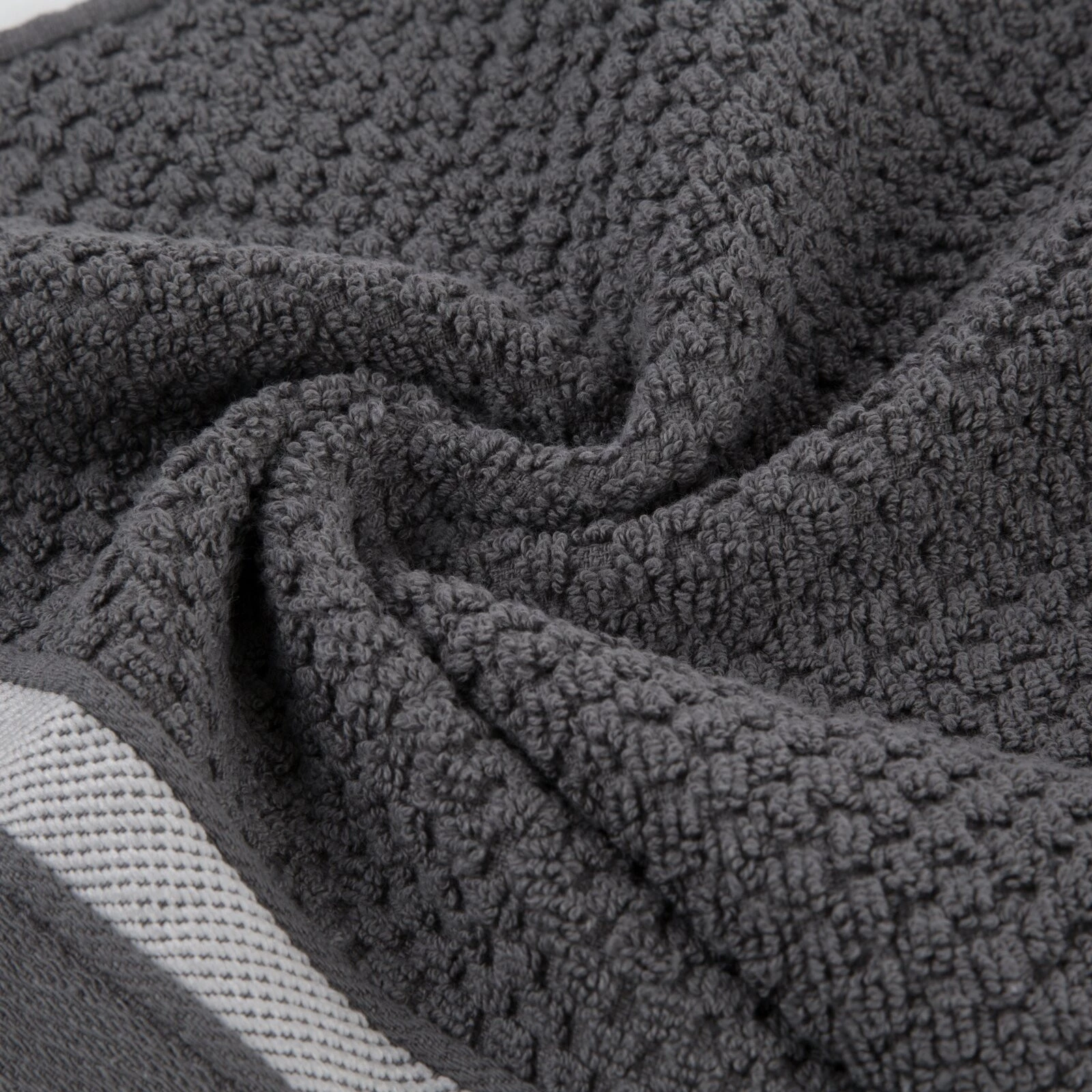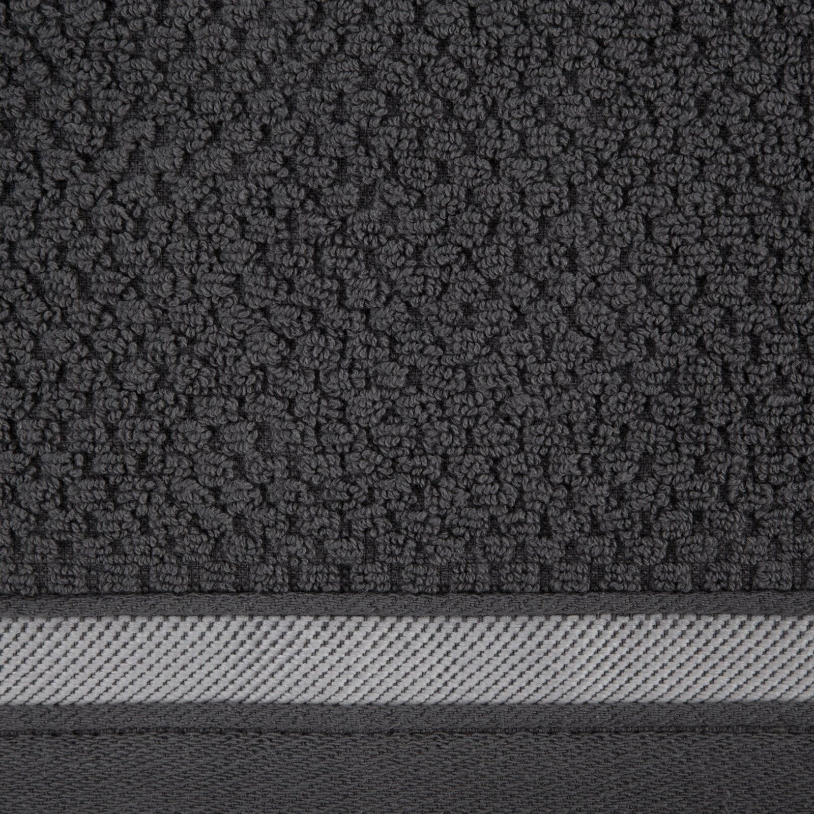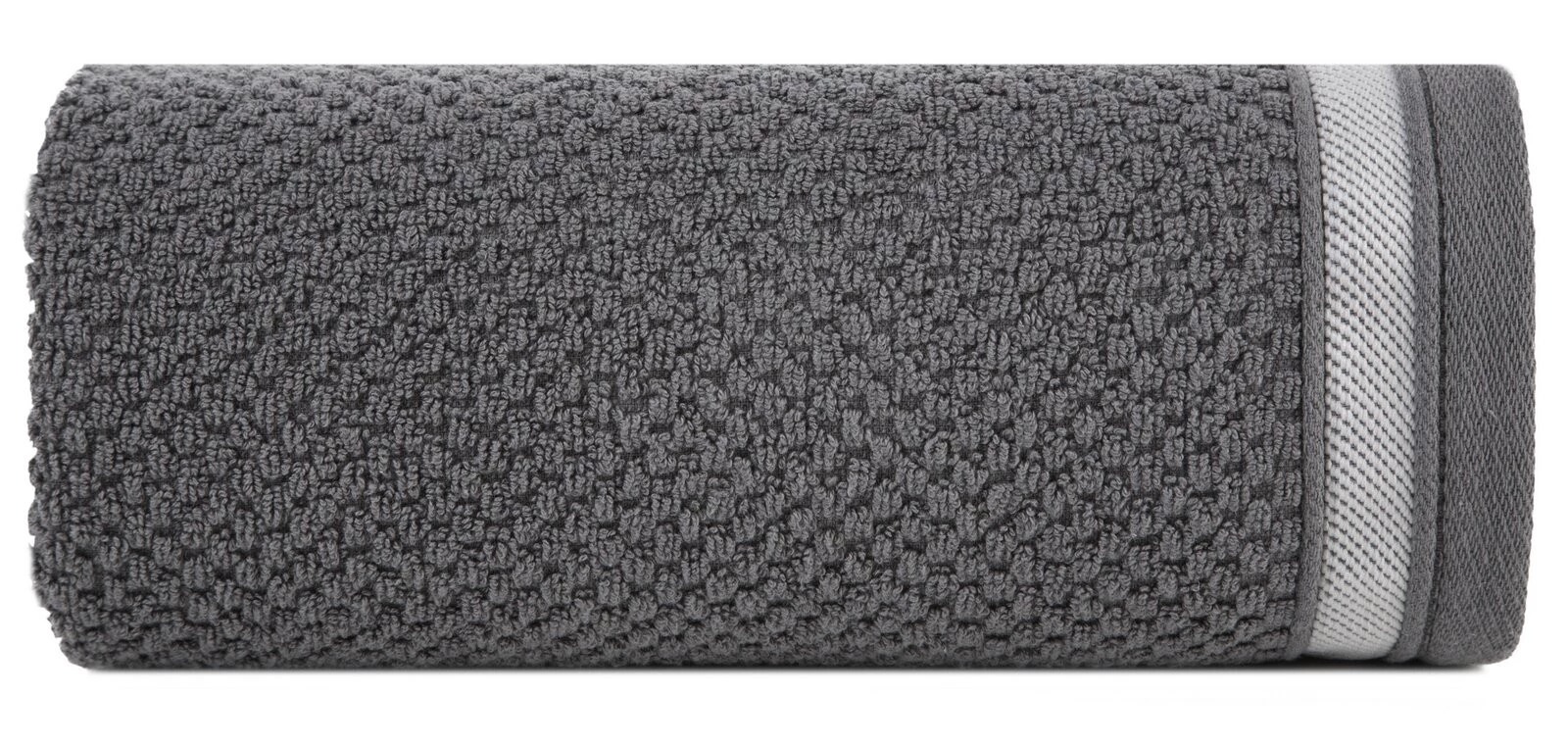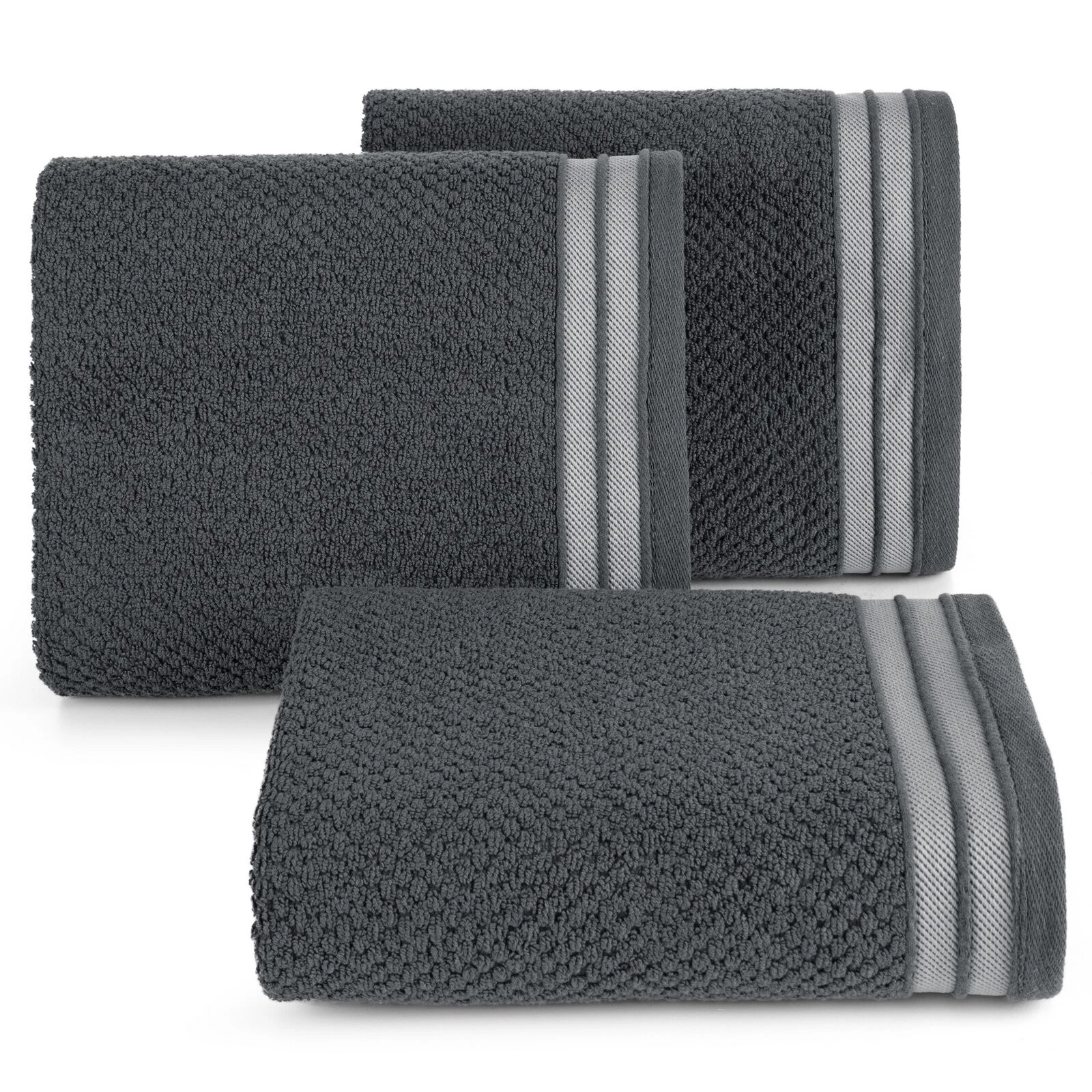 Jednobarwny ręcznik z miękkiej i chłonnej tkaniny bawełnianej o splocie frotte zdobiony kolorową bordiurą w stylu fastrygi. Łatwy w praniu, nie farbuje. szerokość: 30 cm, długość: 50 cm, kolor: stalowy, Gramatura: 500 GSM, Skład: 100% bawełna; część ozdobna: 80% poliester, 20% bawełna