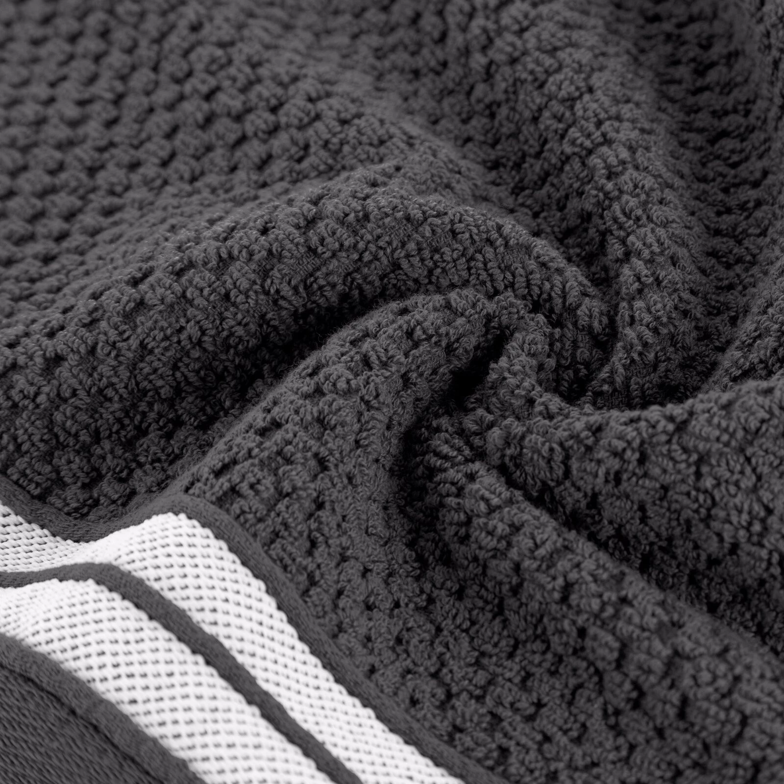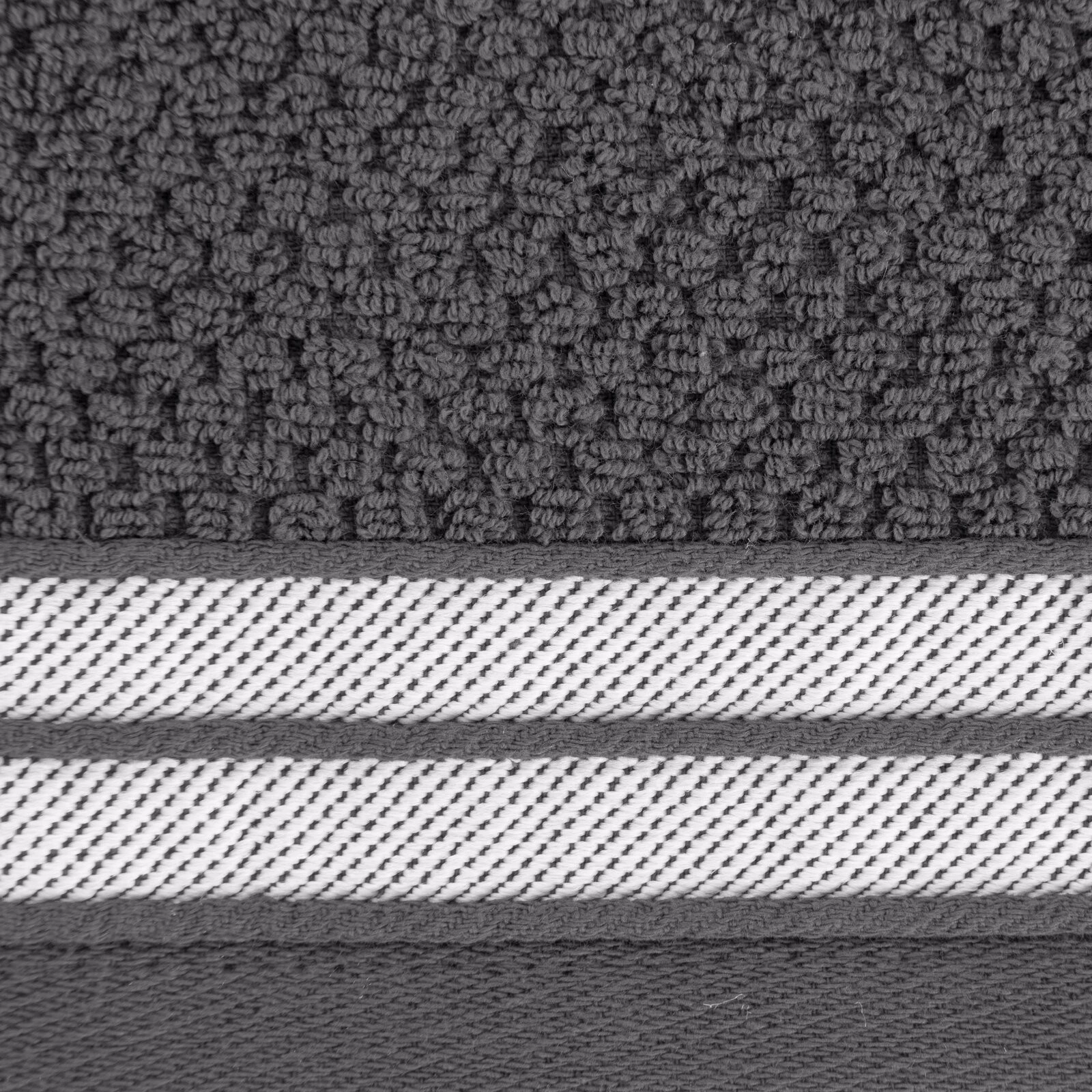 Jednobarwny ręcznik z miękkiej i chłonnej tkaniny bawełnianej o splocie frotte zdobiony kolorową bordiurą w stylu fastrygi. Łatwy w praniu, nie farbuje. szerokość: 50 cm, długość: 90 cm, kolor: stalowy, Gramatura: 500 GSM, Skład: 100% bawełna; część ozdobna: 80% poliester, 20% bawełna