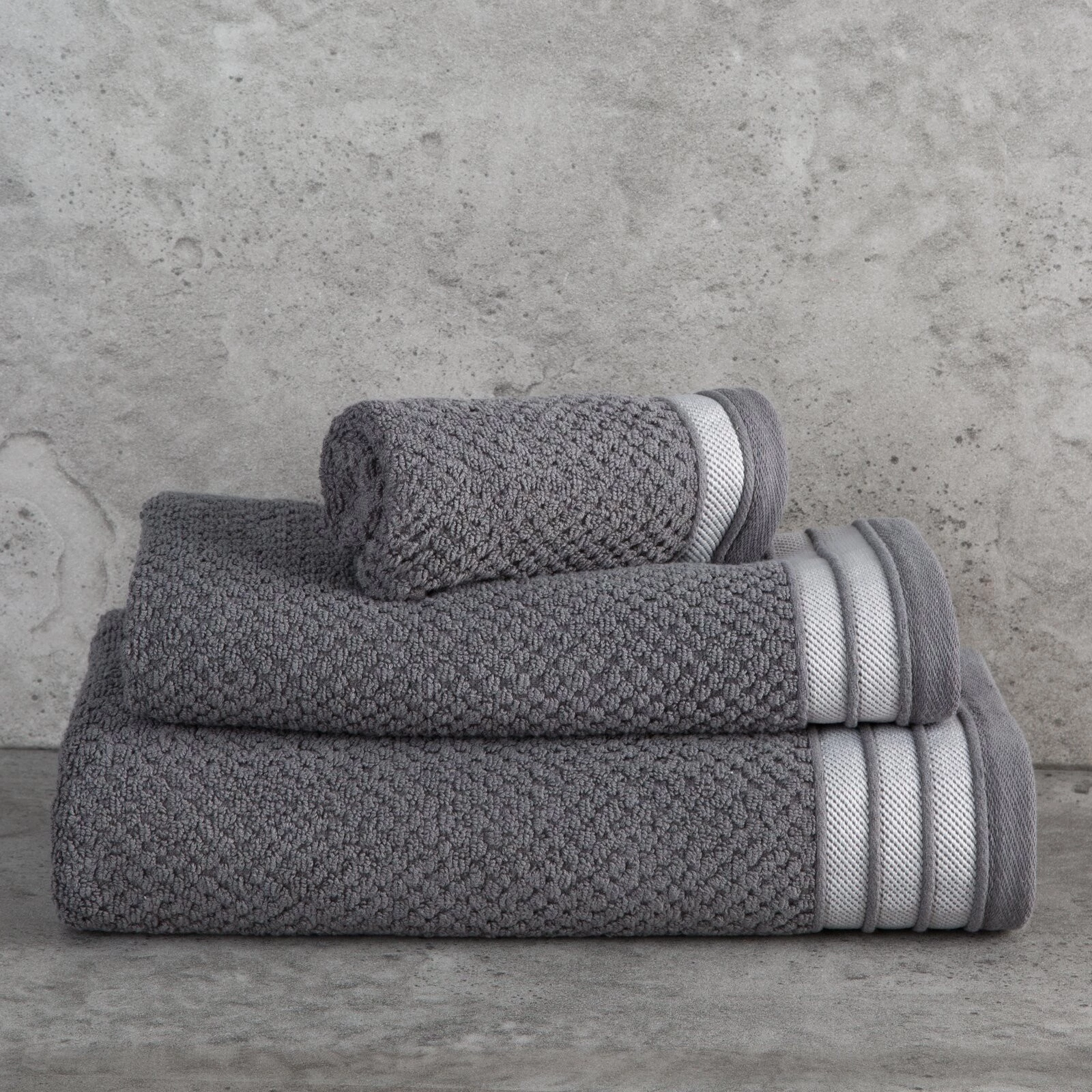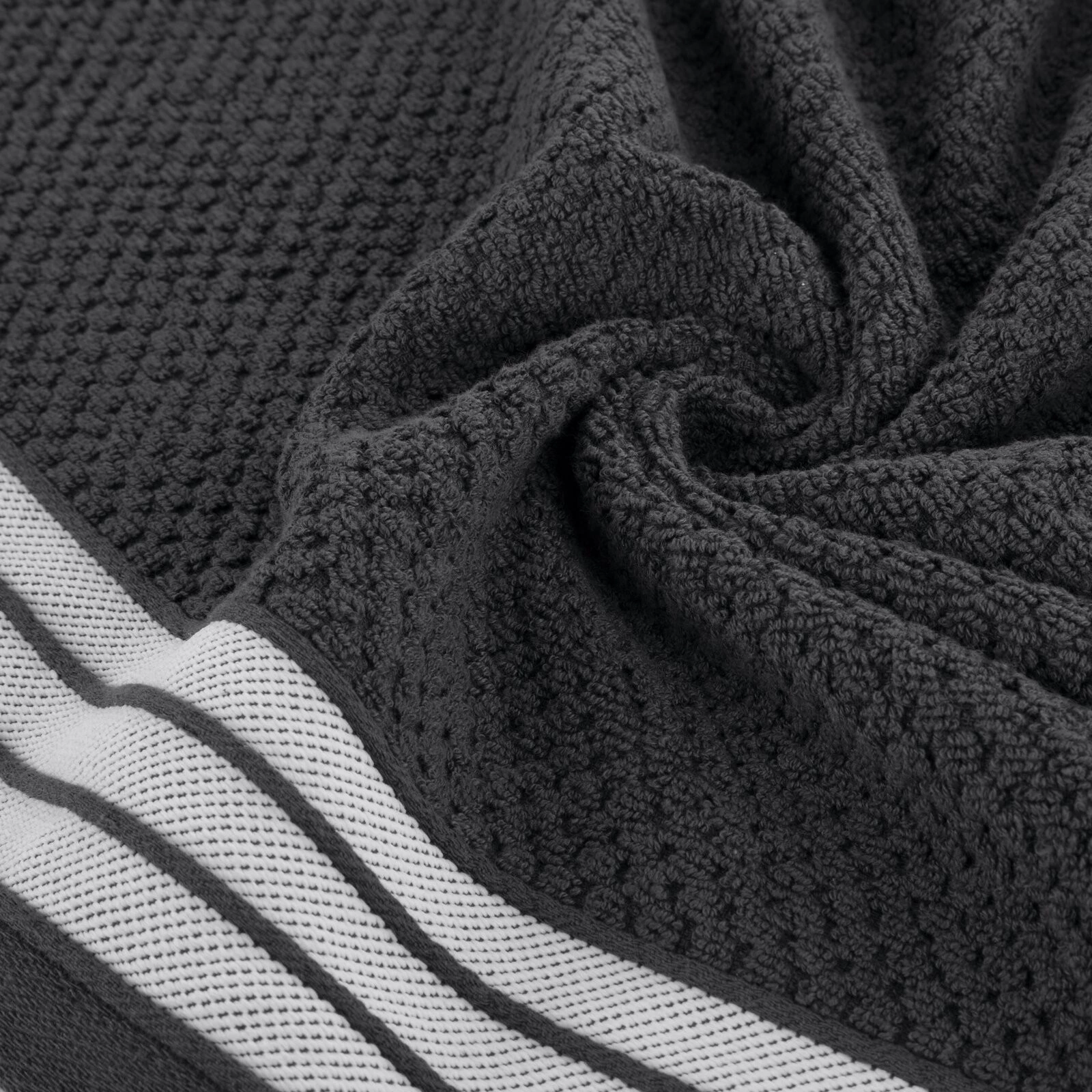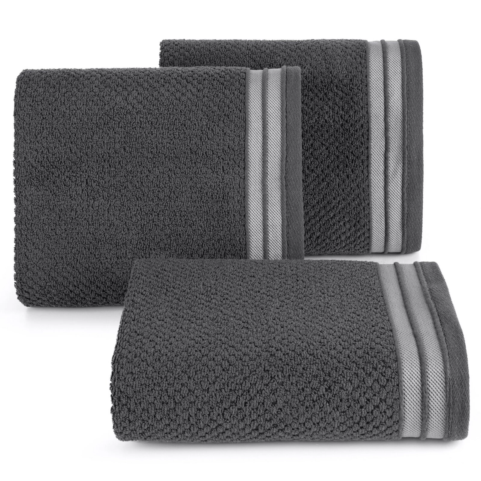 Jednobarwny ręcznik z miękkiej i chłonnej tkaniny bawełnianej o splocie frotte zdobiony kolorową bordiurą w stylu fastrygi. Łatwy w praniu, nie farbuje. szerokość: 70 cm, długość: 140 cm, kolor: stalowy, Gramatura: 500 GSM, Skład: 100% bawełna; część ozdobna: 80% poliester, 20% bawełna