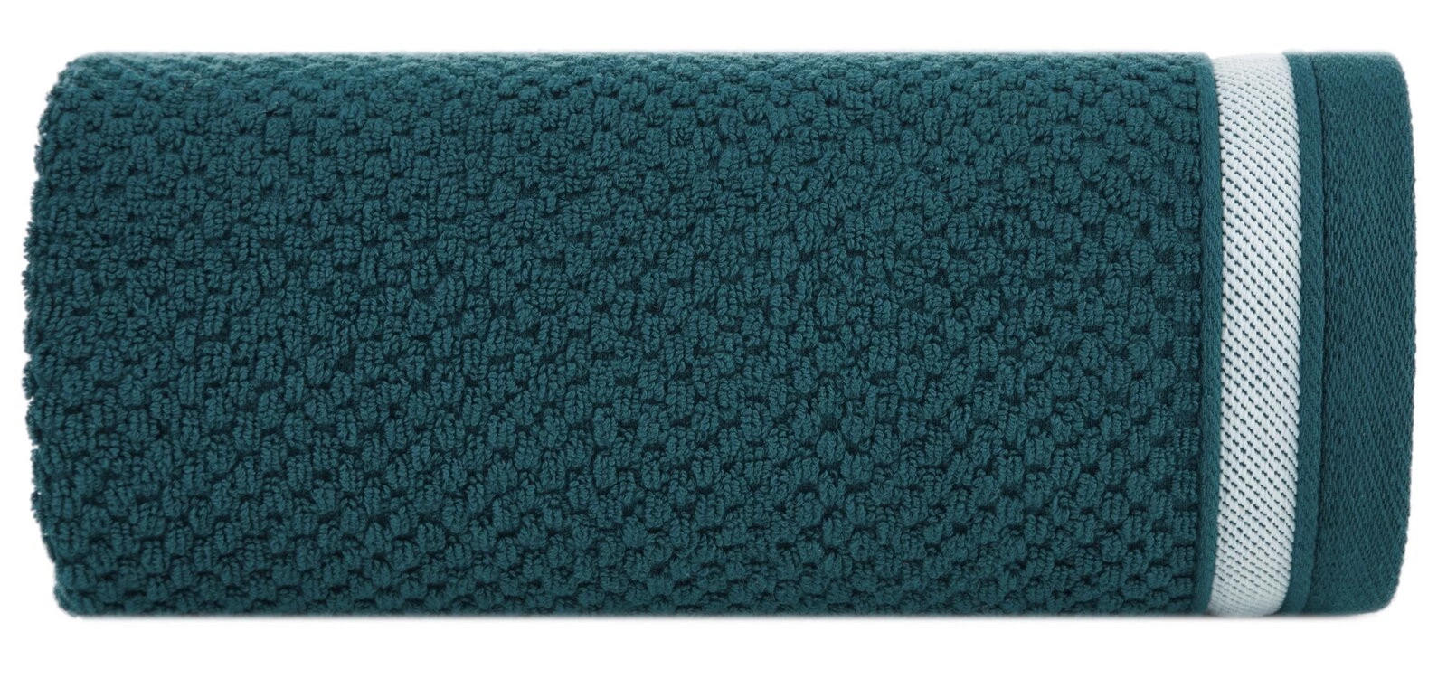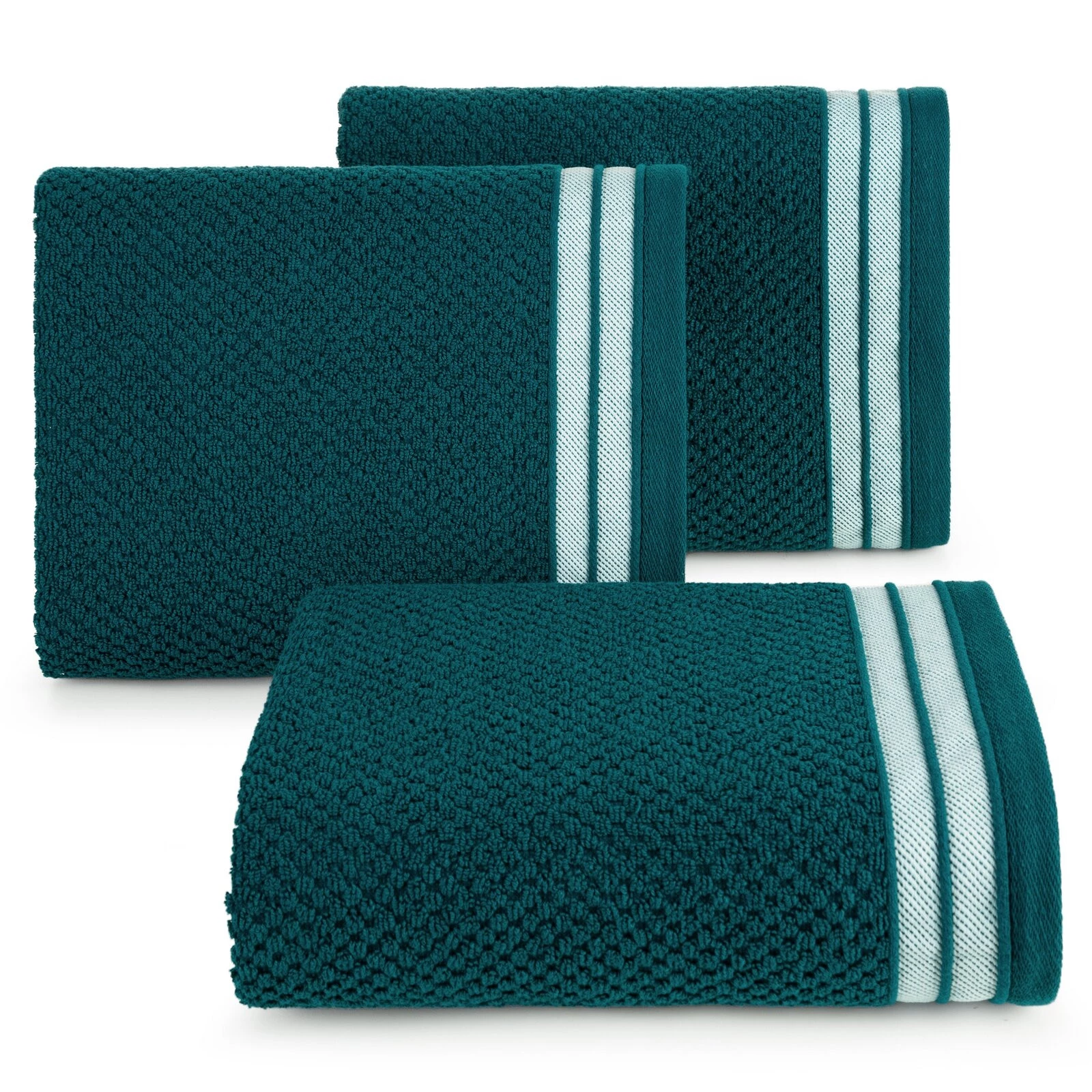 Jednobarwny ręcznik z miękkiej i chłonnej tkaniny bawełnianej o splocie frotte zdobiony kolorową bordiurą w stylu fastrygi. Łatwy w praniu, nie farbuje. szerokość: 30 cm, długość: 50 cm, kolor: ciemnoturkusowy, Gramatura: 500 GSM, Skład: 100% bawełna; część ozdobna: 80% poliester, 20% bawełna