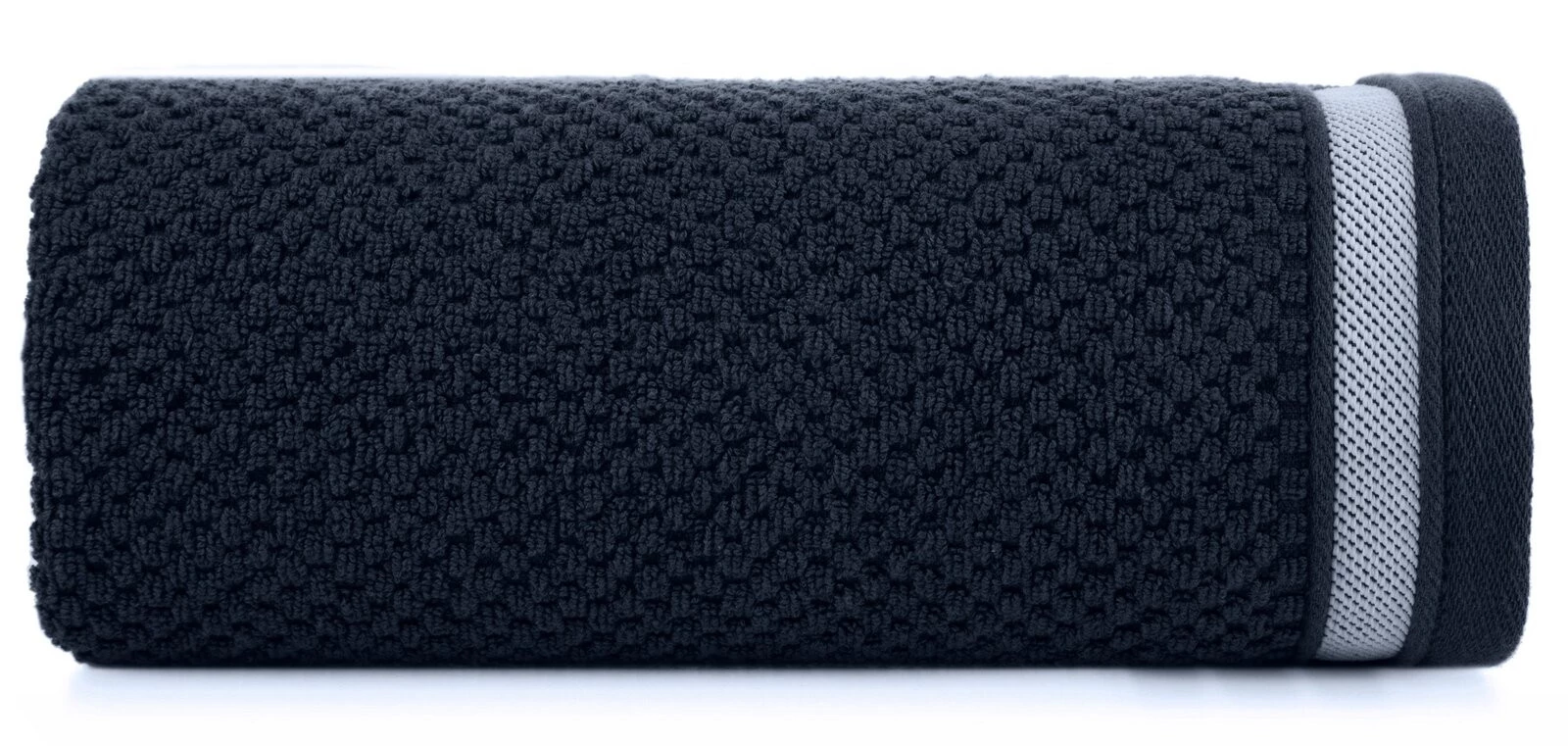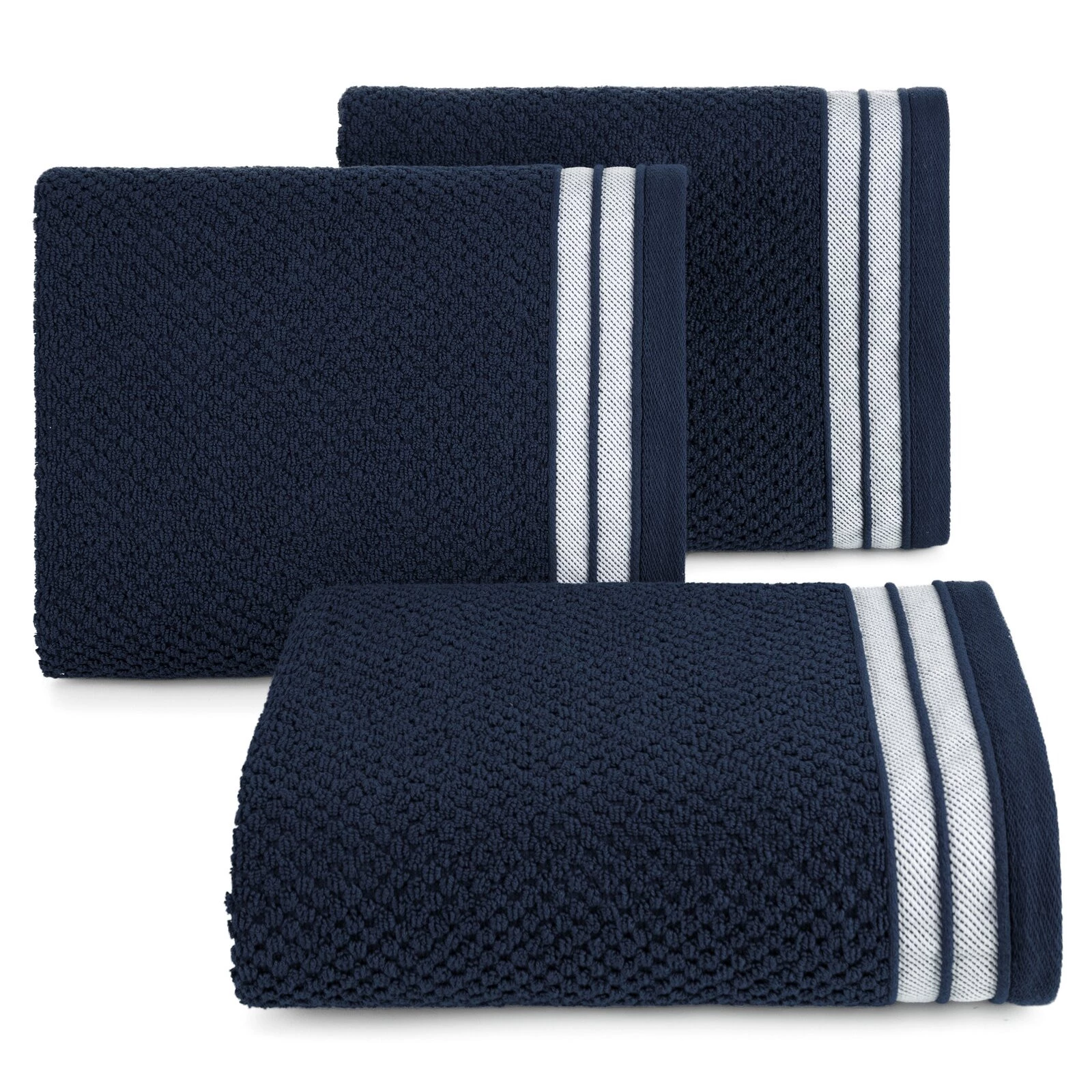 Jednobarwny ręcznik z miękkiej i chłonnej tkaniny bawełnianej o splocie frotte zdobiony kolorową bordiurą w stylu fastrygi. Łatwy w praniu, nie farbuje. szerokość: 30 cm, długość: 50 cm, kolor: granatowy, Gramatura: 500 GSM, Skład: 100% bawełna; część ozdobna: 80% poliester, 20% bawełna
