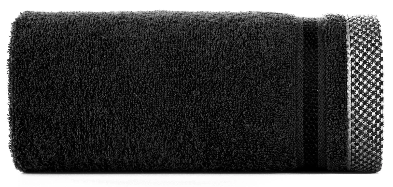 Jednobarwny ręcznik z miękkiej i chłonnej tkaniny bawełnianej o splocie frotte zdobiony kolorową bordiurą w stylu fastrygi. Łatwy w praniu, nie farbuje. szerokość: 50 cm, długość: 90 cm, kolor: czarny, Gramatura: 500 GSM, Skład: 100% bawełna; część ozdobna: 75% poliester, 25% wiskoza