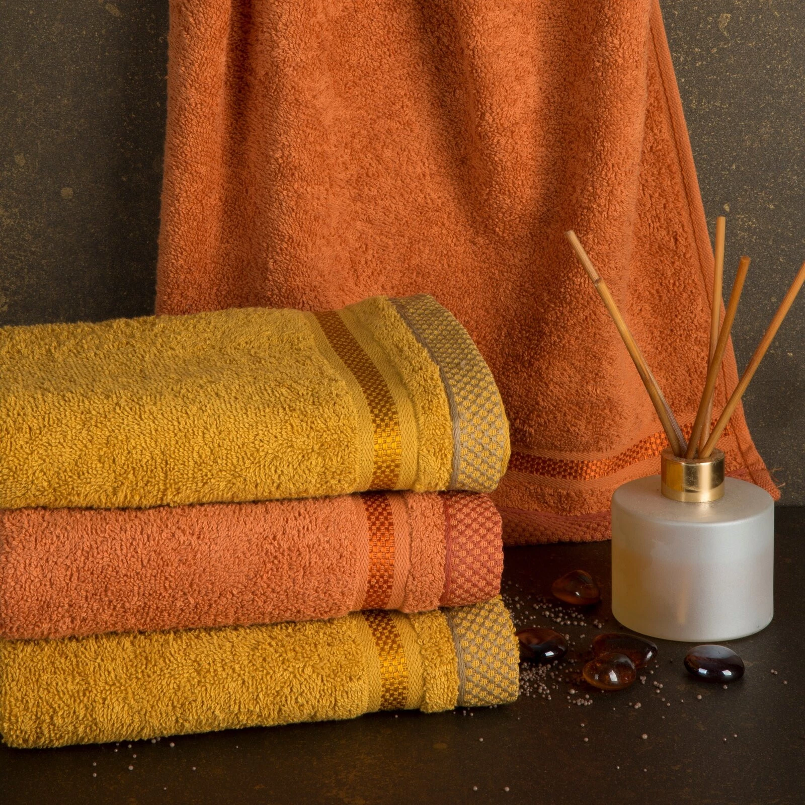 Jednobarwny ręcznik z miękkiej i chłonnej tkaniny bawełnianej o splocie frotte zdobiony kolorową bordiurą w stylu fastrygi. Łatwy w praniu, nie farbuje. szerokość: 50 cm, długość: 90 cm, kolor: stalowy, Gramatura: 500 GSM, Skład: 100% bawełna; częsc ozdobna: 75% poliester, 25% wiskoza