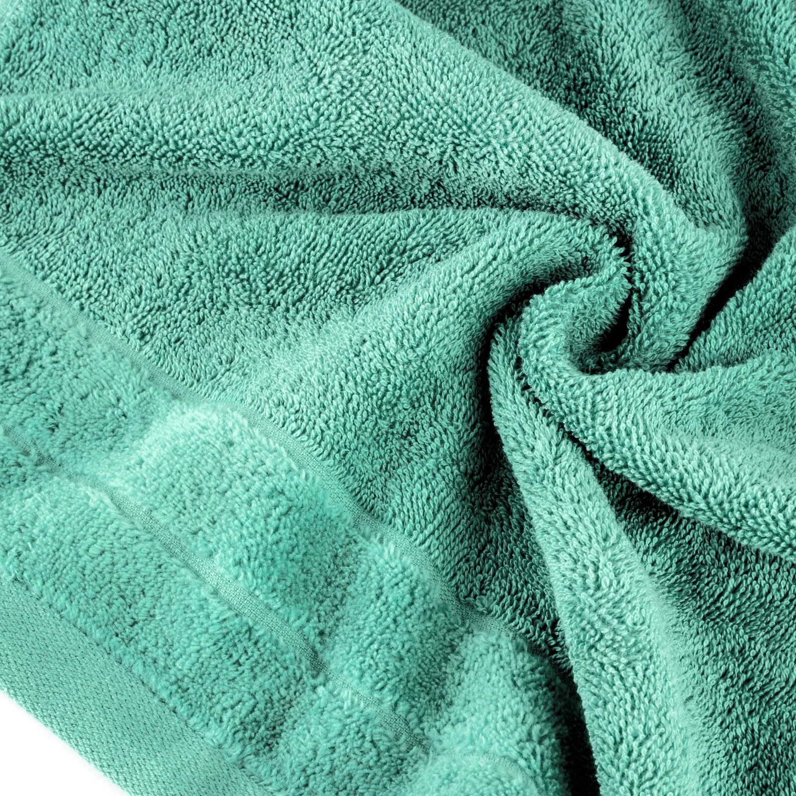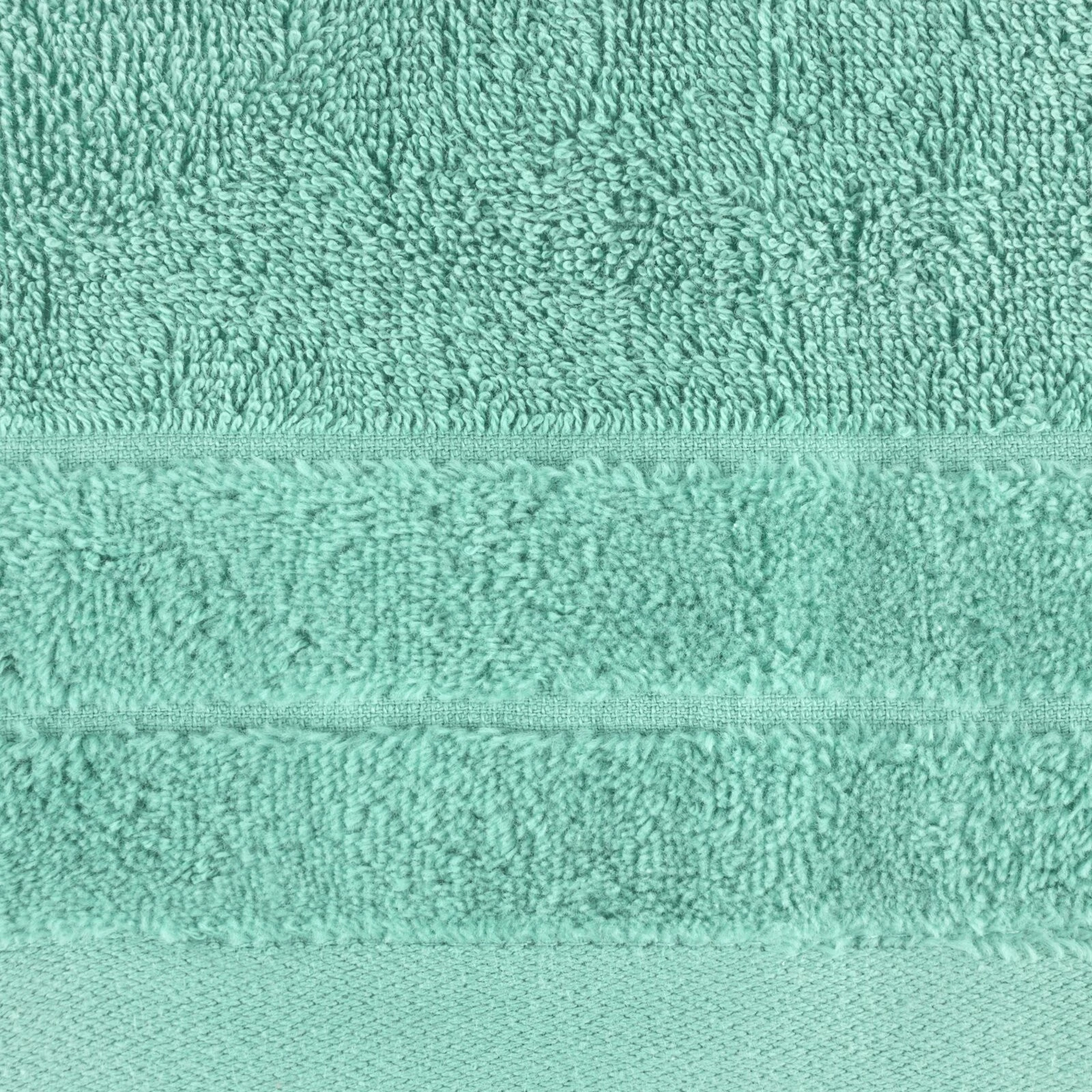 Elegancki ręcznik z delikatnej i bardzo chłonnej tkaniny frotte, jednokolorowy. Krawędzie zdobione subtelną bordiurą z welwetu. Łatwy w praniu, trwałe kolory. szerokość: 70 cm, długość: 140 cm, kolor: miętowy, Gramatura: 500 GSM, Skład: 100% bawełna