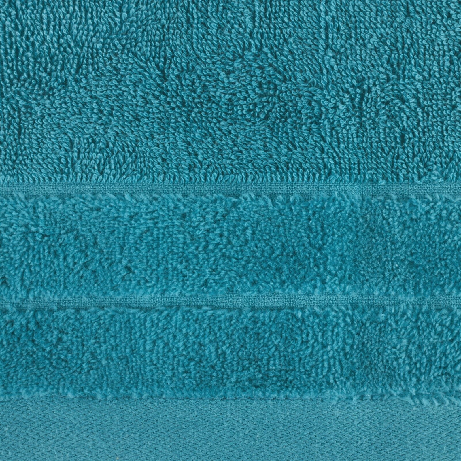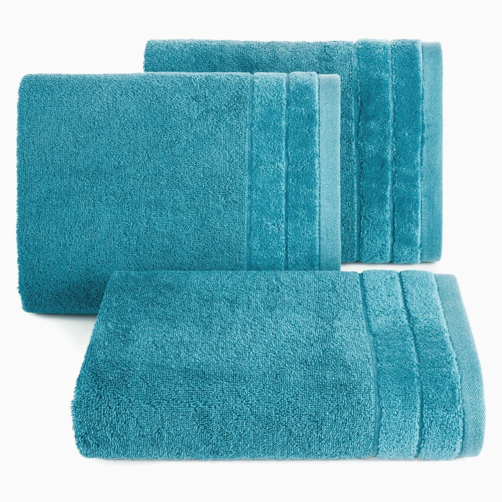 Elegancki ręcznik z delikatnej i bardzo chłonnej tkaniny frotte, jednokolorowy. Krawędzie zdobione subtelną bordiurą z welwetu. Łatwy w praniu, trwałe kolory. szerokość: 70 cm, długość: 140 cm, kolor: turkusowy, Gramatura: 500 GSM, Skład: 100% bawełna