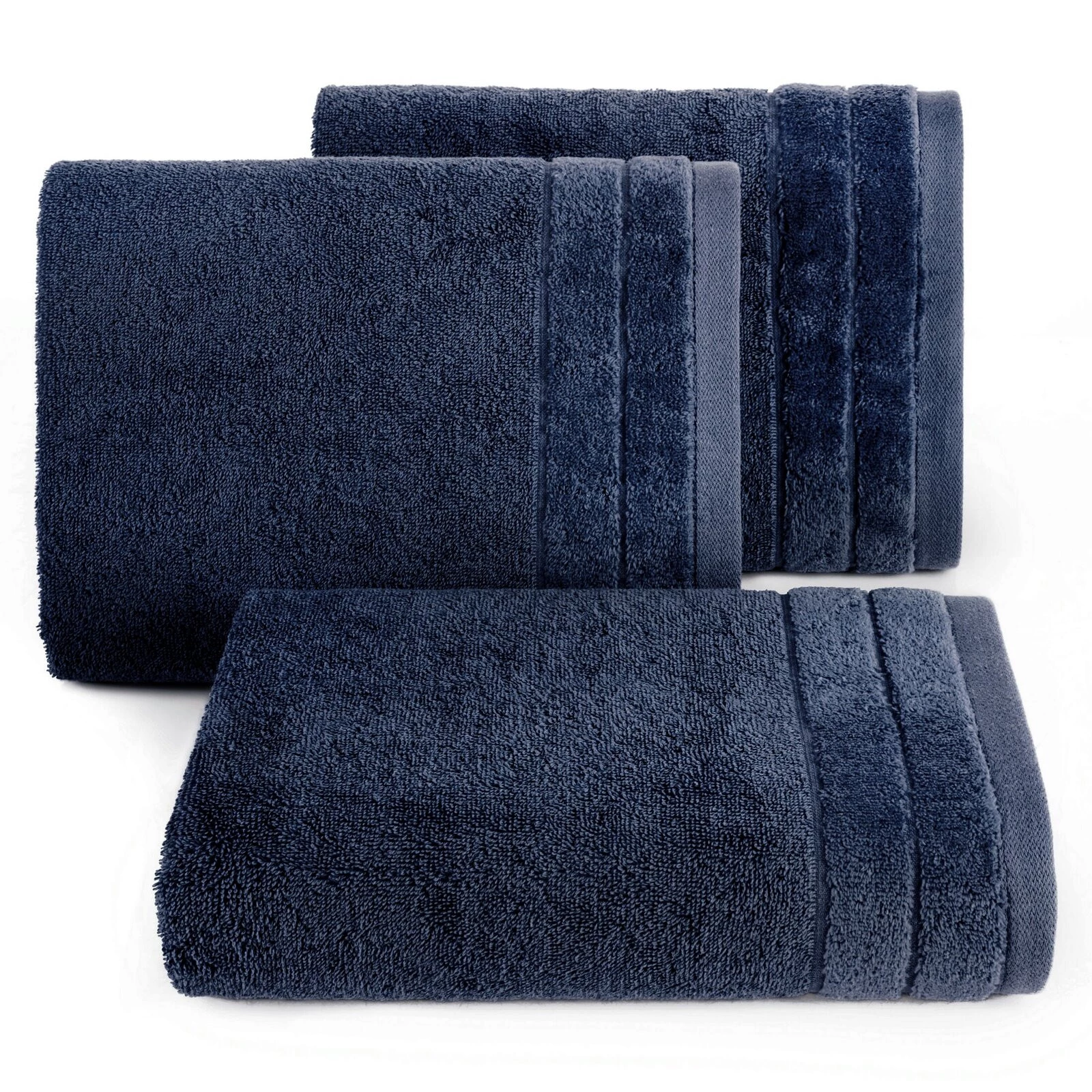 Elegancki ręcznik z delikatnej i bardzo chłonnej tkaniny frotte, jednokolorowy. Krawędzie zdobione subtelną bordiurą z welwetu. Łatwy w praniu, trwałe kolory. szerokość: 50 cm, długość: 90 cm, kolor: granatowy, Gramatura: 500 GSM, Skład: 100% bawełna