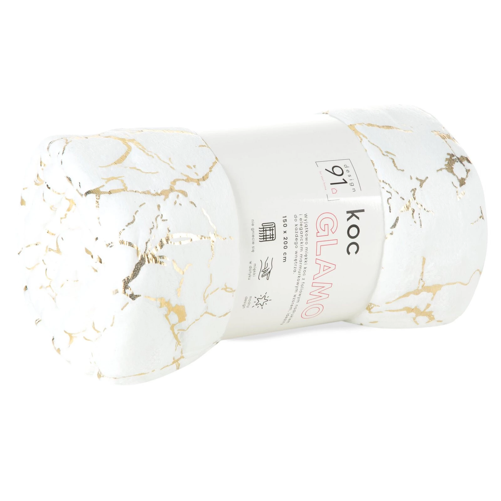 - Koc z nadrukiem foliowym o wzorze marmurka szerokość: 150 cm, długość: 200 cm, kolor: biały, Gramatura: 250 GSM, Skład: 100% poliester