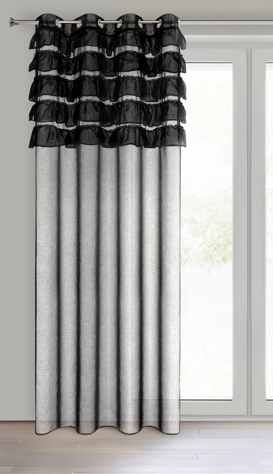 - Firana gotowa zdobiona w górnej części falbankami szerokość: 140 cm, długość: 250 cm, kolor: czarny, Gramatura: 70 GSM, Skład: 100% poliester