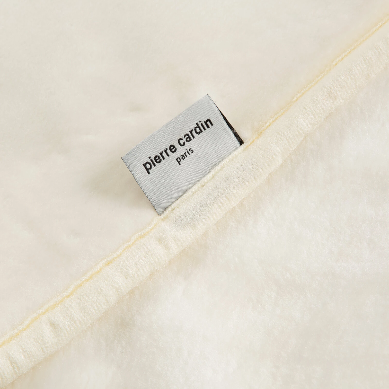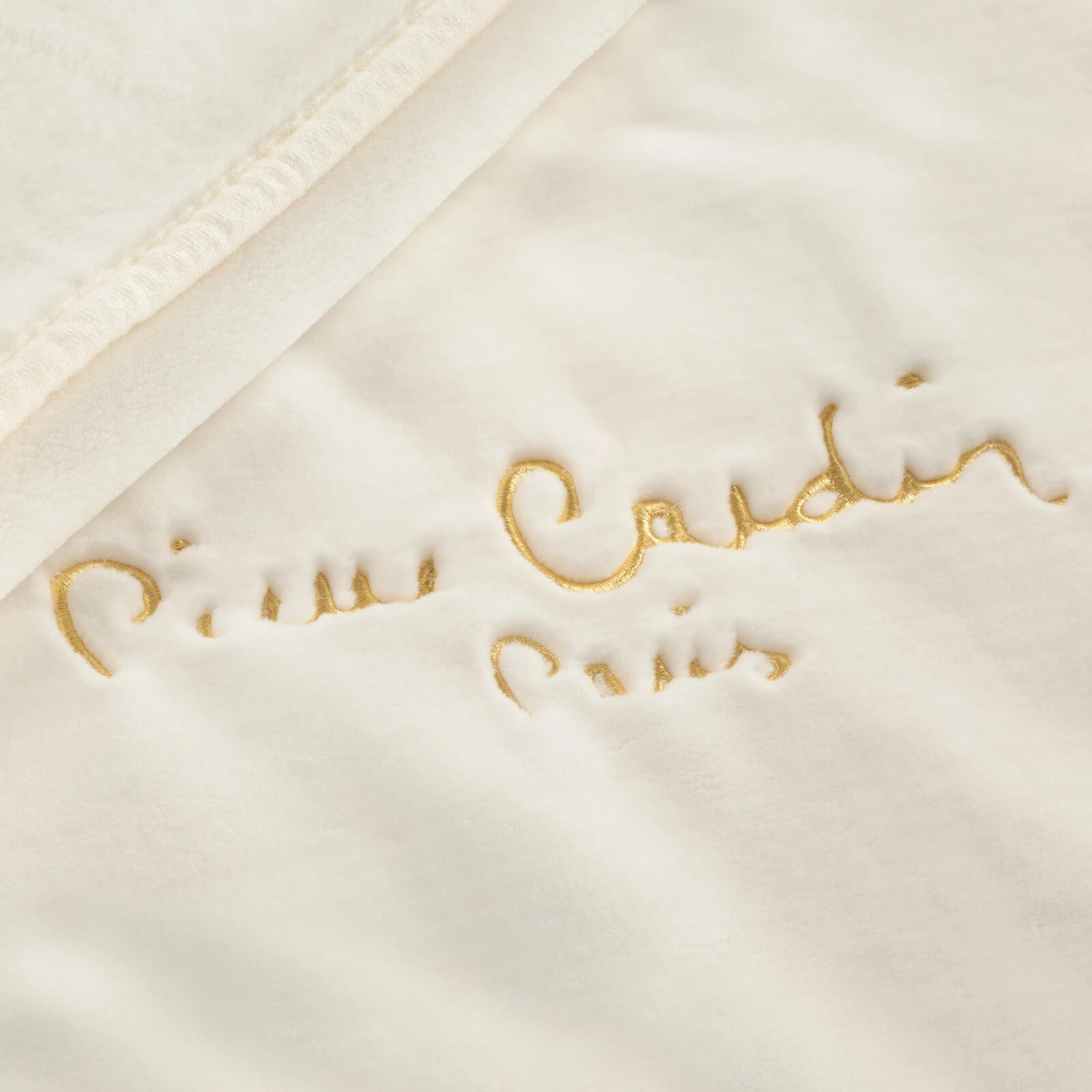 Jednokolorowy, ekskluzywny koc z kolekcji Pierre Cardin z haftowanym logo projektanta. Bardzo puszysty pled akrylowy z poliesterem jest wyjątkowo ciepły. szerokość: 220 cm, długość: 240 cm, kolor: kremowy, Gramatura: 700 GSM, Skład: 100% poliester