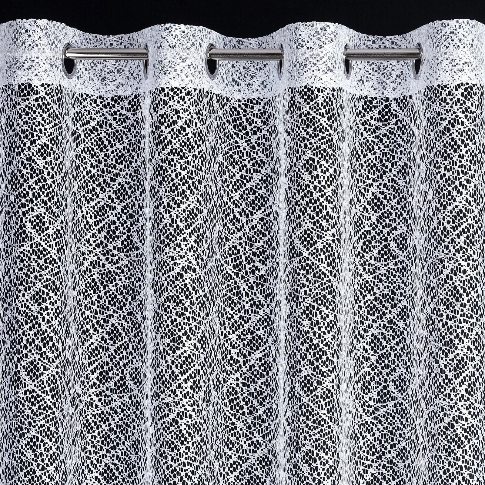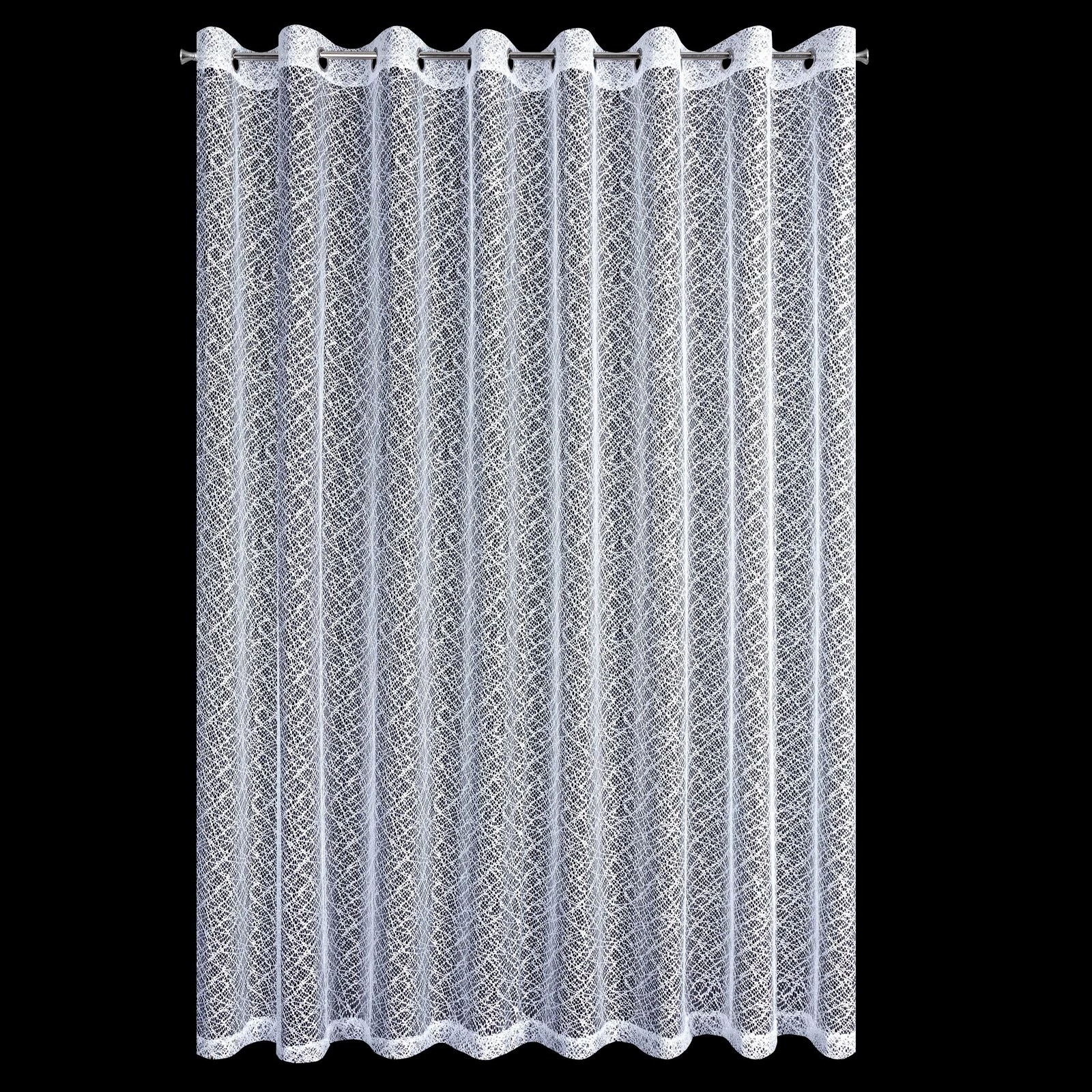 Nowoczesna firana z nieregularnej siateczki o subtelnym połysku i róznej wielkości oczek. Doskonała również w roli dekoracyjnej zasłony. Nie należy wybielać. szerokość: 300 cm, długość: 250 cm, kolor: biały, Gramatura: 120 GSM, Skład: 100% poliester