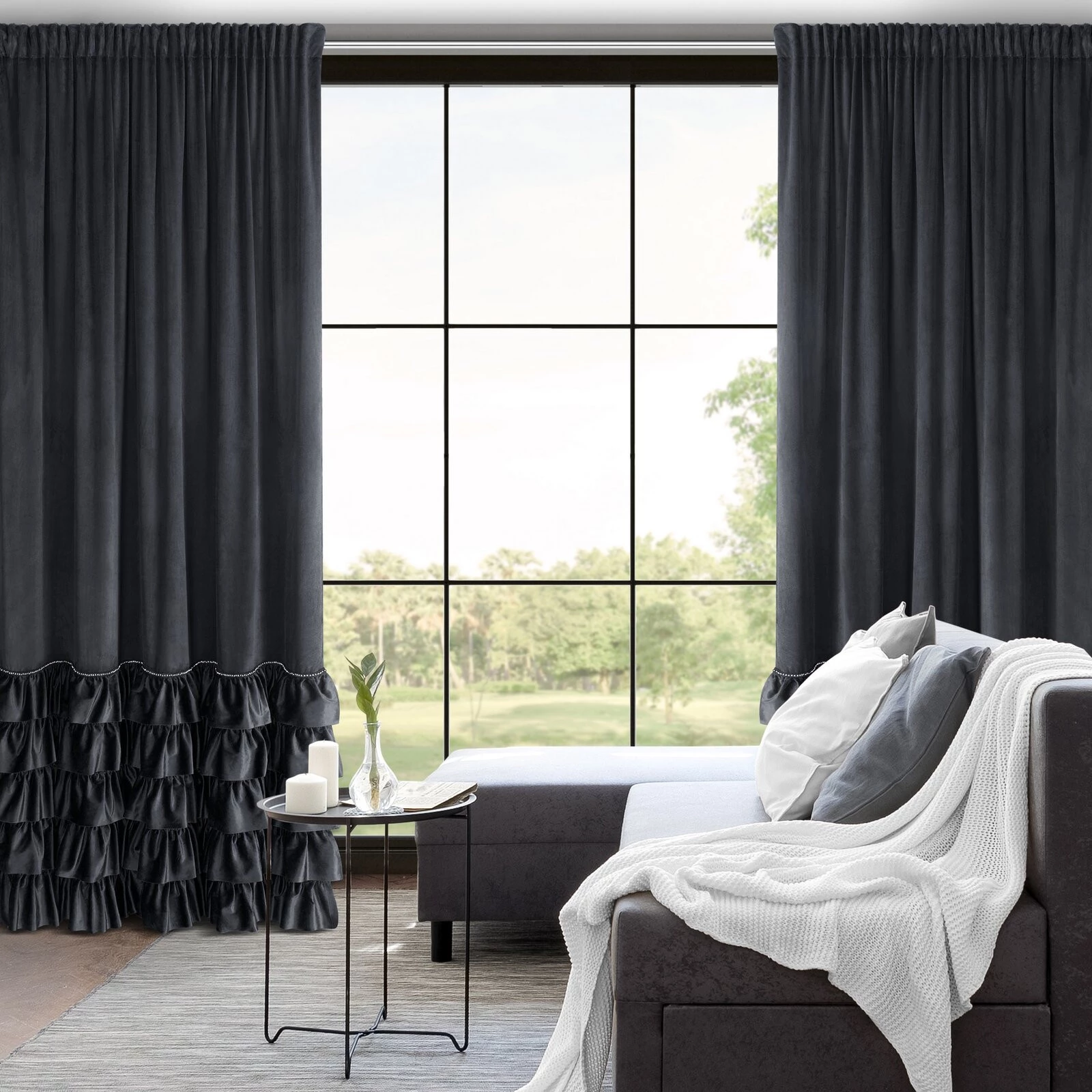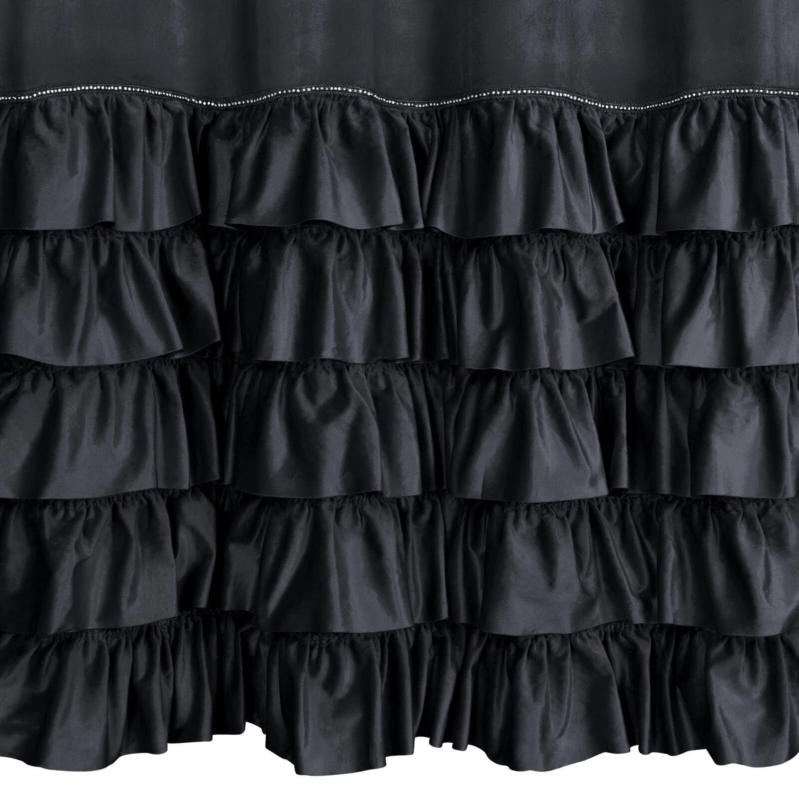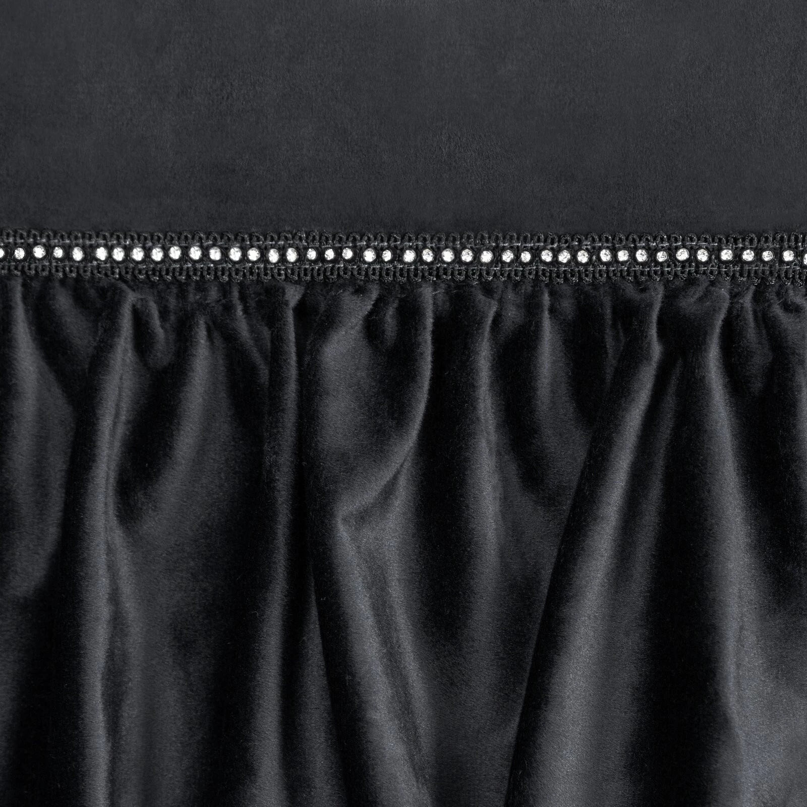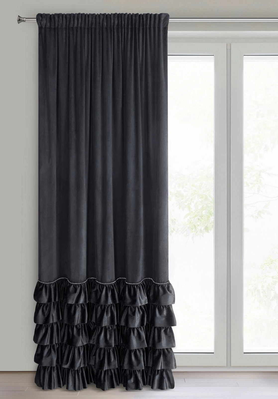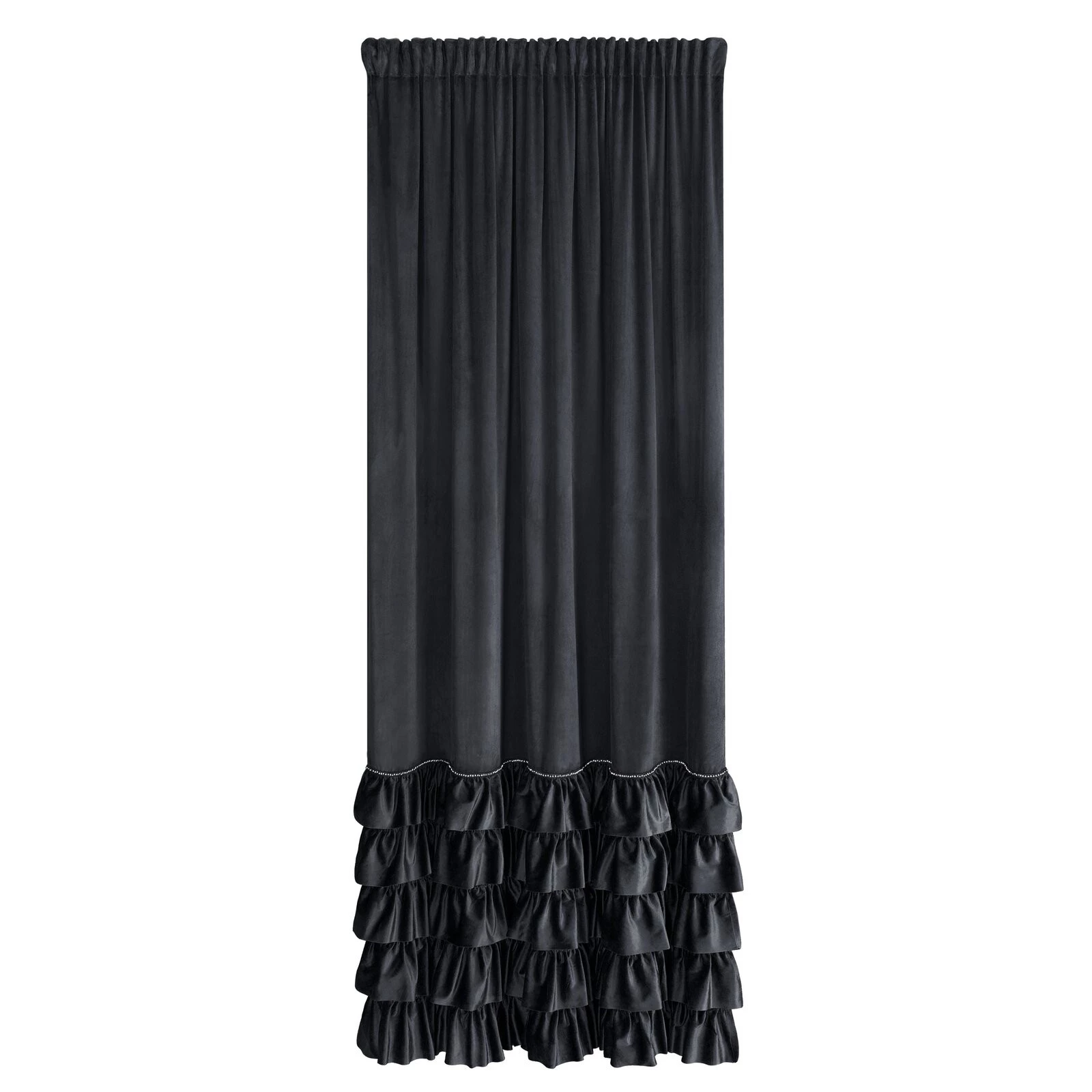 - Zasłona gotowa welwetowa z falbanami i ozdobnymi cyrkoniami szerokość: 140 cm, długość: 250 cm, kolor: czarny, Gramatura: 200 GSM, Skład: 100% poliester