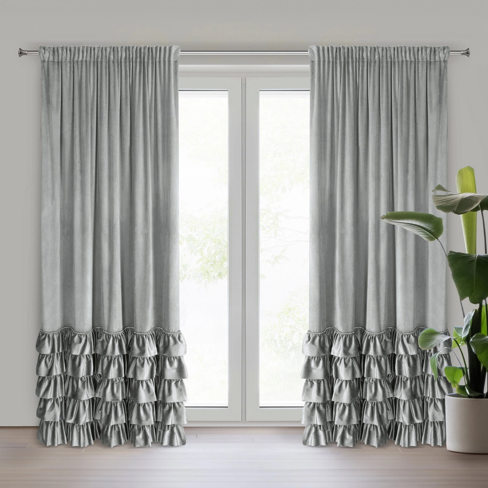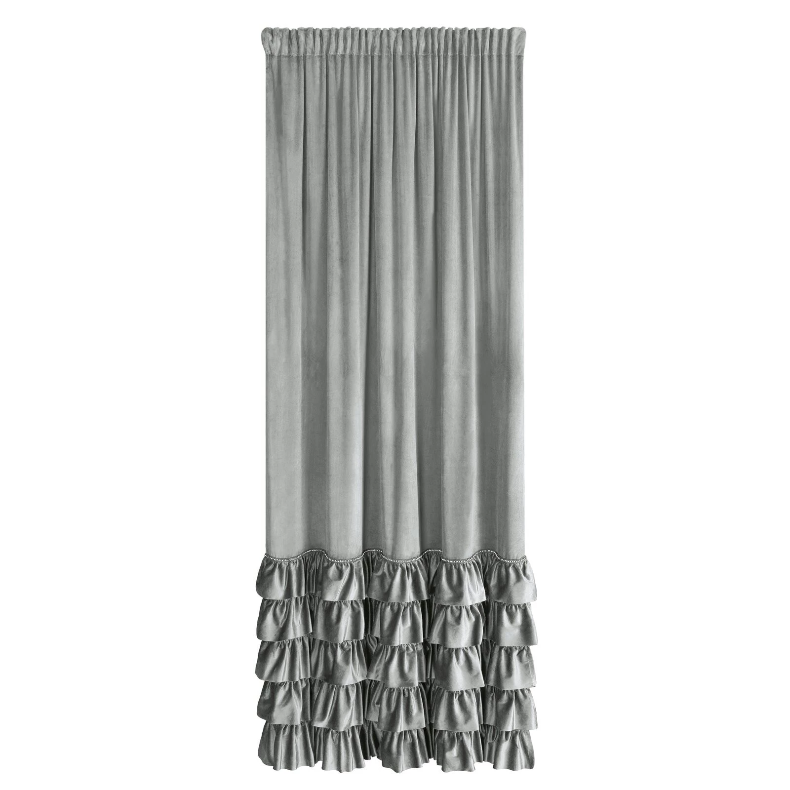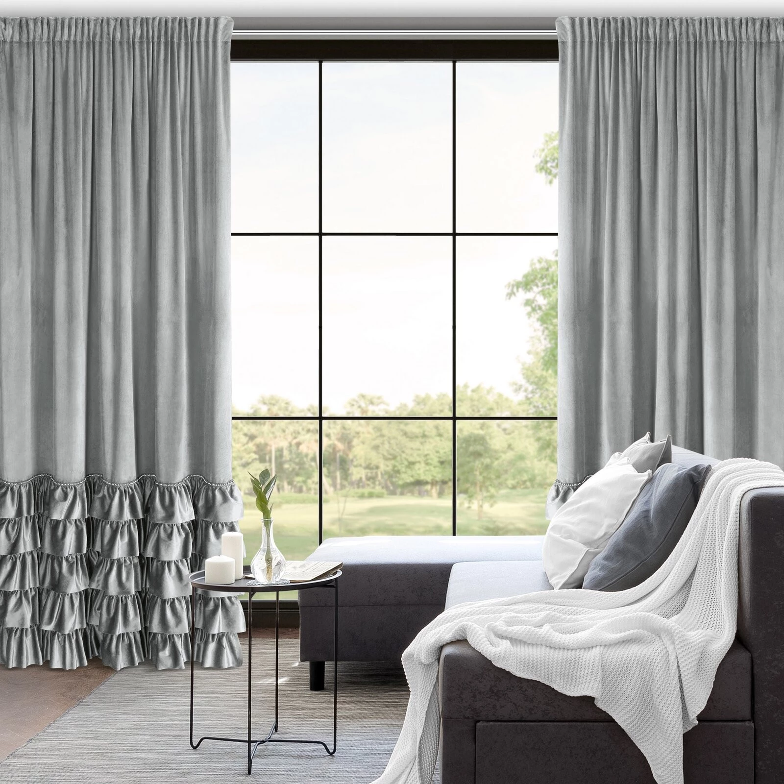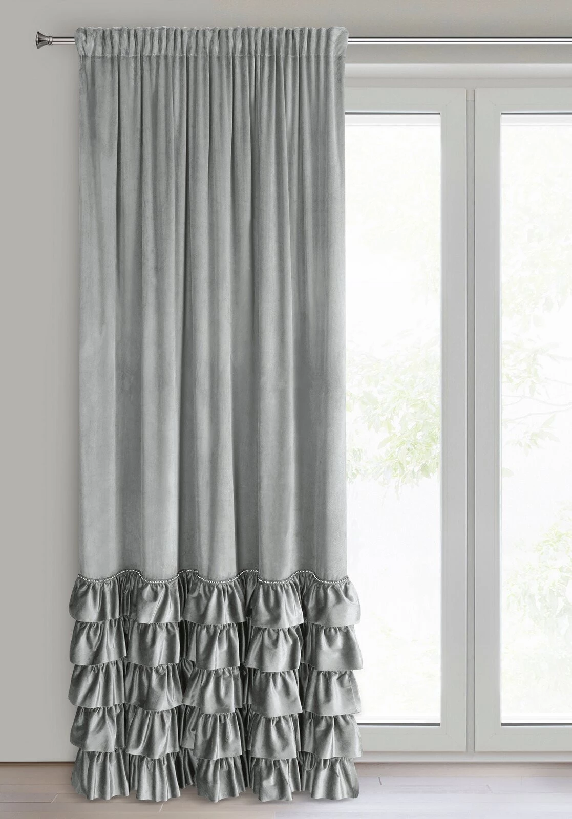 - Zasłona gotowa welwetowa z falbanami i ozdobnymi cyrkoniami szerokość: 140 cm, długość: 250 cm, kolor: srebrny, Gramatura: 200 GSM, Skład: 100% poliester