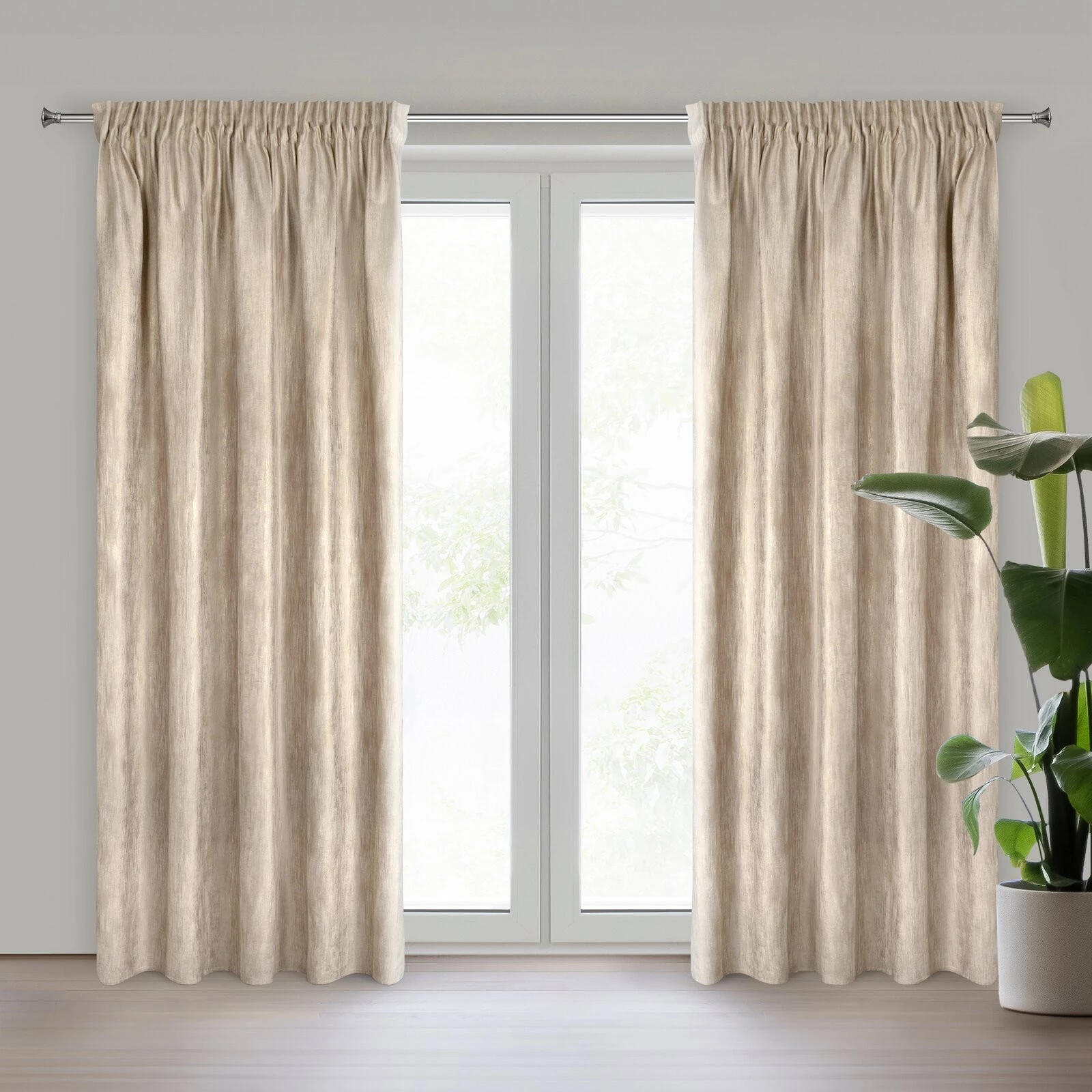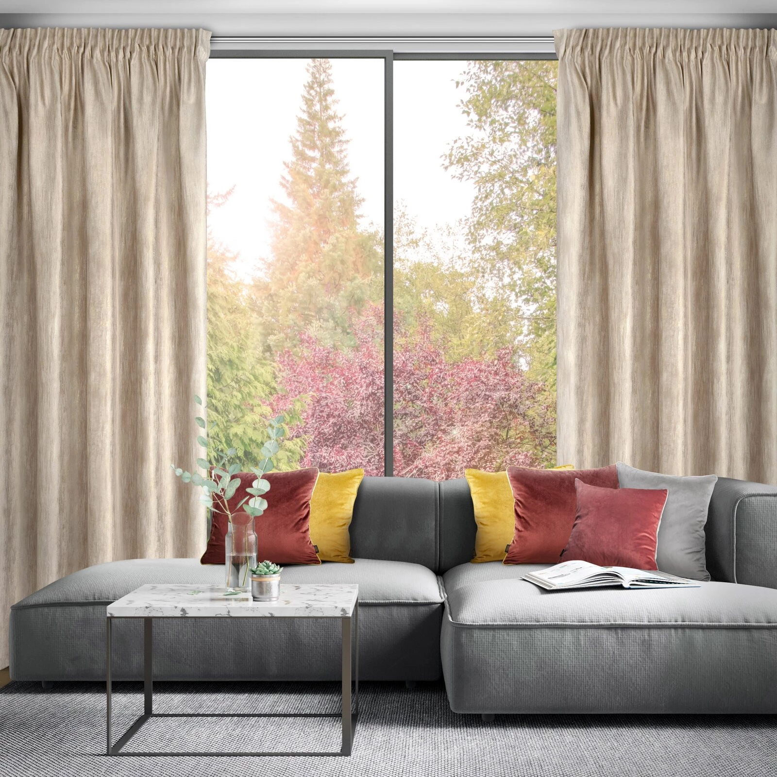 - Zasłona welwetowa z błyszczącym nadrukiem szerokość: 140 cm, długość: 270 cm, kolor: jasnobeżowy, Gramatura: 200 GSM, Skład: 100% poliester