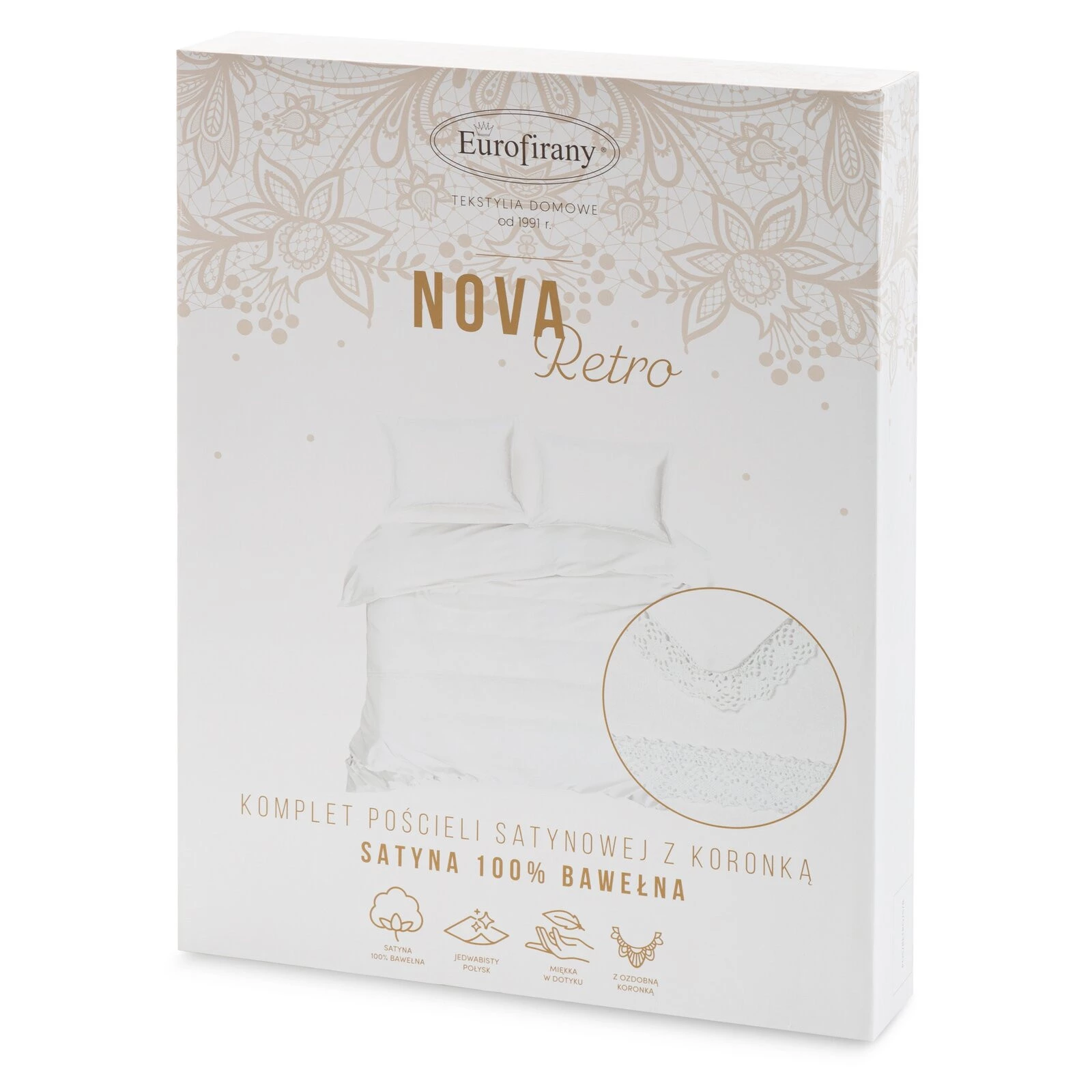 Komplet pościeli z satyny bawełnianej z koronką, pakowana w pudełku szerokość: 220 cm, długość: 200 cm, kolor: biały, Gramatura: 115 GSM, Skład: satyna, 100% bawełna