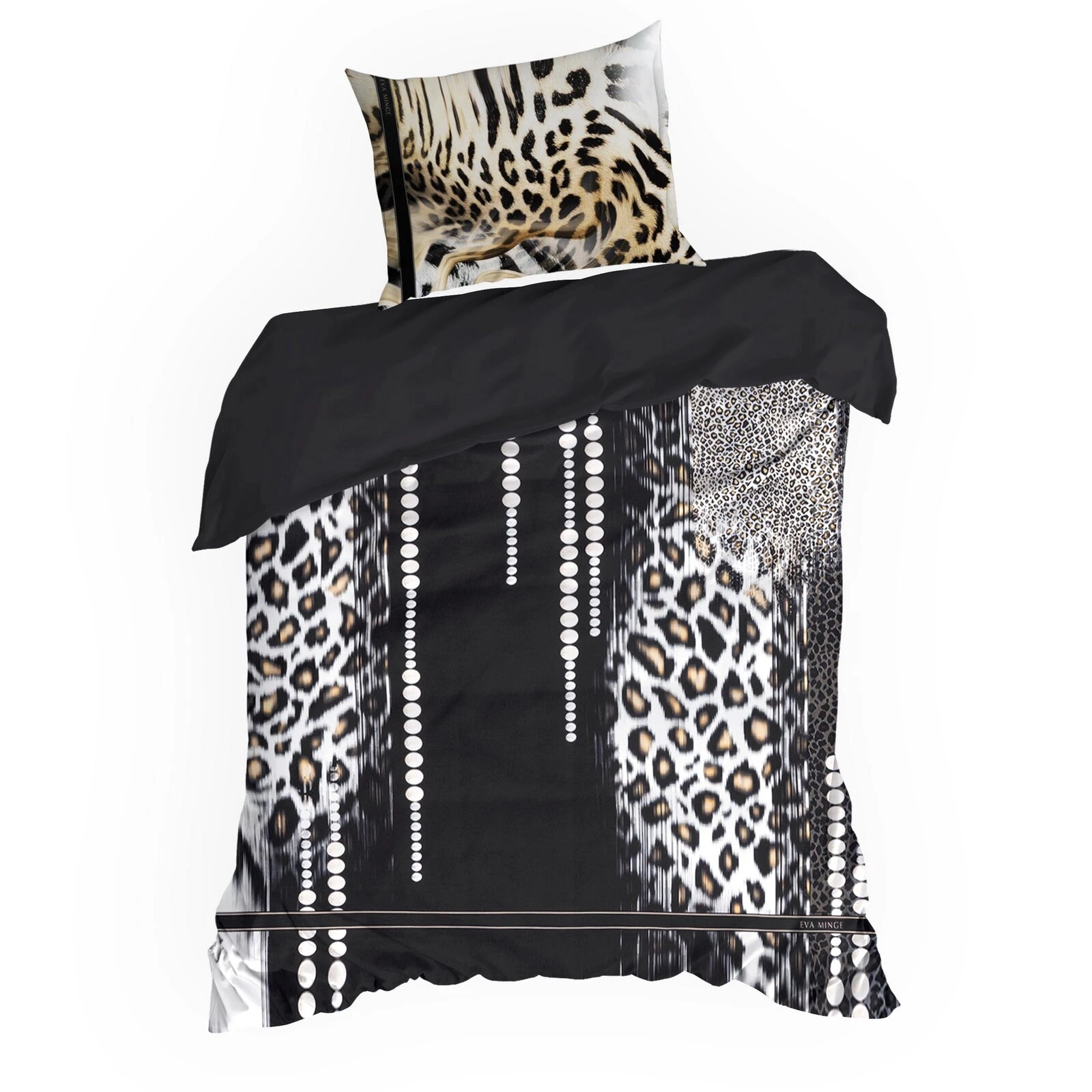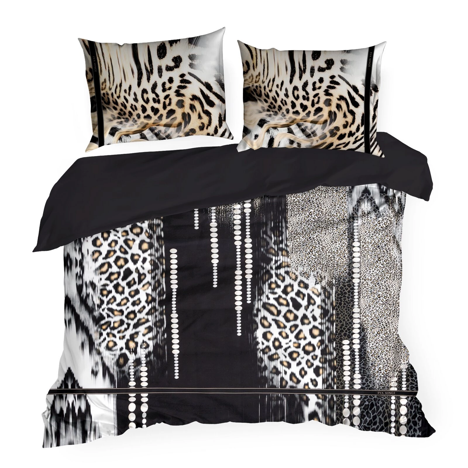 Komplet ekskluzywnej, designerskiej pościeli z satyny bawełnianej z kolekcji polecanej przez Eva Minge. Zapinana na zamek błyskawiczny. Precyzyjne wykonanie. szerokość: 140 cm, długość: 200 cm, kolor: czarny, Gramatura: 125 GSM, Skład: makosatyna, 100% bawełna