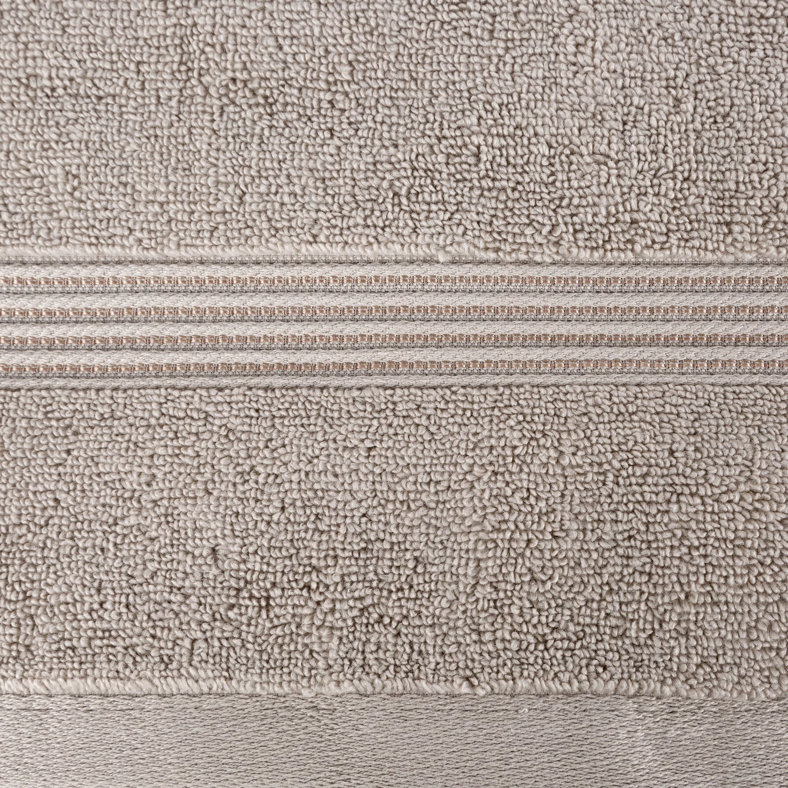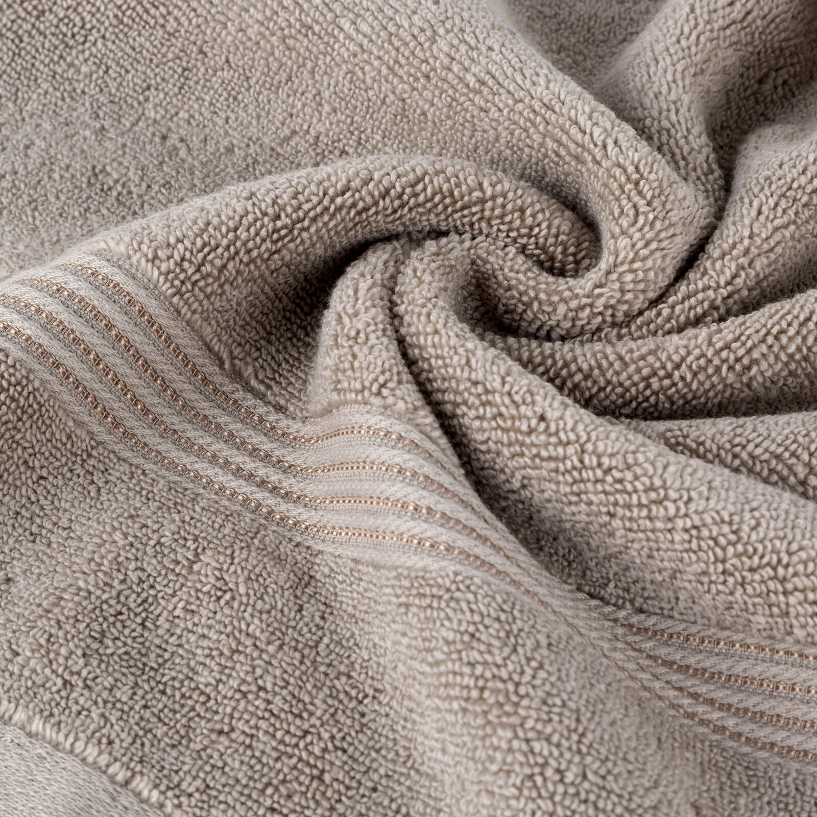 Jednobarwny ręcznik z miękkiej i chłonnej tkaniny bawełnianej o splocie frotte zdobiony kolorową bordiurą w stylu fastrygi. Łatwy w praniu, nie farbuje. szerokość: 30 cm, długość: 50 cm, kolor: beżowy, Gramatura: 550 GSM, Skład: 75% bawełna, 25% modal; część ozdobna: 80% bawełna, 20% wiskoza