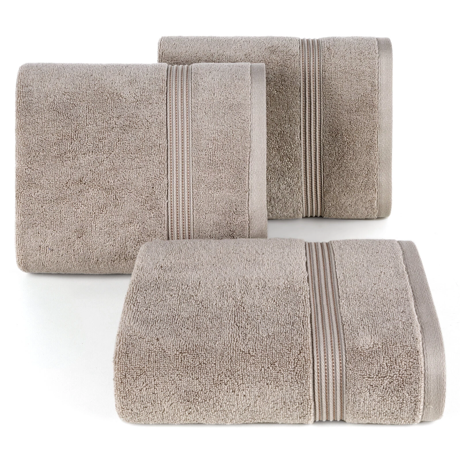 Jednobarwny ręcznik z miękkiej i chłonnej tkaniny bawełnianej o splocie frotte zdobiony kolorową bordiurą w stylu fastrygi. Łatwy w praniu, nie farbuje. szerokość: 50 cm, długość: 90 cm, kolor: beżowy, Gramatura: 550 GSM, Skład: 75% bawełna, 25% modal; część ozdobna: 80% bawełna, 20% wiskoza