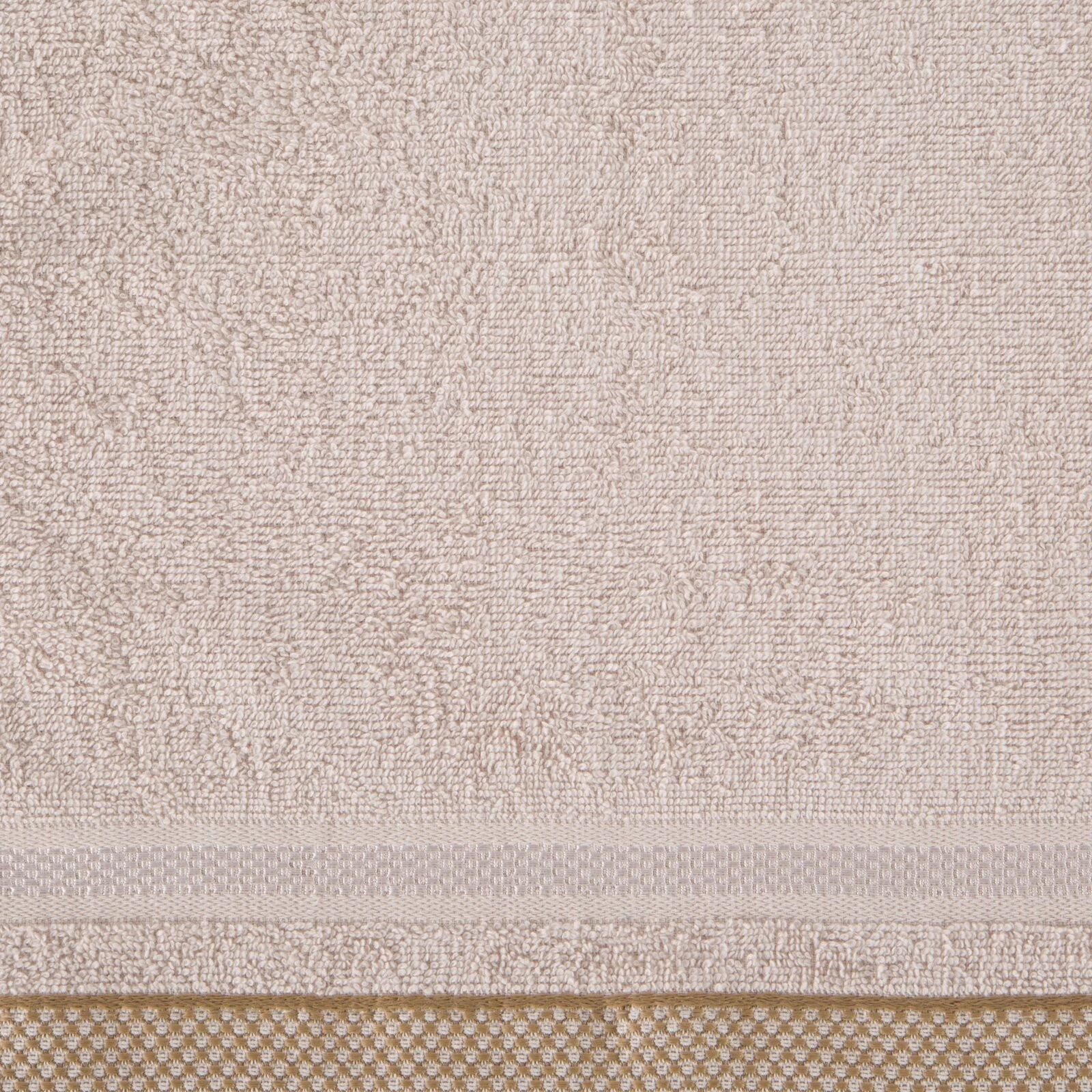 Jednobarwny ręcznik z miękkiej i chłonnej tkaniny bawełnianej o splocie frotte zdobiony kolorową bordiurą w stylu fastrygi. Łatwy w praniu, nie farbuje. szerokość: 100 cm, długość: 150 cm, kolor: beżowy, Gramatura: 500 GSM, Skład: 100% bawełna; częsc ozdobna: 75% poliester, 25% wiskoza