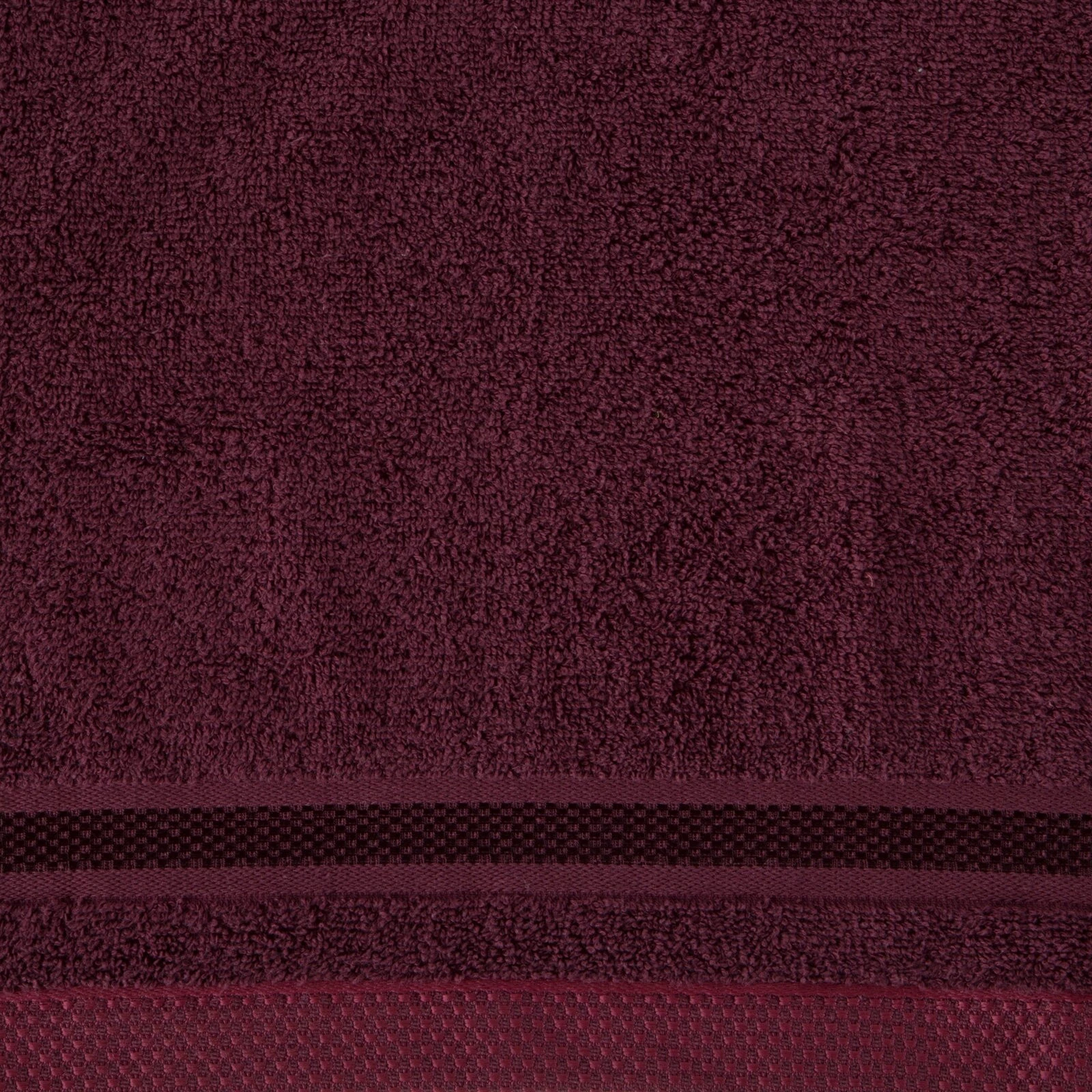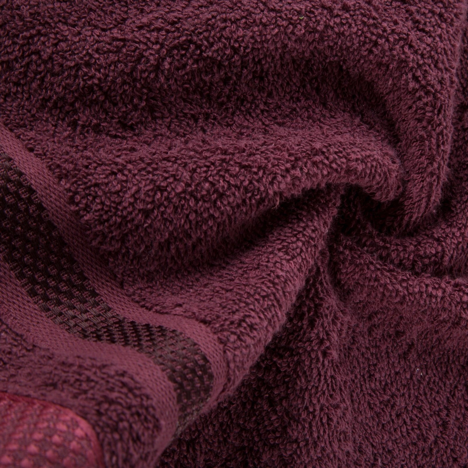 Jednobarwny ręcznik z miękkiej i chłonnej tkaniny bawełnianej o splocie frotte zdobiony kolorową bordiurą w stylu fastrygi. Łatwy w praniu, nie farbuje. szerokość: 30 cm, długość: 50 cm, kolor: bordowy, Gramatura: 500 GSM, Skład: 100% bawełna; część ozdobna: 75% poliester, 25% wiskoza
