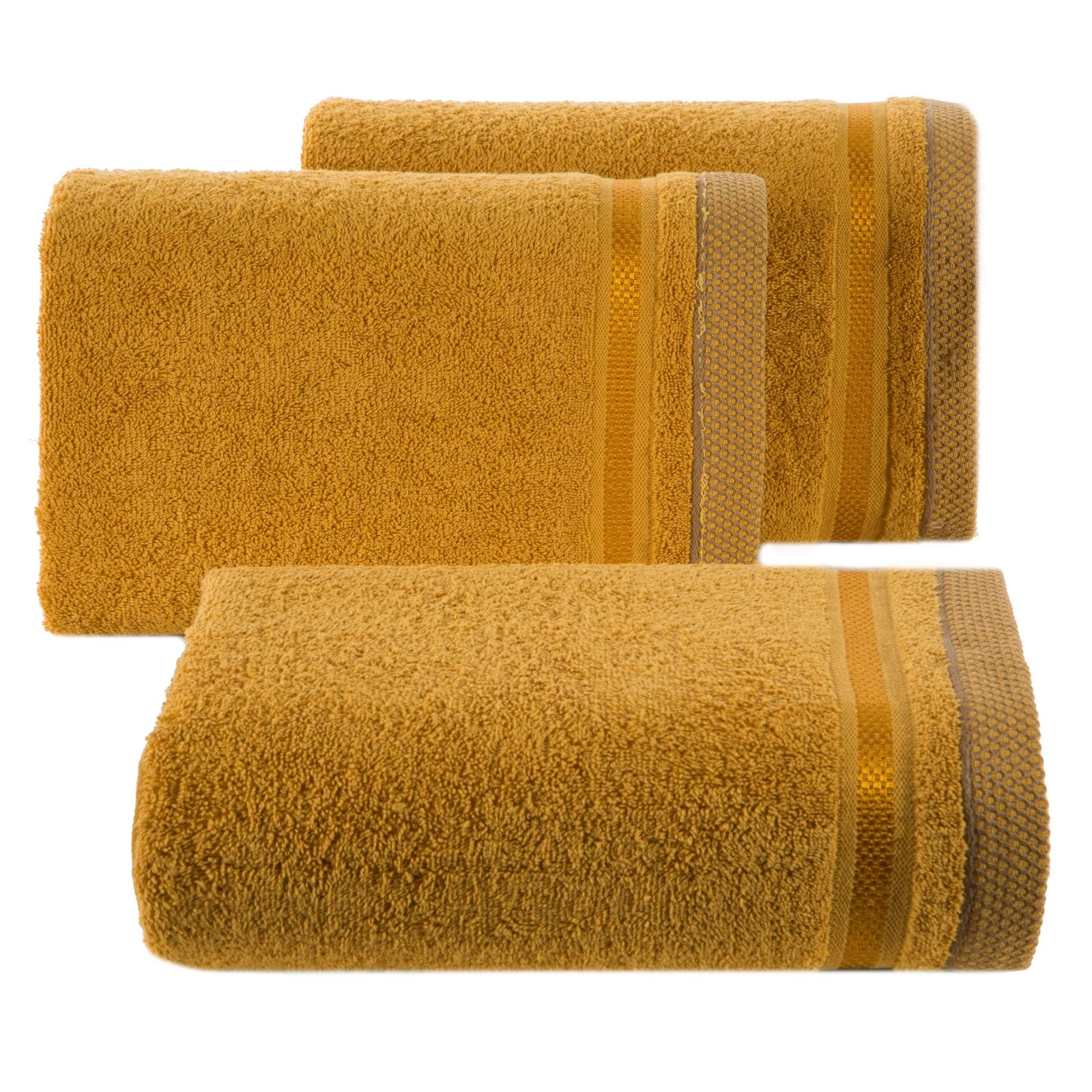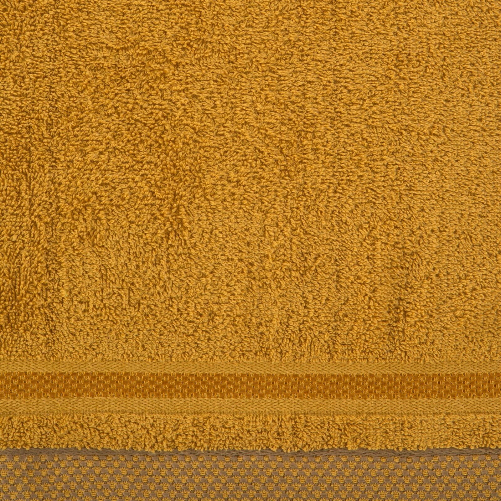 Jednobarwny ręcznik z miękkiej i chłonnej tkaniny bawełnianej o splocie frotte zdobiony kolorową bordiurą w stylu fastrygi. Łatwy w praniu, nie farbuje. szerokość: 30 cm, długość: 50 cm, kolor: ciemnożółty, Gramatura: 500 GSM, Skład: 100% bawełna; część ozdobna: 75% poliester, 25% wiskoza