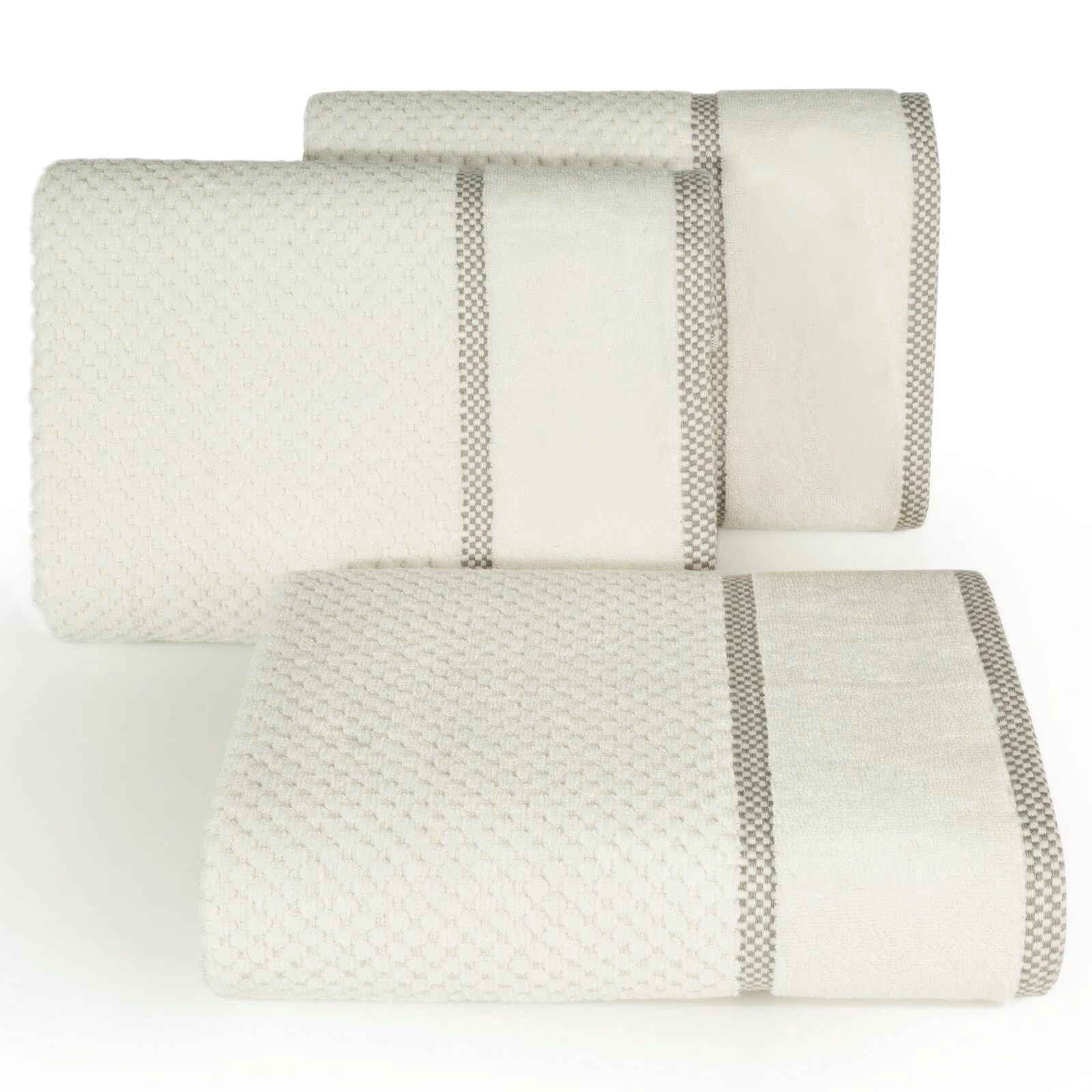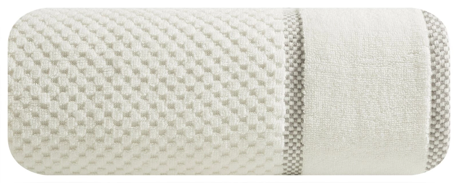 Bardzo chłonny ręcznik z miękkiej bawełny frotte z delikatnym tłoczeniem krateczki i bordiurą o tym samym, wyraźniejszym wzorze. Bardzo chłonny, łatwy w praniu. szerokość: 50 cm, długość: 90 cm, kolor: kremowy, Gramatura: 540 GSM, Skład: 100% bawełna; część ozdobna: 69% bawełna, 31% poliester