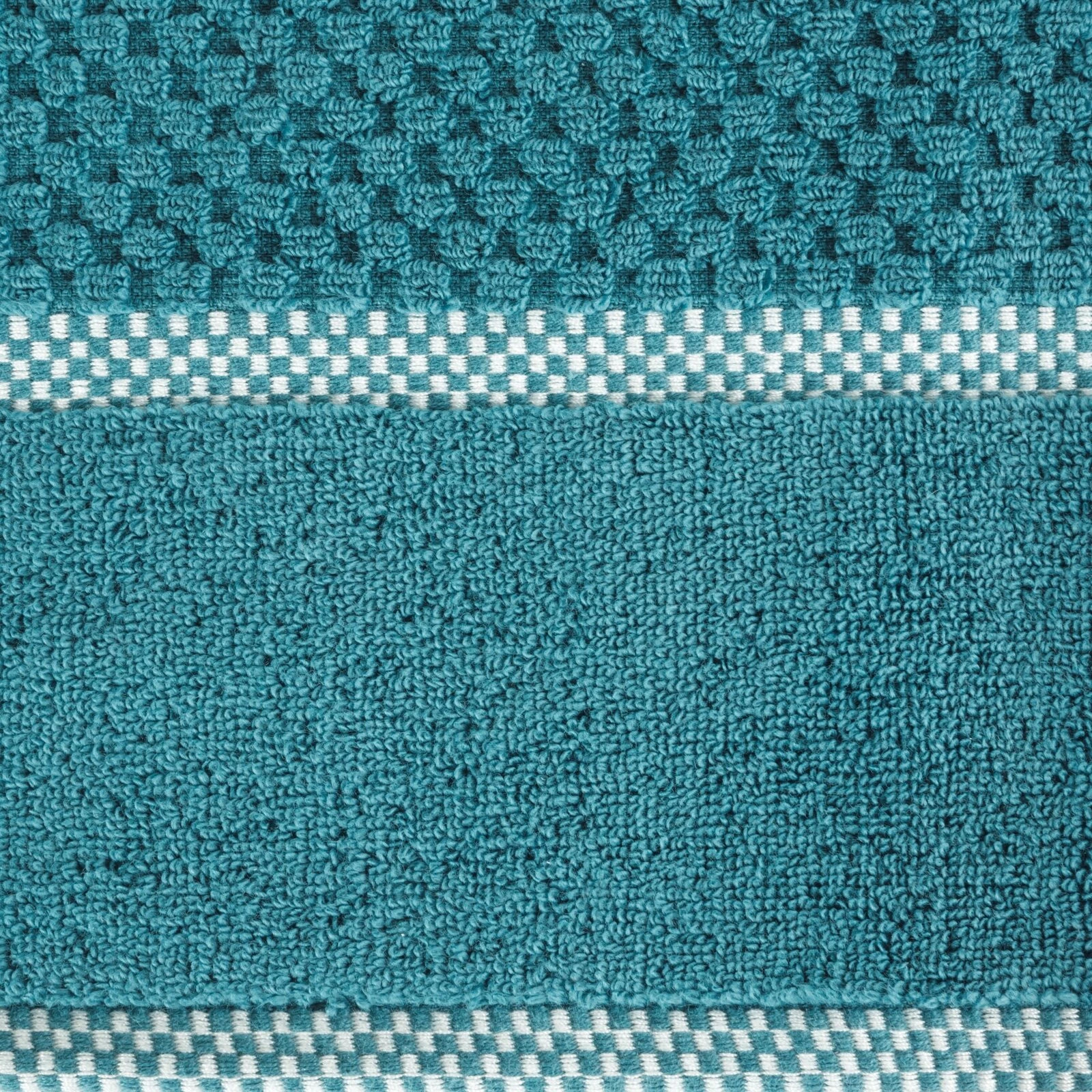 Bardzo chłonny ręcznik z miękkiej bawełny frotte z delikatnym tłoczeniem krateczki i bordiurą o tym samym, wyraźniejszym wzorze. Bardzo chłonny, łatwy w praniu. szerokość: 70 cm, długość: 140 cm, kolor: turkusowy, Gramatura: 540 GSM, Skład: 100% bawełna; część ozdobna: 69% bawełna, 31% poliester