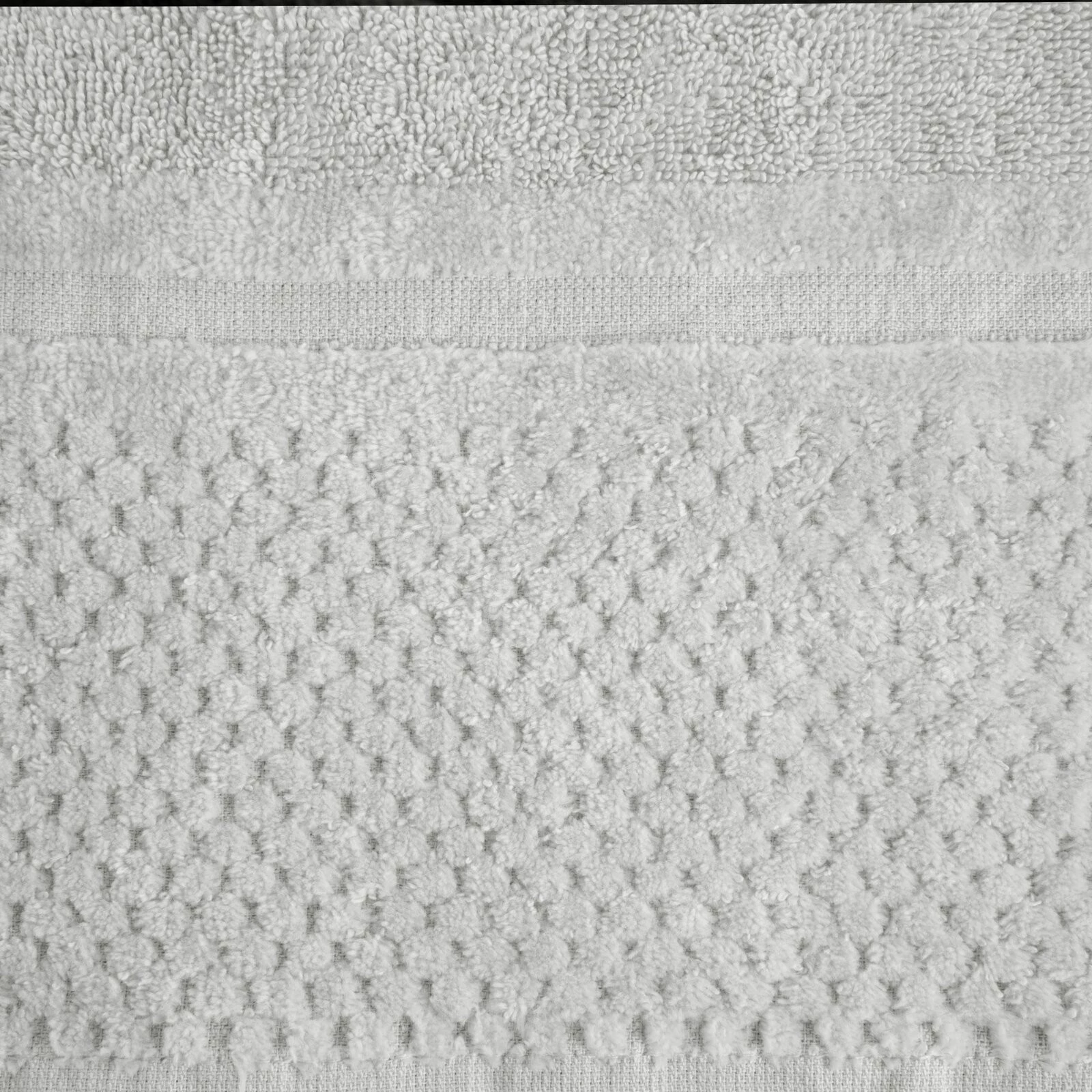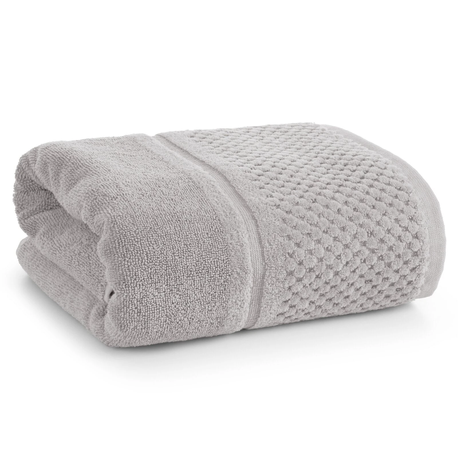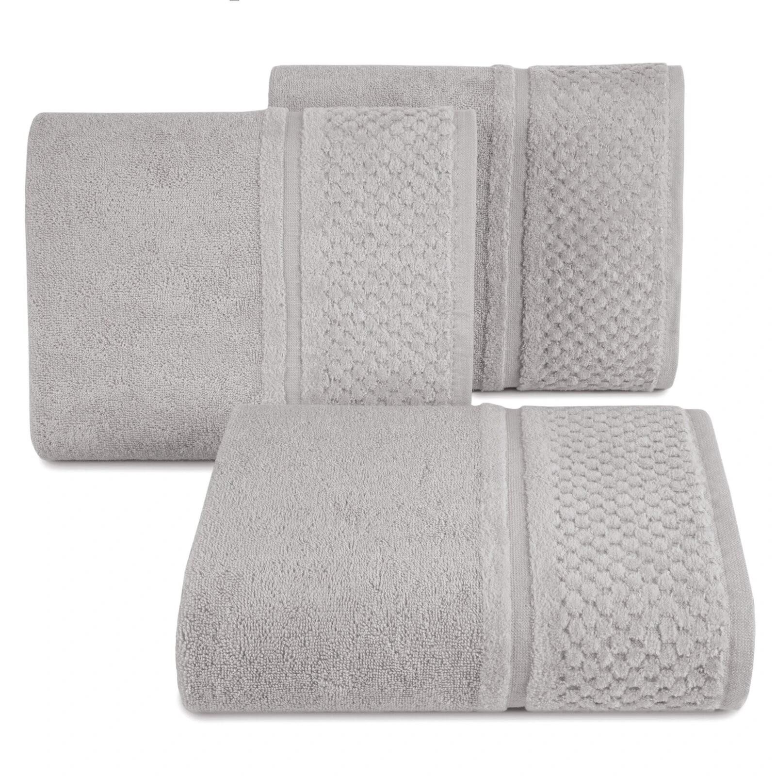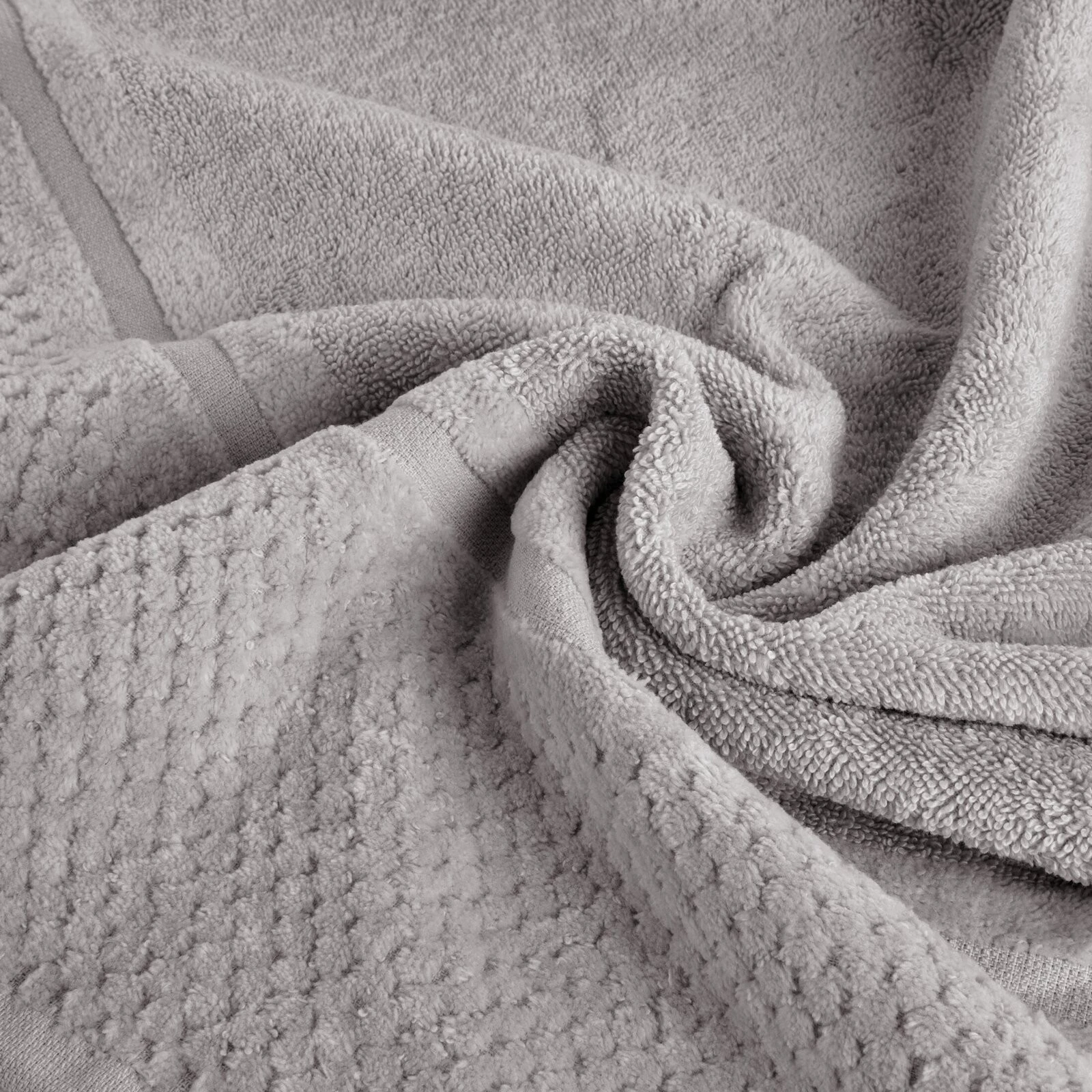 Klasyczny ręcznik kąpielowy z chłonnej tkaniny bawełnianej o splocie frotte. Minimalistyczna bordiura z weluru z dodatkiem lśniącej, metalicznej nici. szerokość: 70 cm, długość: 140 cm, kolor: stalowy, Gramatura: 550 GSM, Skład: 100% bawełna