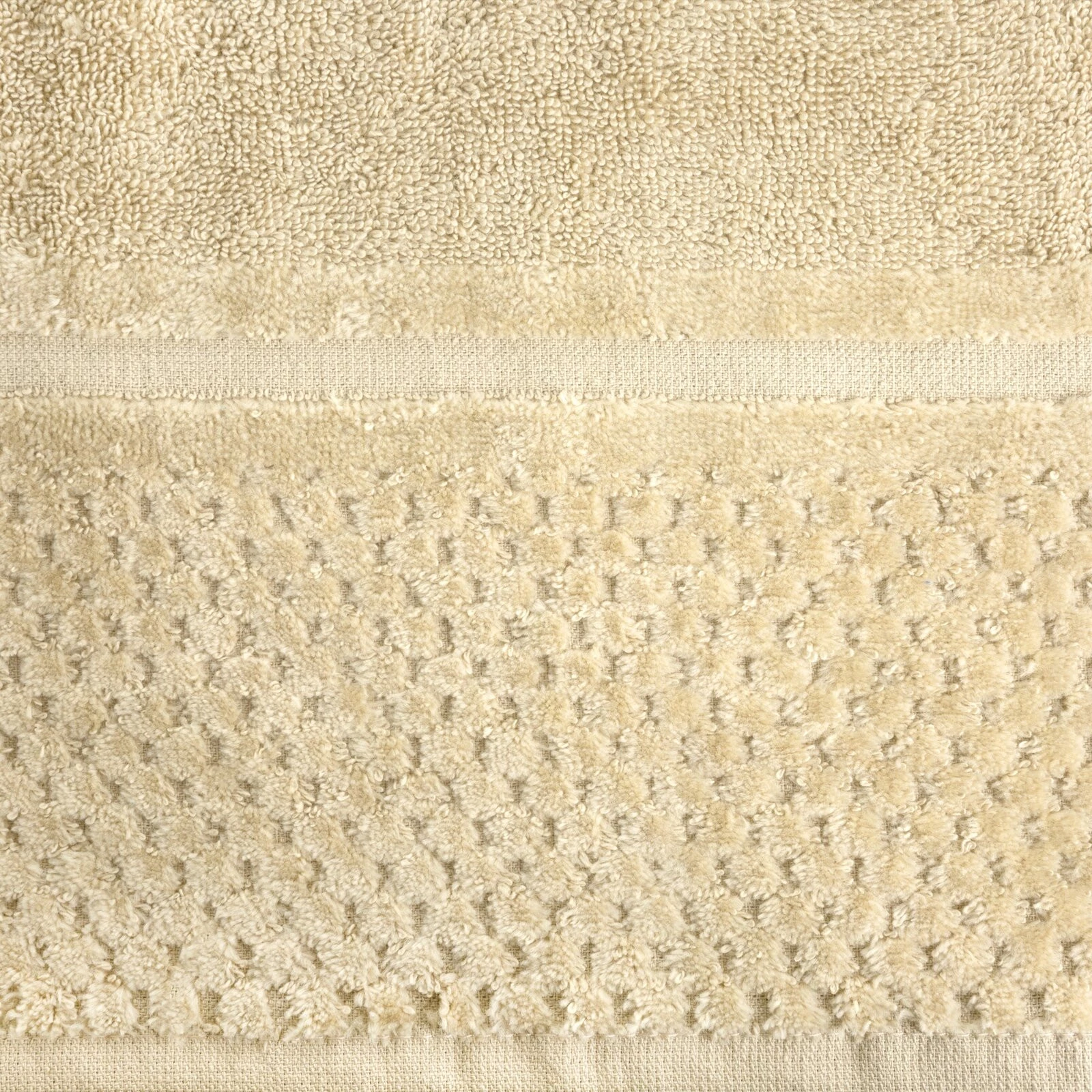 Klasyczny ręcznik kąpielowy z chłonnej tkaniny bawełnianej o splocie frotte. Minimalistyczna bordiura z weluru z dodatkiem lśniącej, metalicznej nici. szerokość: 70 cm, długość: 140 cm, kolor: beżowy, Gramatura: 550 GSM, Skład: 100% bawełna