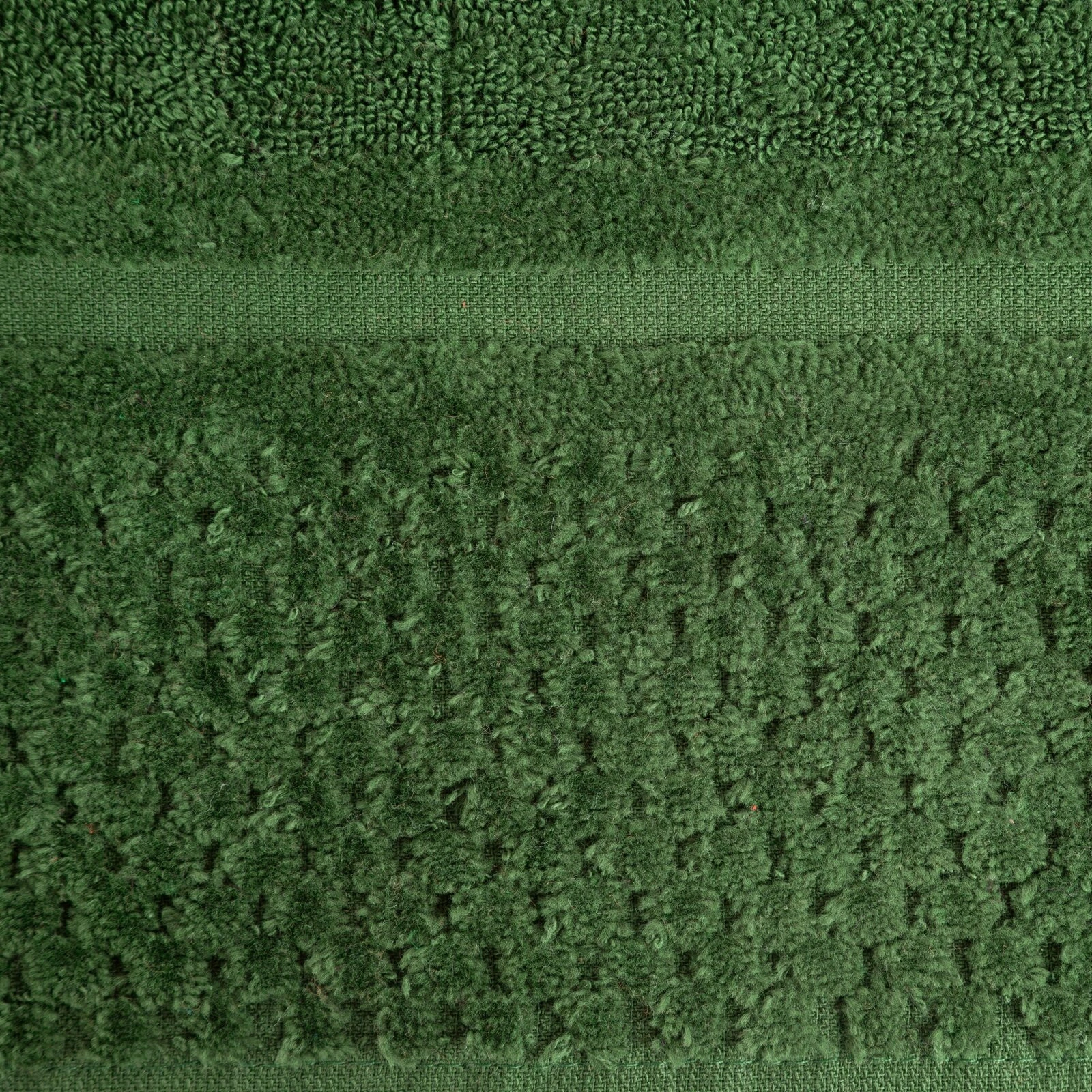 Klasyczny ręcznik kąpielowy z chłonnej tkaniny bawełnianej o splocie frotte. Minimalistyczna bordiura z weluru z dodatkiem lśniącej, metalicznej nici. szerokość: 70 cm, długość: 140 cm, kolor: butelkowy zielony, Gramatura: 550 GSM, Skład: 100% bawełna
