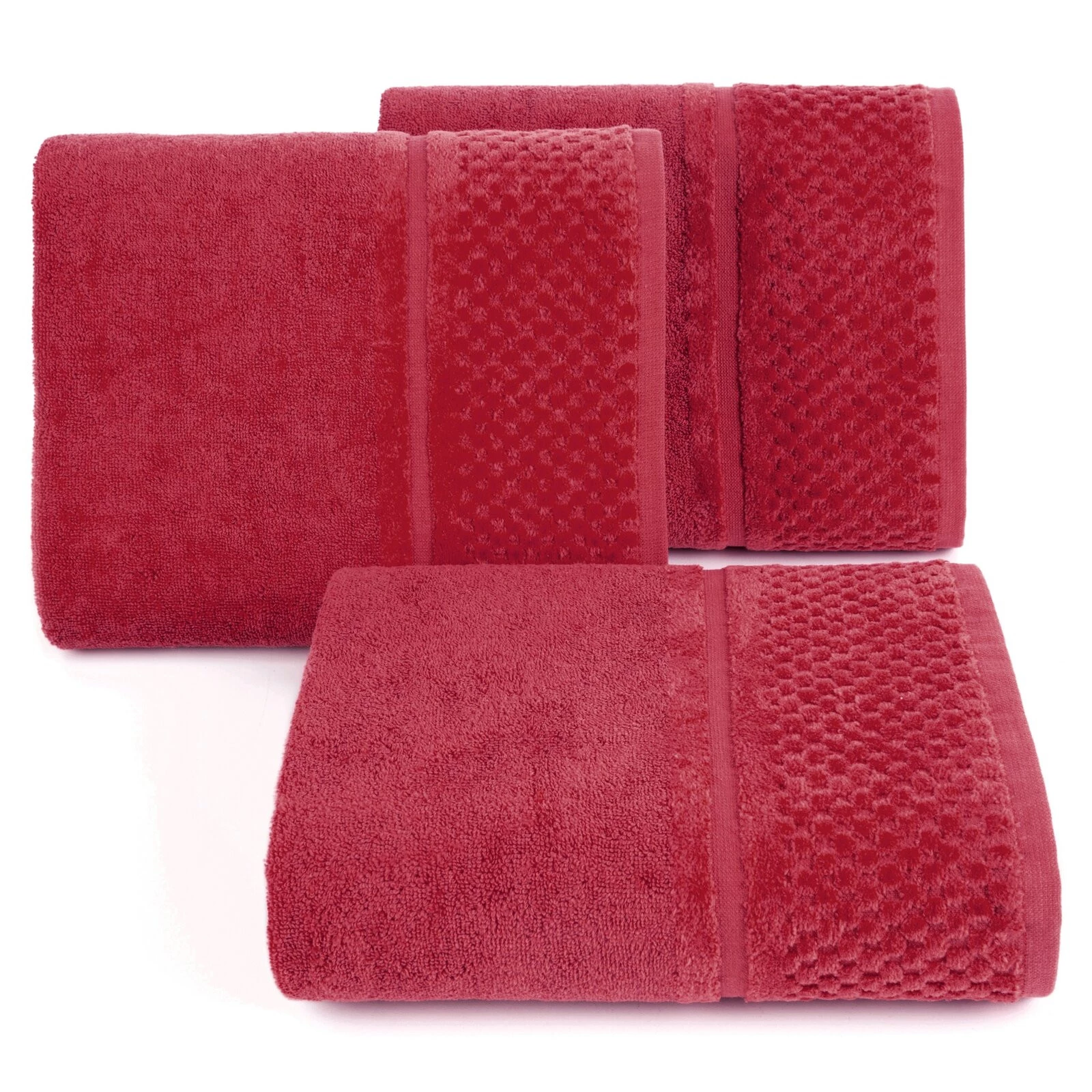 Klasyczny ręcznik kąpielowy z chłonnej tkaniny bawełnianej o splocie frotte. Minimalistyczna bordiura z weluru z dodatkiem lśniącej, metalicznej nici. szerokość: 70 cm, długość: 140 cm, kolor: czerwony, Gramatura: 550 GSM, Skład: 100% bawełna