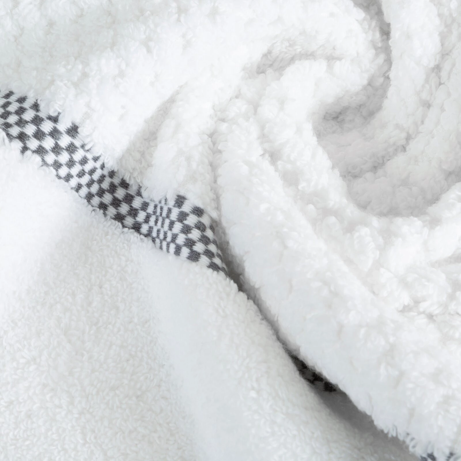 Bardzo chłonny ręcznik z miękkiej bawełny frotte z delikatnym tłoczeniem krateczki i bordiurą o tym samym, wyraźniejszym wzorze. Bardzo chłonny, łatwy w praniu. szerokość: 50 cm, długość: 90 cm, kolor: biały, Gramatura: 540 GSM, Skład: 100% bawełna; część ozdobna: 69% bawełna, 31% poliester