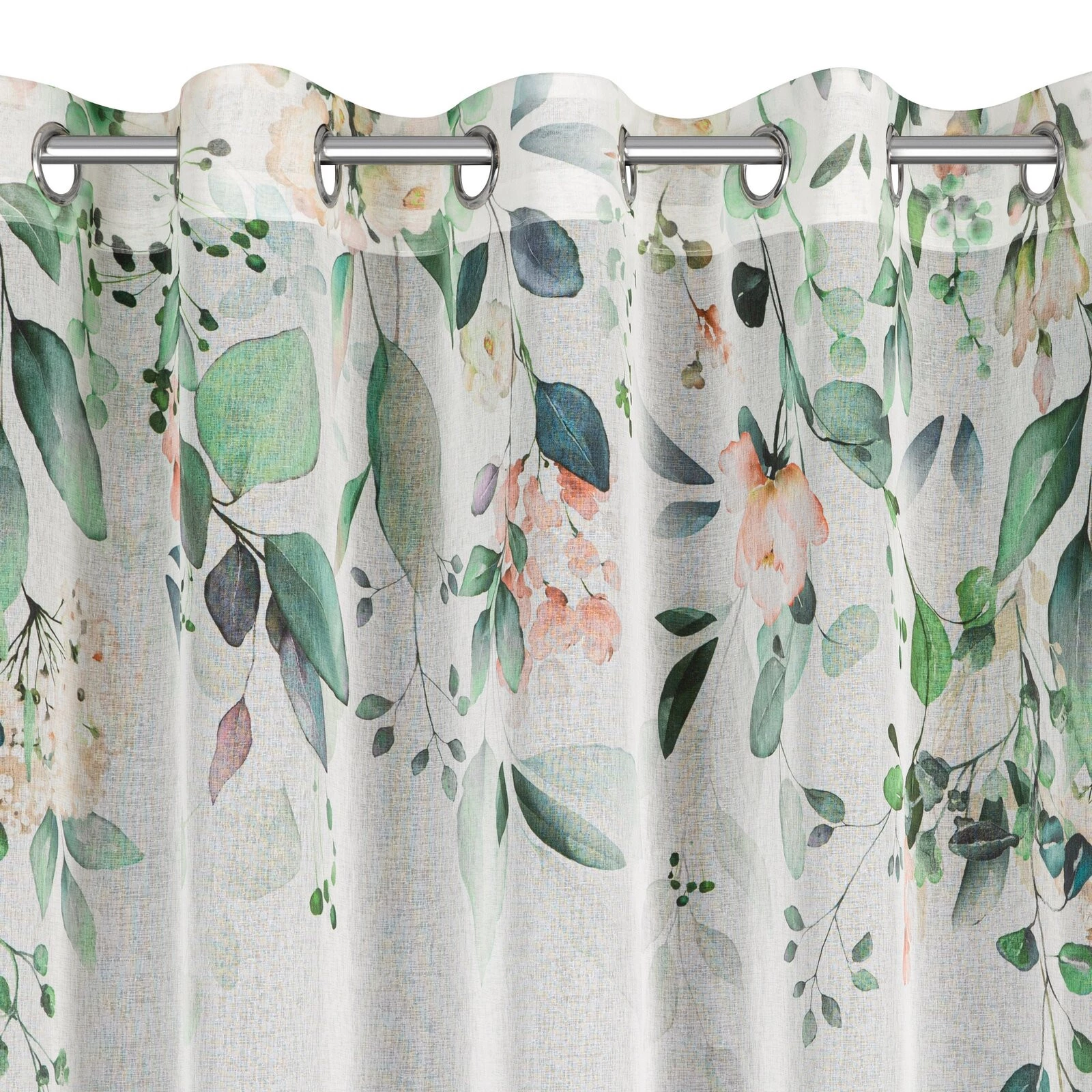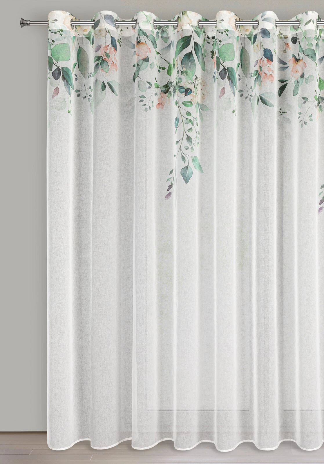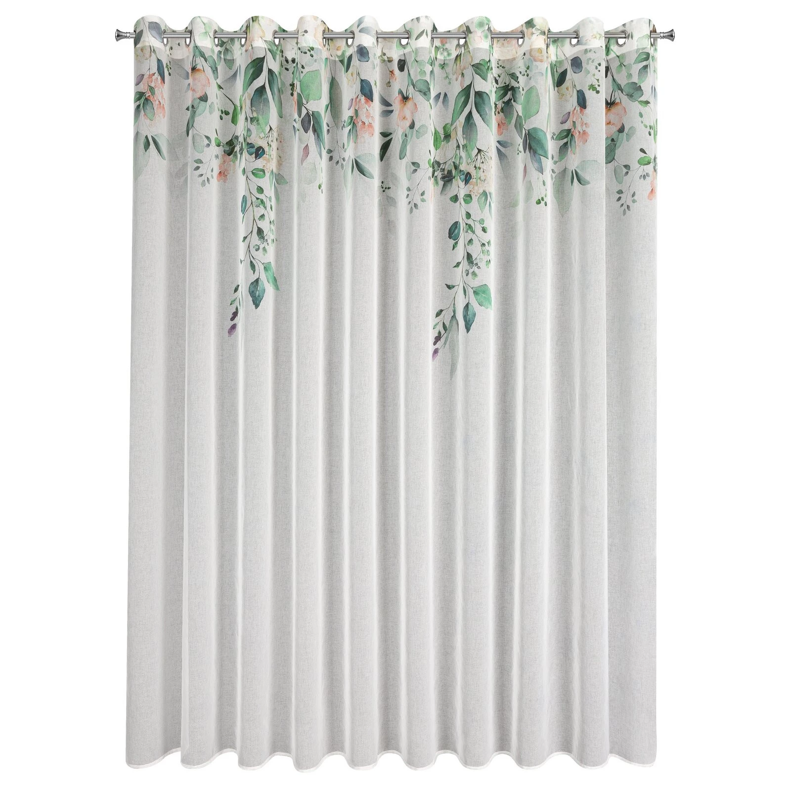 Zasłona gotowa z kwiatowym nadrukiem w górnej części szerokość: 350 cm, długość: 250 cm, kolor: biały, Gramatura: 70 GSM, Skład: 100% poliester