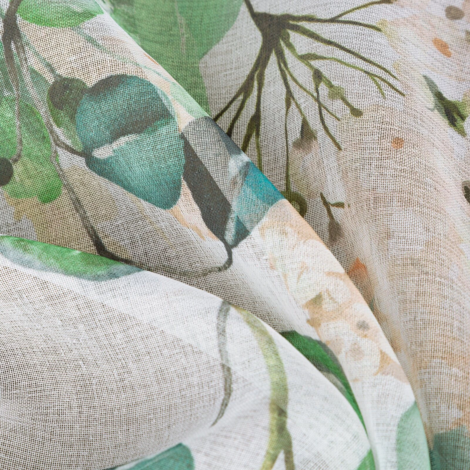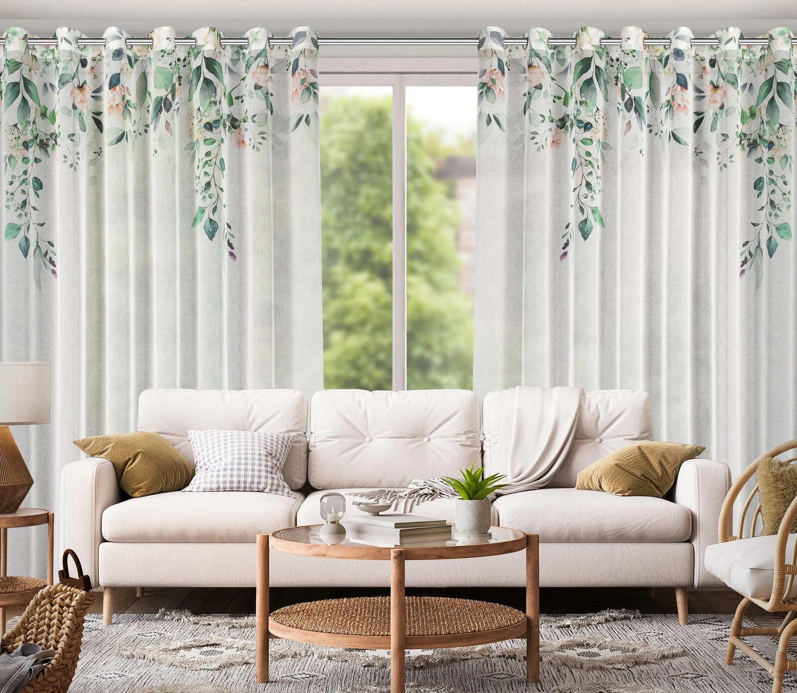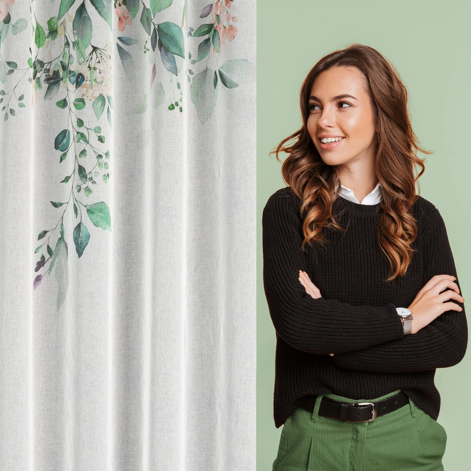 Zasłona gotowa z kwiatowym nadrukiem w górnej części szerokość: 350 cm, długość: 250 cm, kolor: biały, Gramatura: 70 GSM, Skład: 100% poliester