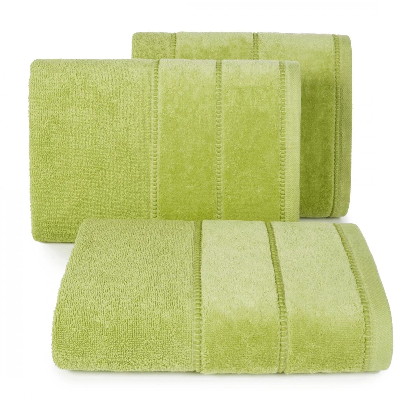 Ręcznik z ozdobną welurową bordiurą w pasy szerokość: 70 cm, długość: 140 cm, kolor: oliwkowy, Gramatura: 500 GSM, Skład: 100% bawełna; część ozdobna: 60% bawełna, 40% poliester