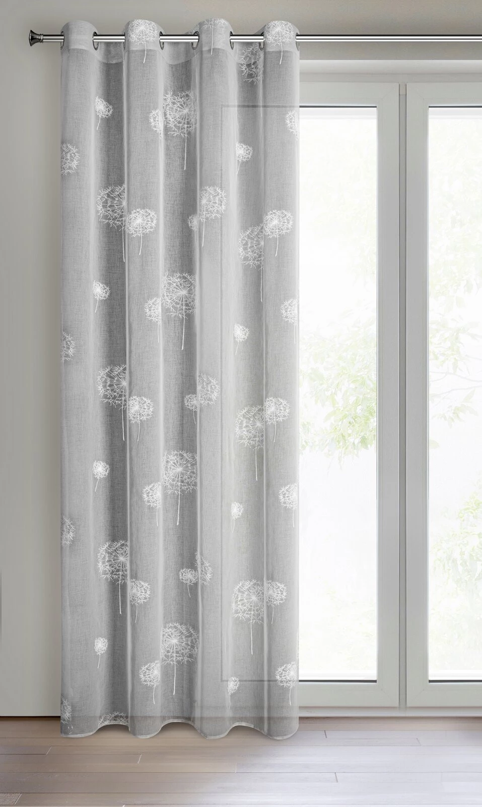 - Firana gotowa zdobiona gumowanym nadrukiem szerokość: 140 cm, długość: 250 cm, kolor: stalowy, Gramatura: 75 GSM, Skład: 100% poliester