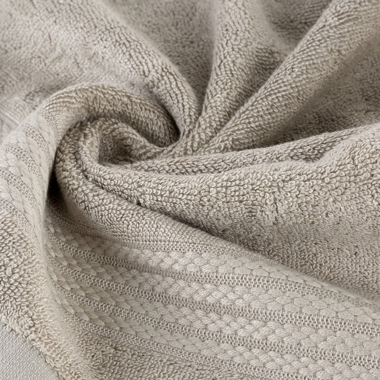 Jednobarwny ręcznik z miękkiej i chłonnej tkaniny bawełnianej o splocie frotte zdobiony kolorową bordiurą w stylu fastrygi. Łatwy w praniu, nie farbuje. szerokość: 30 cm, długość: 50 cm, kolor: beżowy, Gramatura: 550 GSM, Skład: 70% modal, 30% bawełna