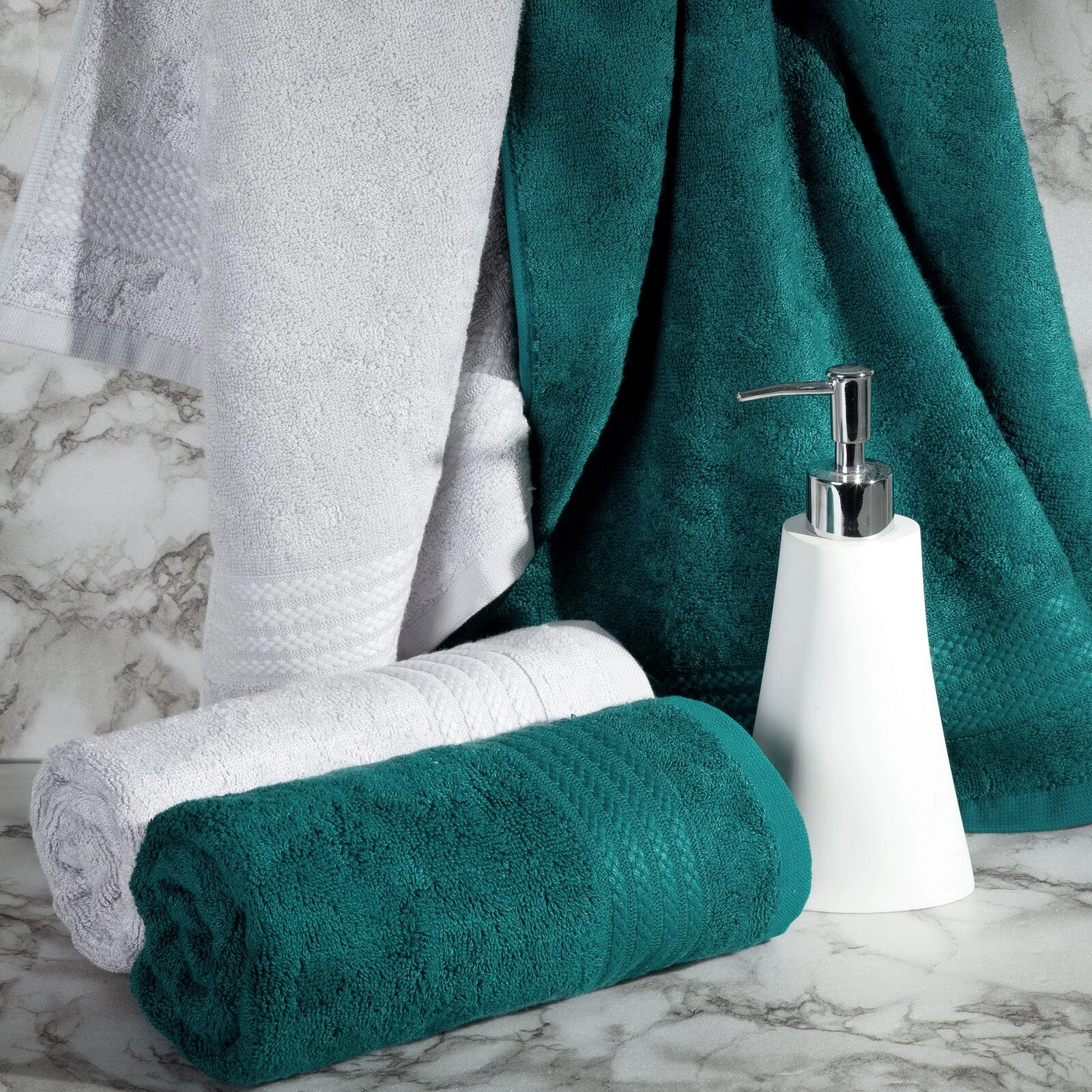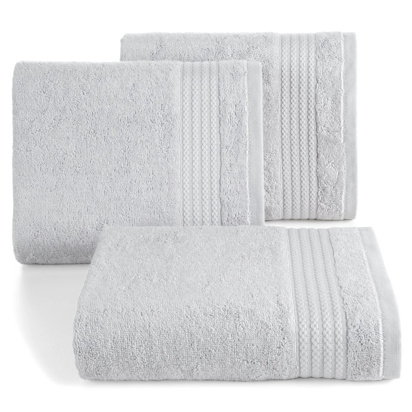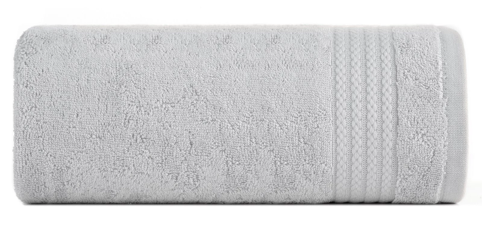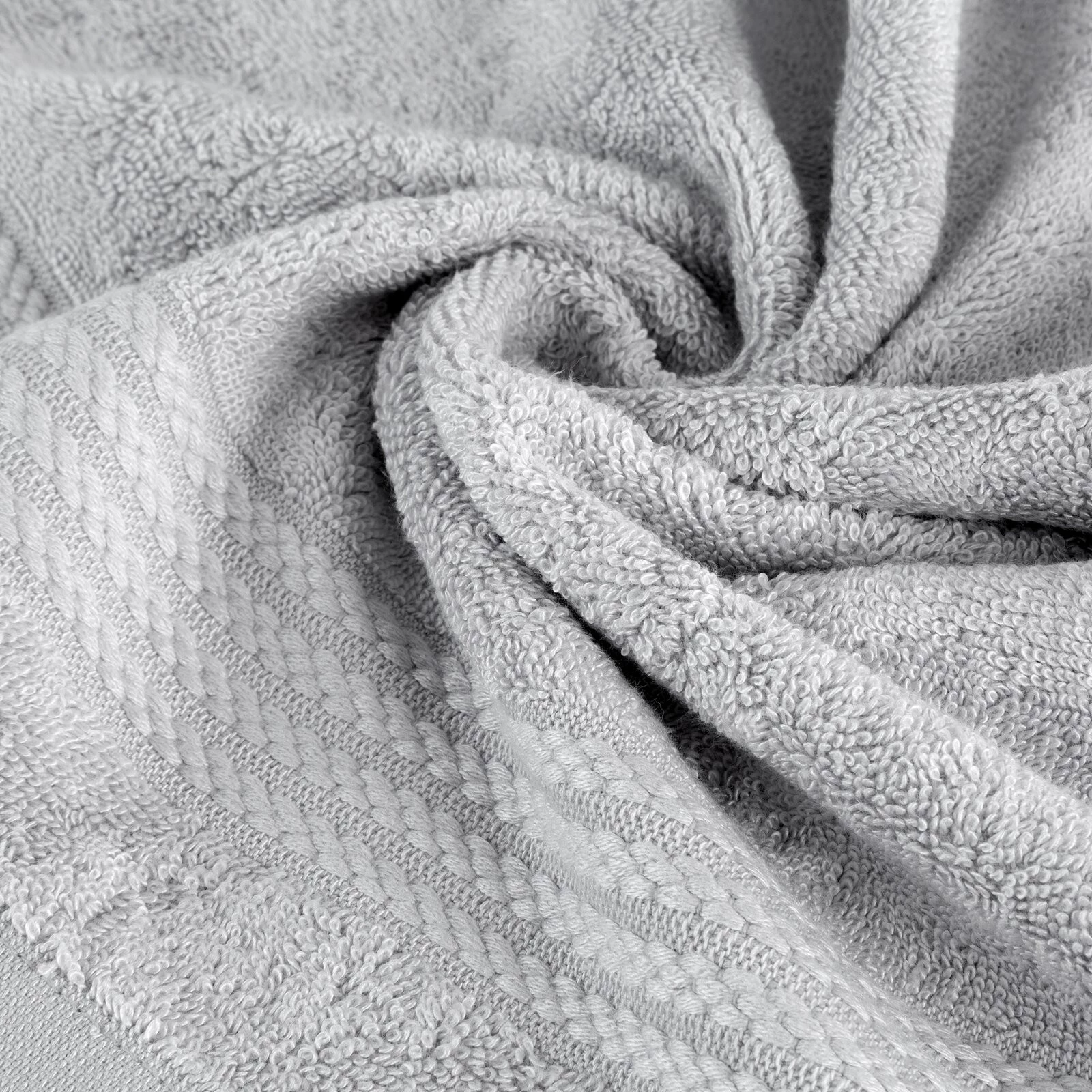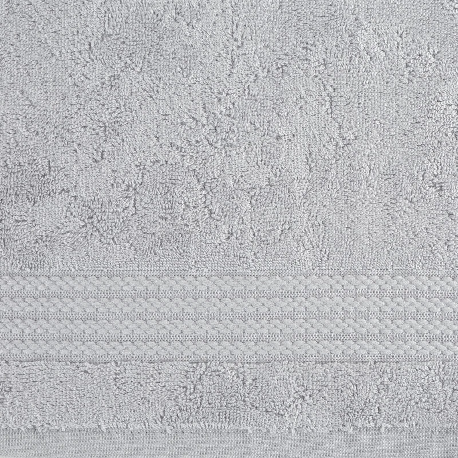Jednobarwny ręcznik z miękkiej i chłonnej tkaniny bawełnianej o splocie frotte zdobiony kolorową bordiurą w stylu fastrygi. Łatwy w praniu, nie farbuje. szerokość: 30 cm, długość: 50 cm, kolor: jasnoszary, Gramatura: 550 GSM, Skład: 70% modal, 30% bawełna