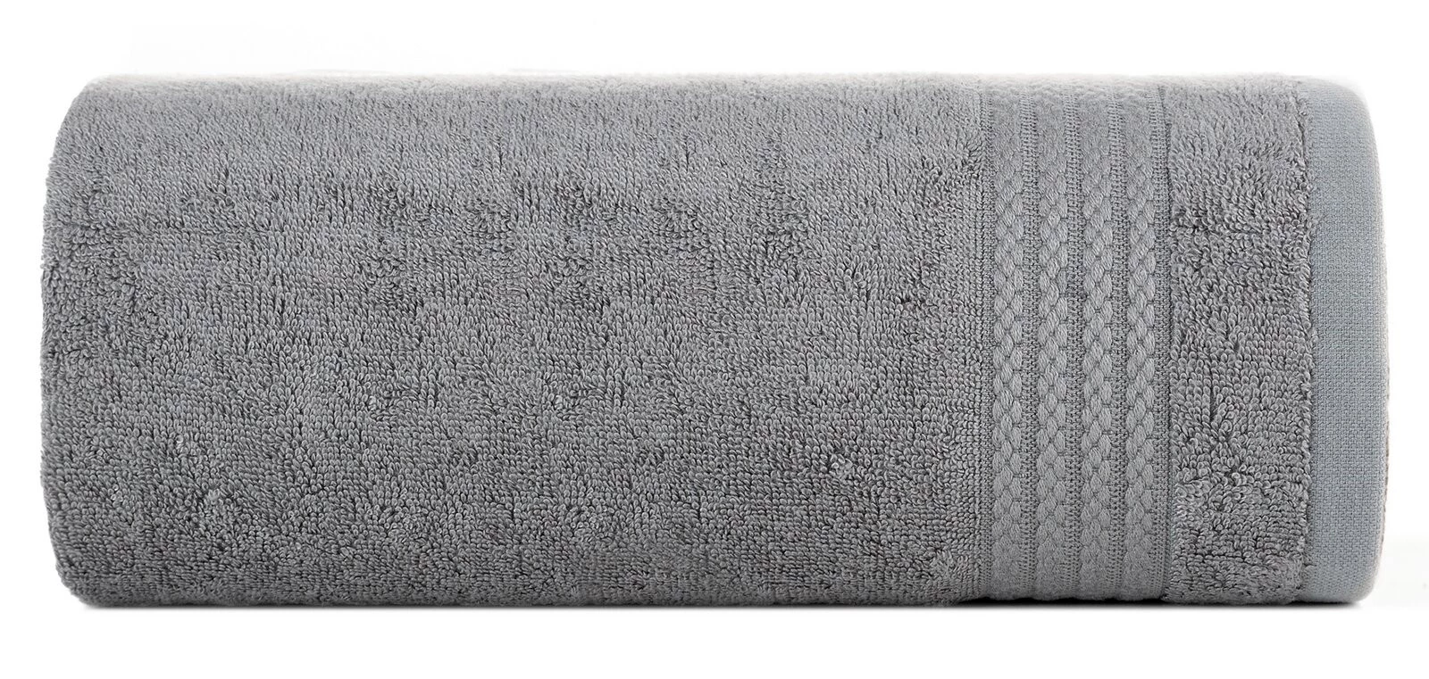 Jednobarwny ręcznik z miękkiej i chłonnej tkaniny bawełnianej o splocie frotte zdobiony kolorową bordiurą w stylu fastrygi. Łatwy w praniu, nie farbuje. szerokość: 30 cm, długość: 50 cm, kolor: stalowy, Gramatura: 550 GSM, Skład: 70% modal, 30% bawełna