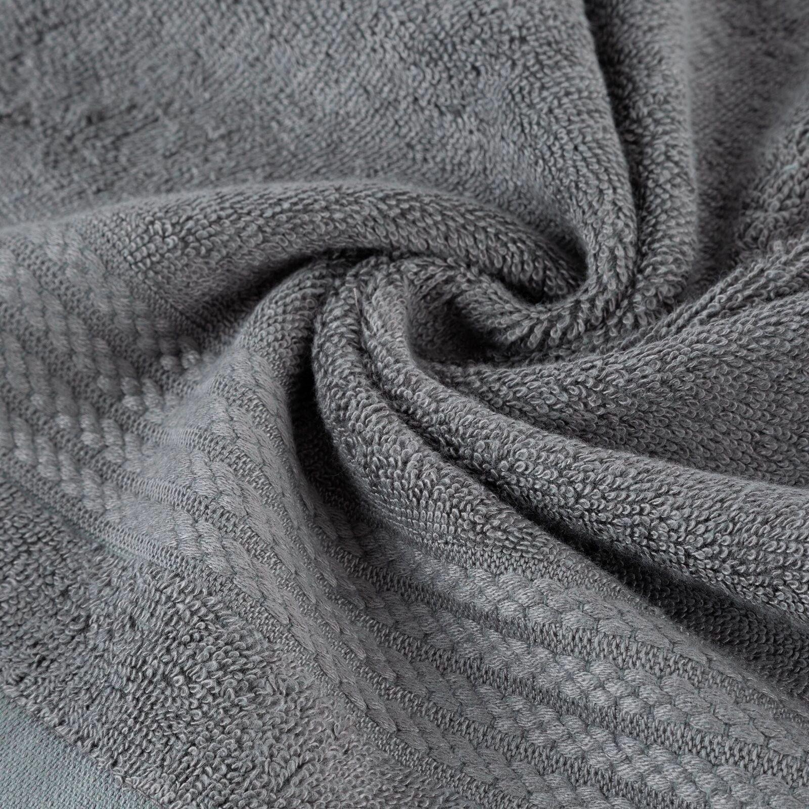 Jednobarwny ręcznik z miękkiej i chłonnej tkaniny bawełnianej o splocie frotte zdobiony kolorową bordiurą w stylu fastrygi. Łatwy w praniu, nie farbuje. szerokość: 50 cm, długość: 90 cm, kolor: stalowy, Gramatura: 550 GSM, Skład: 70% modal, 30% bawełna