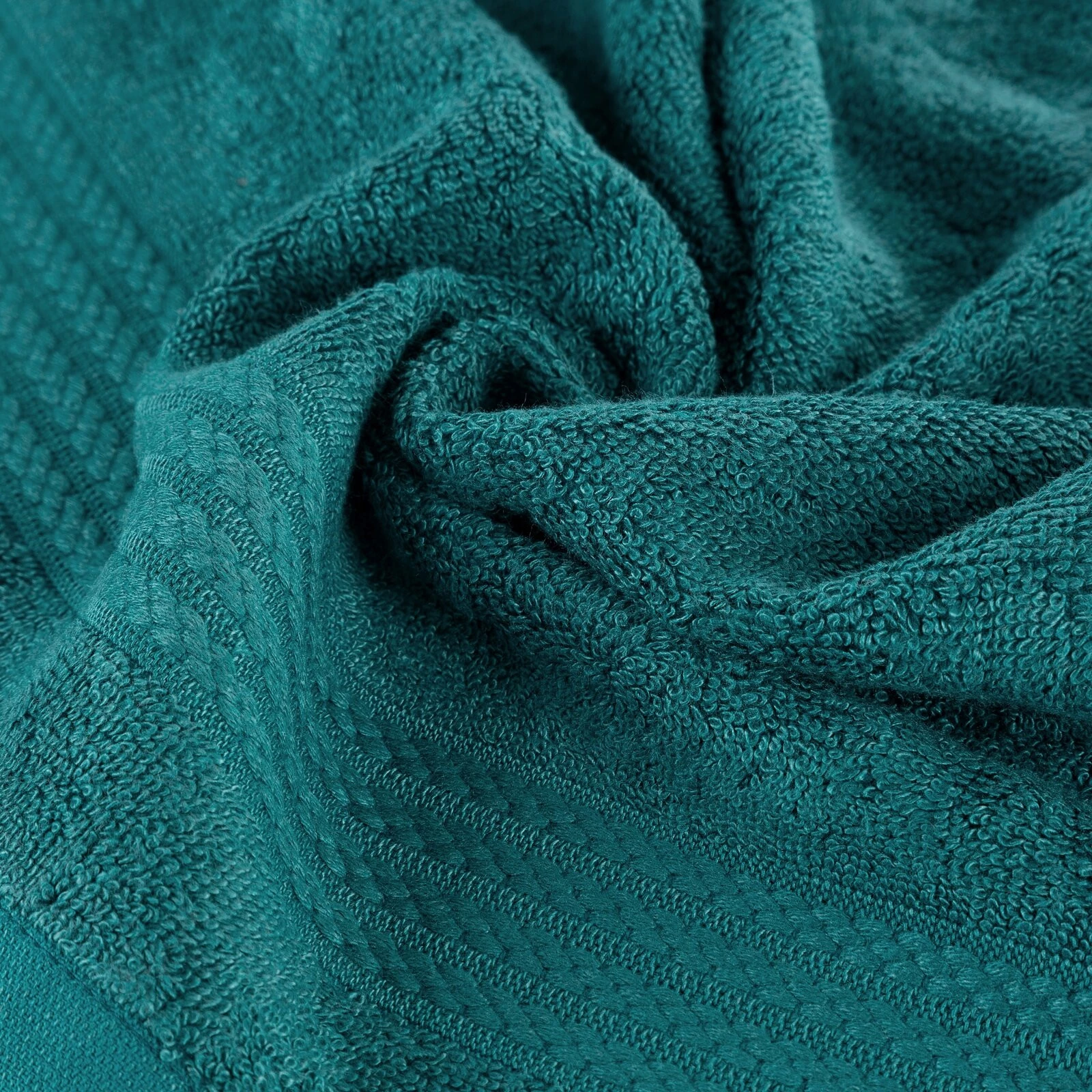 Jednobarwny ręcznik z miękkiej i chłonnej tkaniny bawełnianej o splocie frotte zdobiony kolorową bordiurą w stylu fastrygi. Łatwy w praniu, nie farbuje. szerokość: 30 cm, długość: 50 cm, kolor: ciemnoturkusowy, Gramatura: 550 GSM, Skład: 70% modal, 30% bawełna