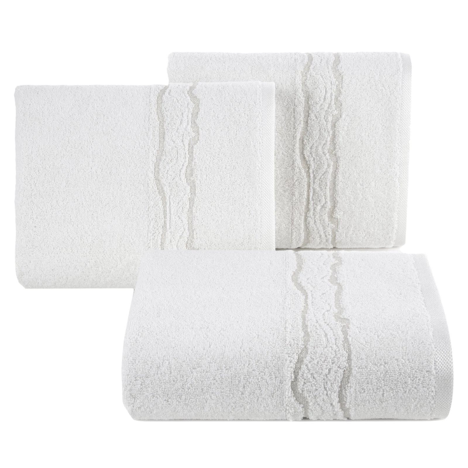 Ręcznik bawełniany z ozdobną bordiurą i błyszczącą nicią szerokość: 70 cm, długość: 140 cm, kolor: biały, Gramatura: 500 GSM, Skład: 100% bawełna; część ozdobna: 50% poliester, 50% wiskoza